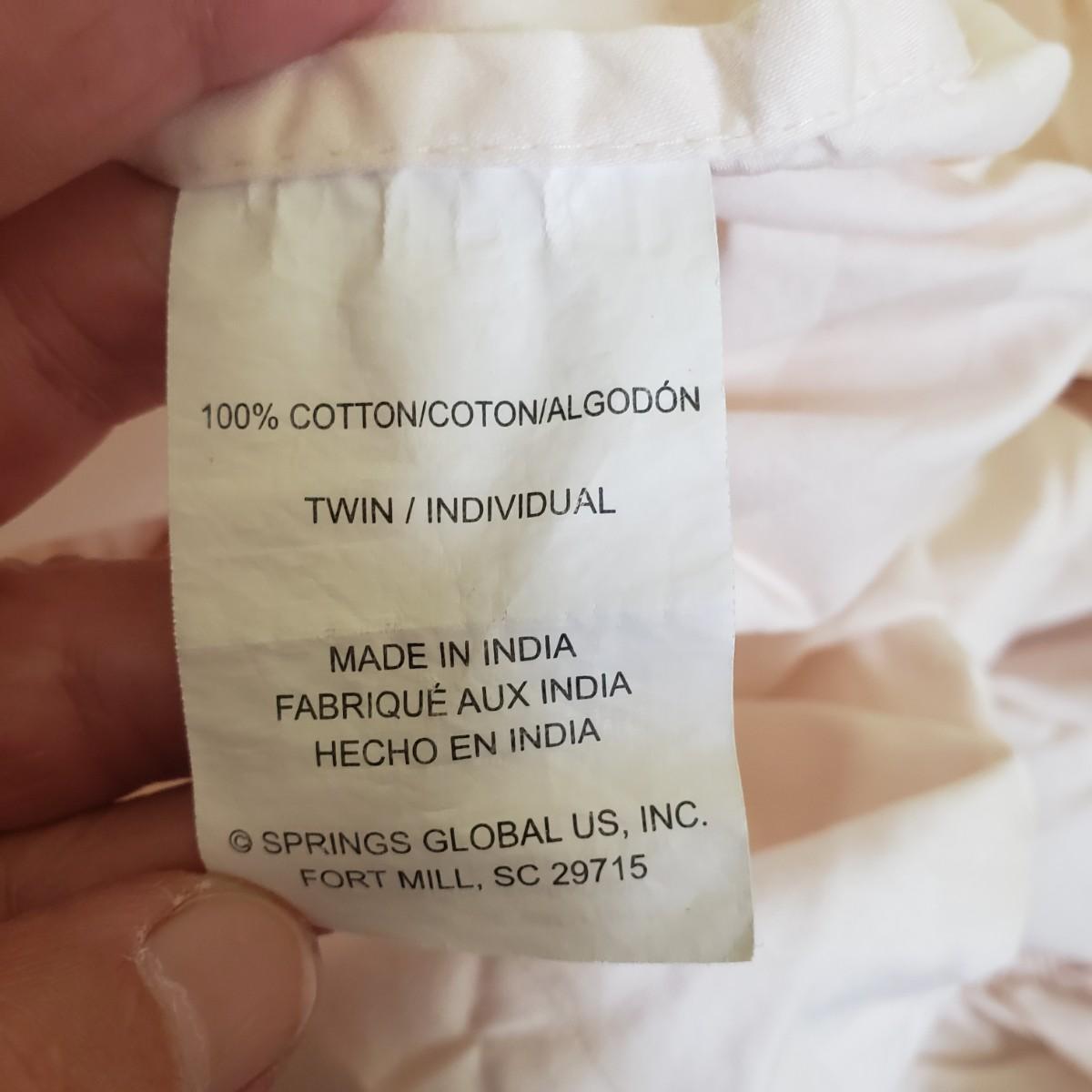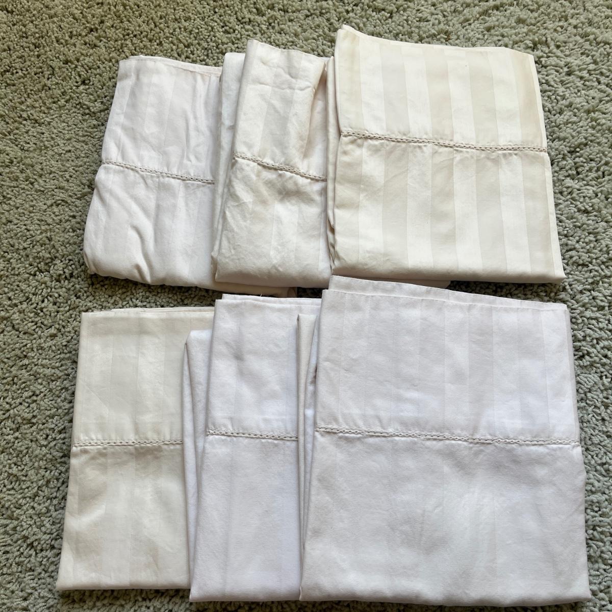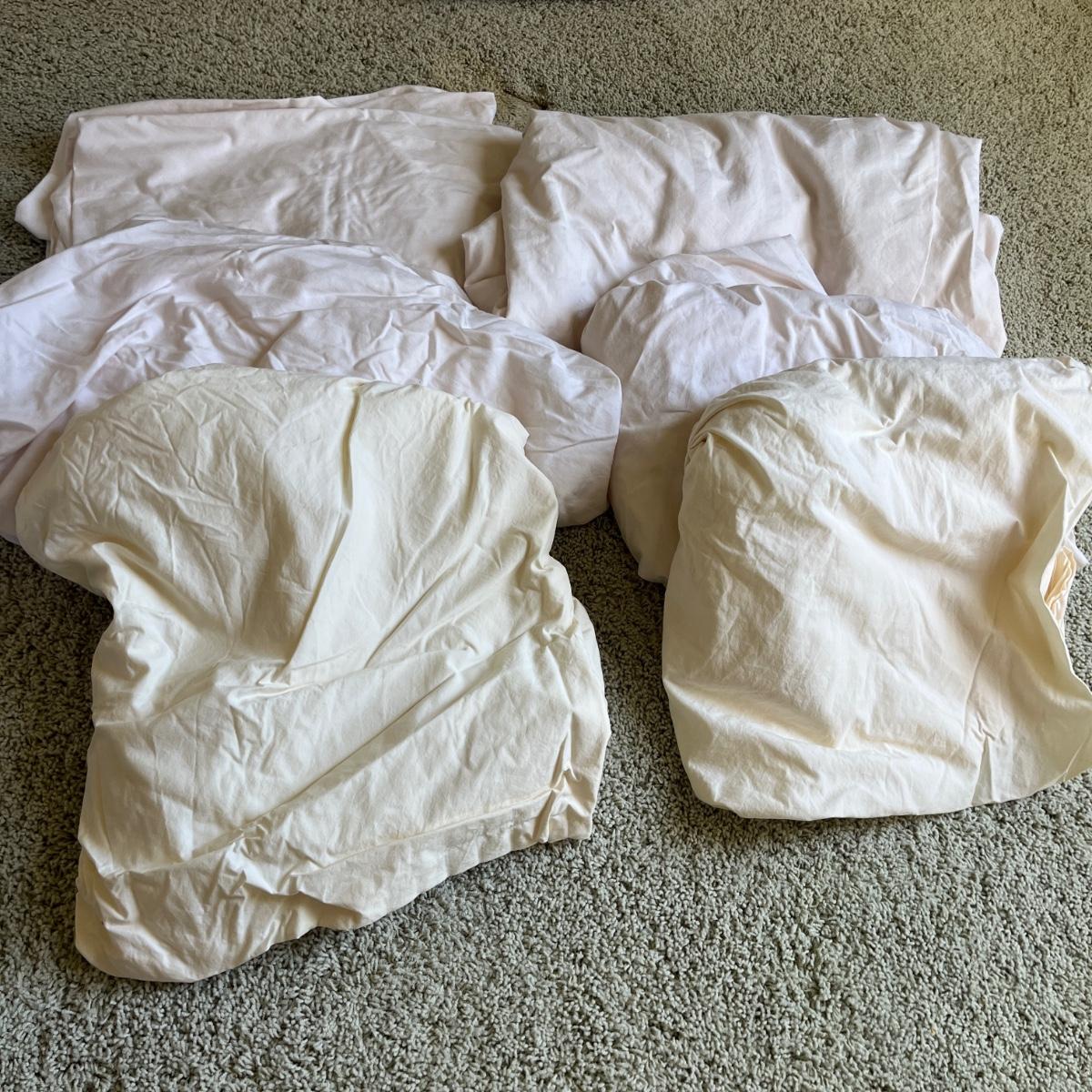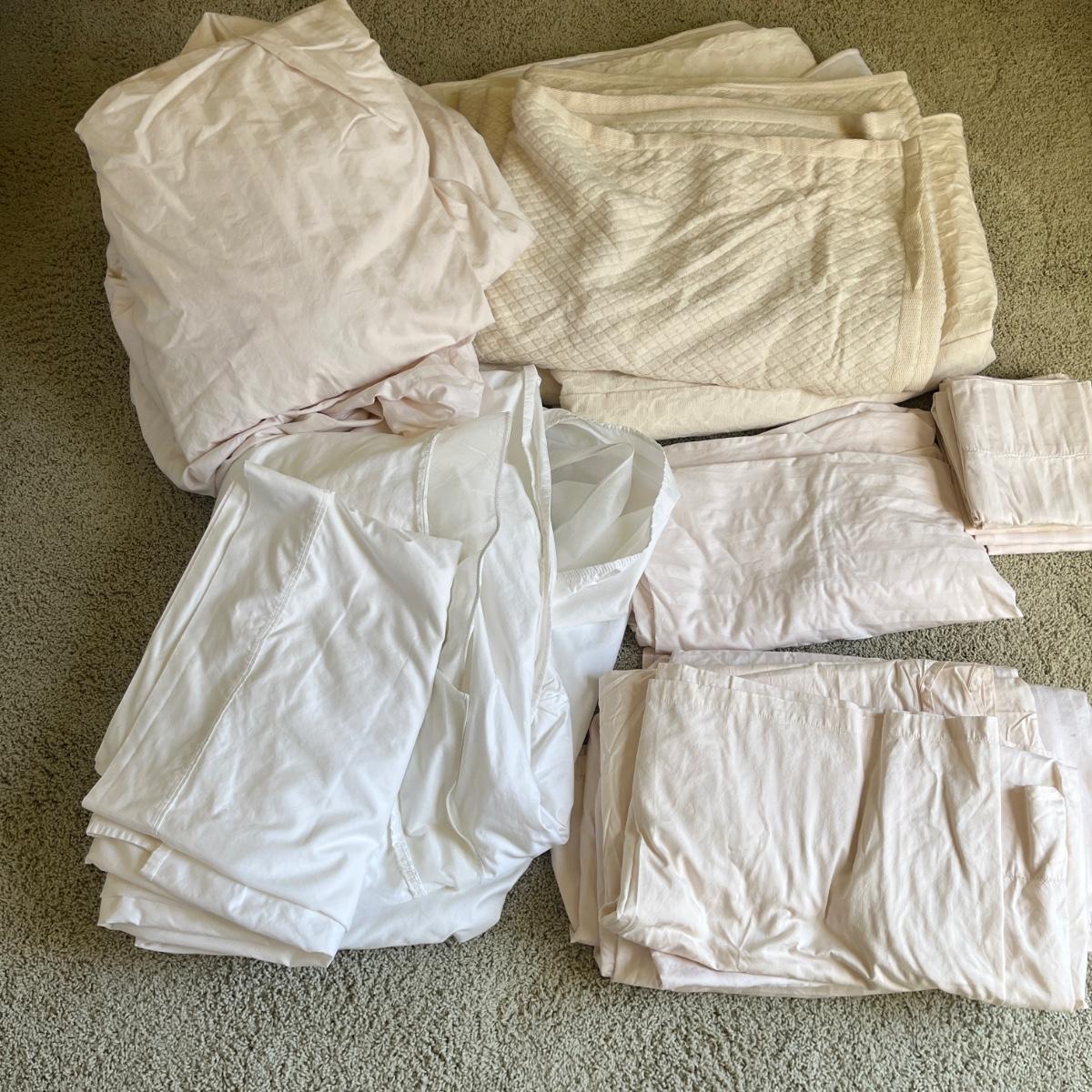 Lot includes twin sized blanket, bedspread, six pillowcases, six flat sheets five fitted sheets and a mattress cover. The light yellow sheets are by Ralph Lauren. Bed not included but available in another lot in the auction.