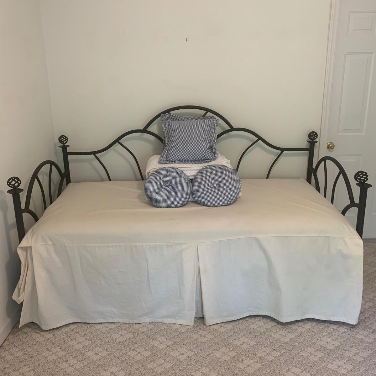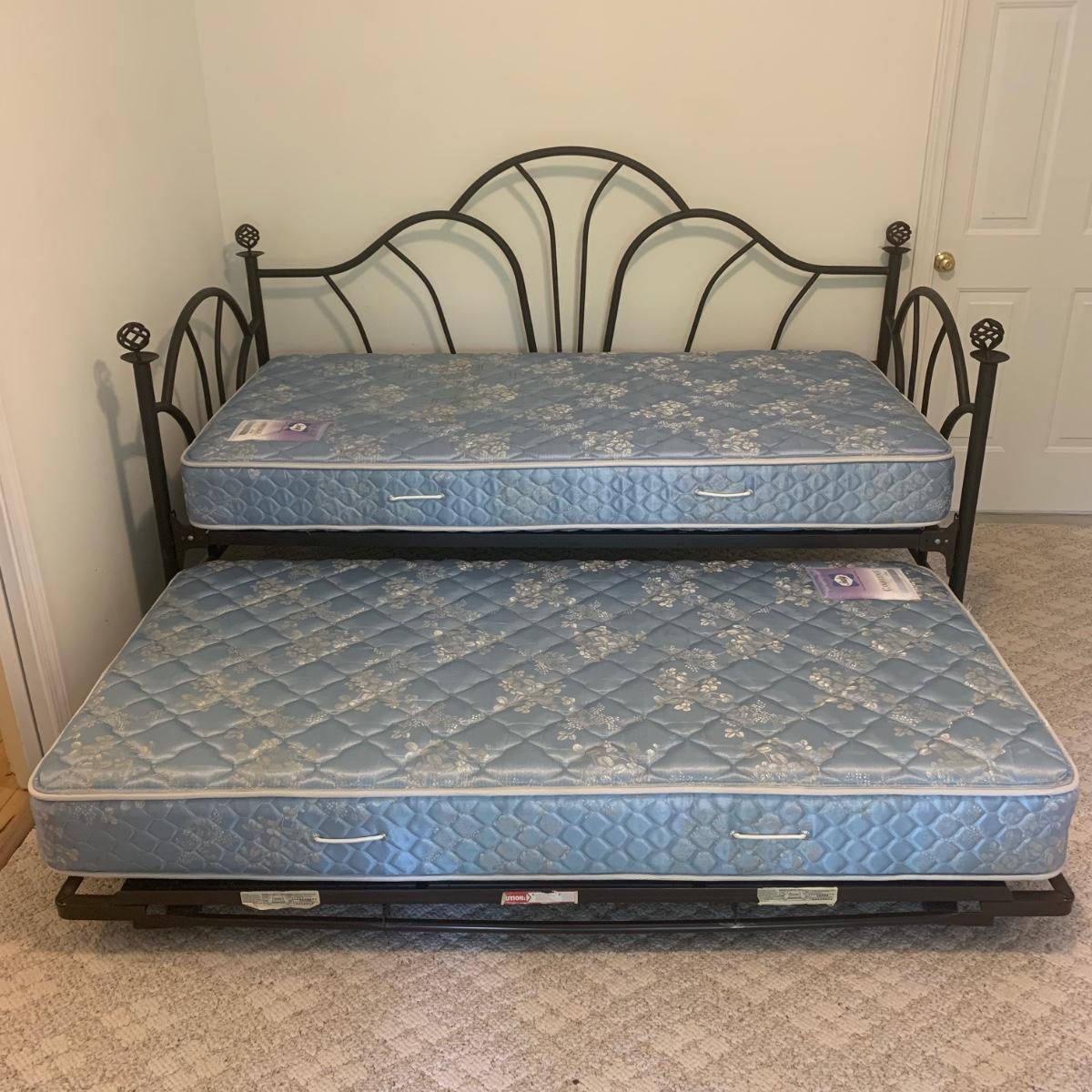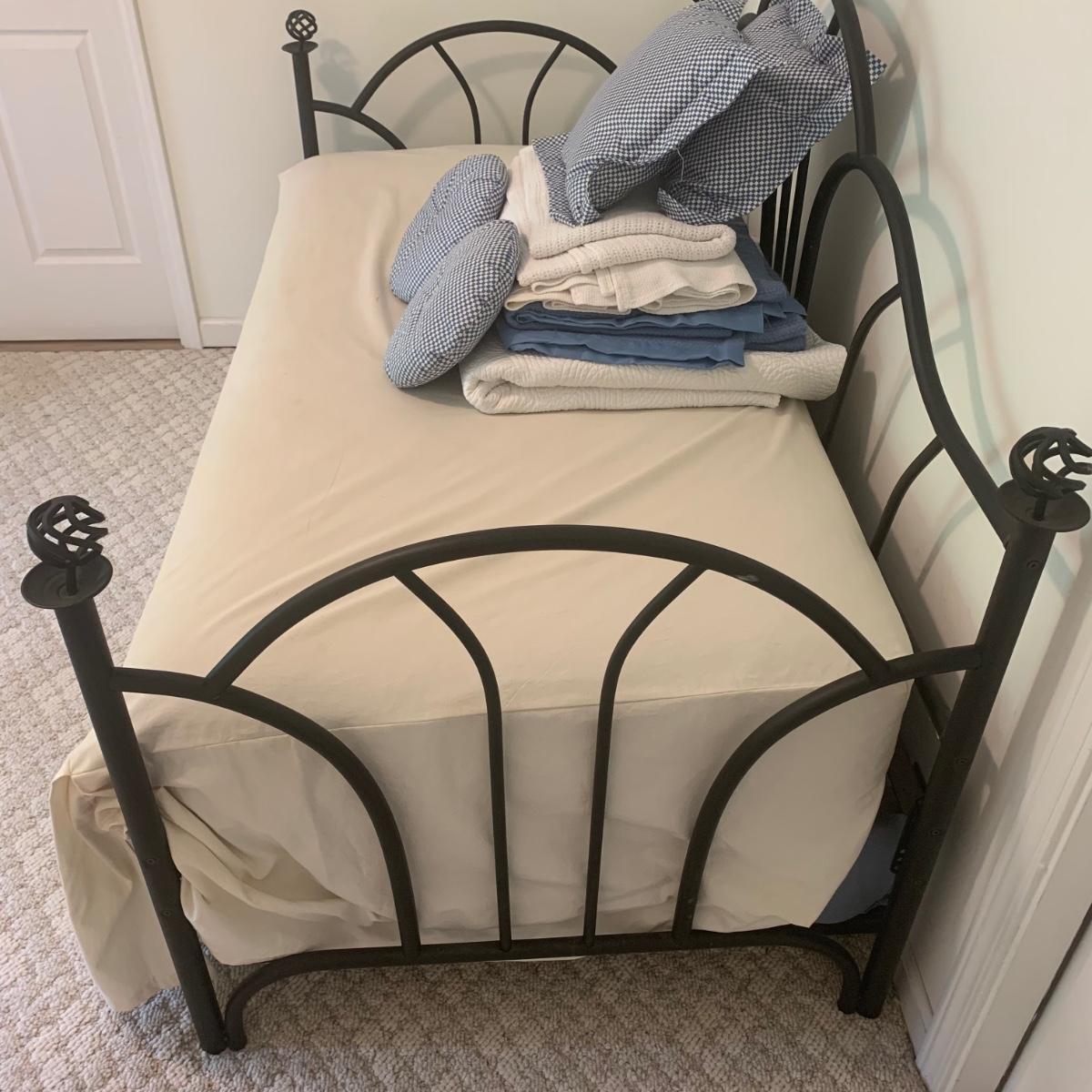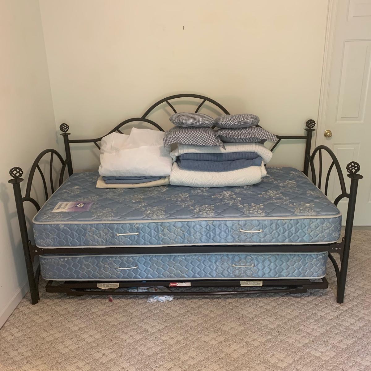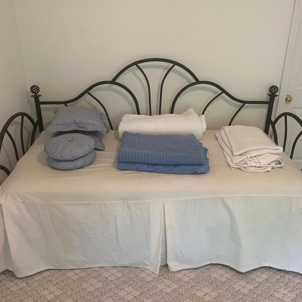 Twin metal bed frame with trundle and various bed linens. Linens included are two blue twin blankets, one mattress cover, one fitted twin sheet, one flat twin sheet, one white blanket, one fitted bed skirt, one white twin comforter, and four throw pillows. Please see photos for more details. Bed frame measures, 80” x 39” x 47”H.