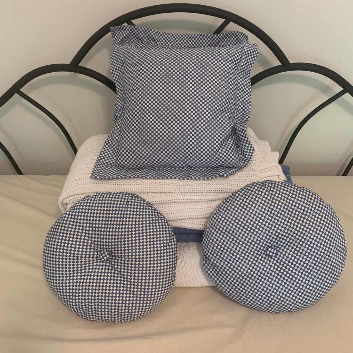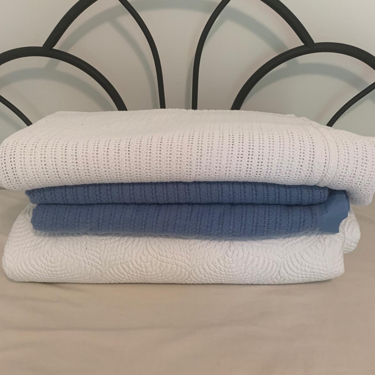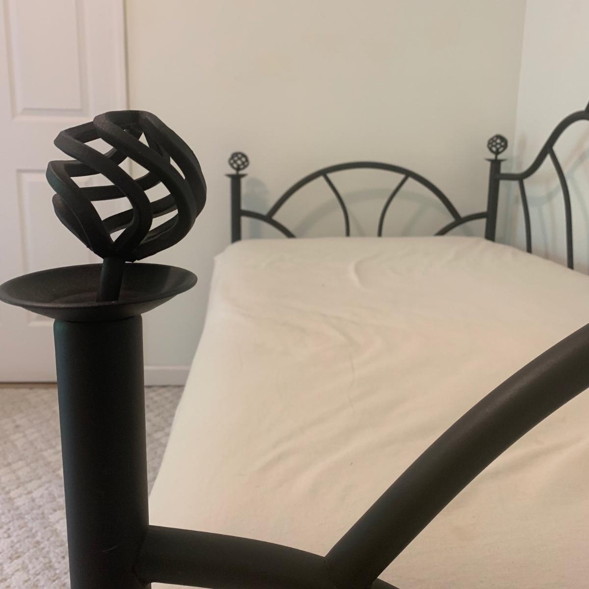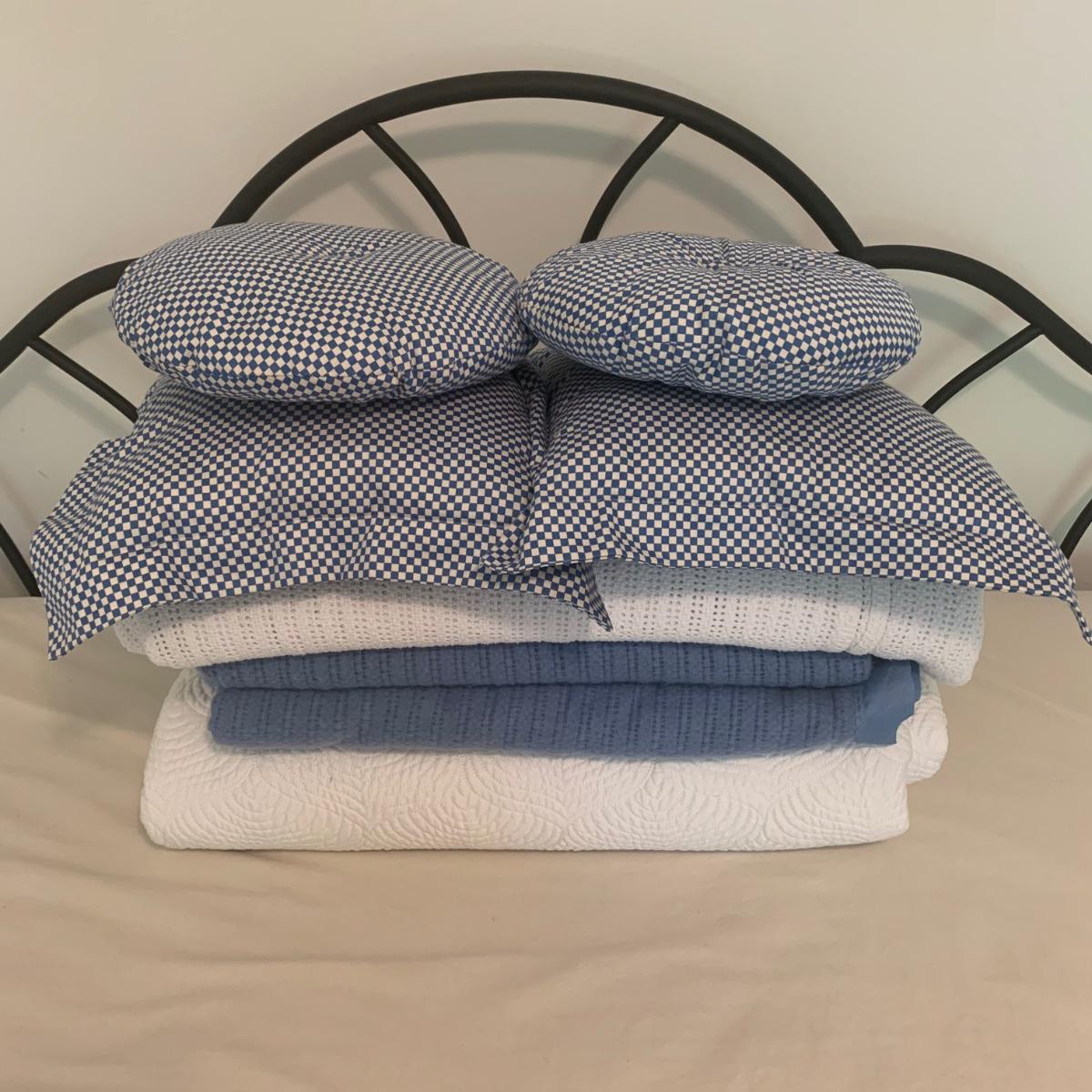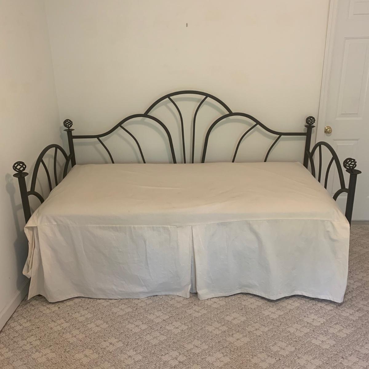 Twin metal bed frame with trundle and various bed linens. Linens included are two blue twin blankets, one mattress cover, one fitted twin sheet, one flat twin sheet, one white blanket, one fitted bed skirt, one white twin comforter, and four throw pillows. Please see photos for more details. Bed frame measures, 80” x 39” x 47”H.
