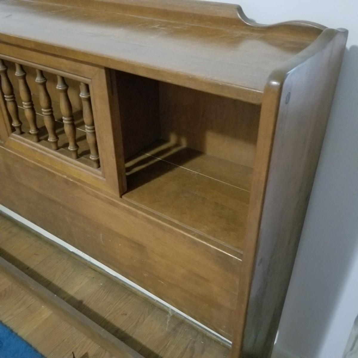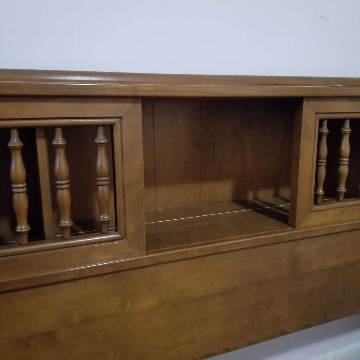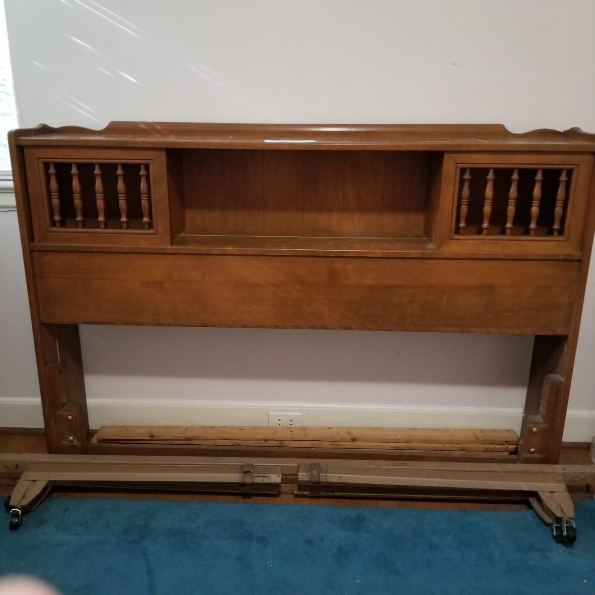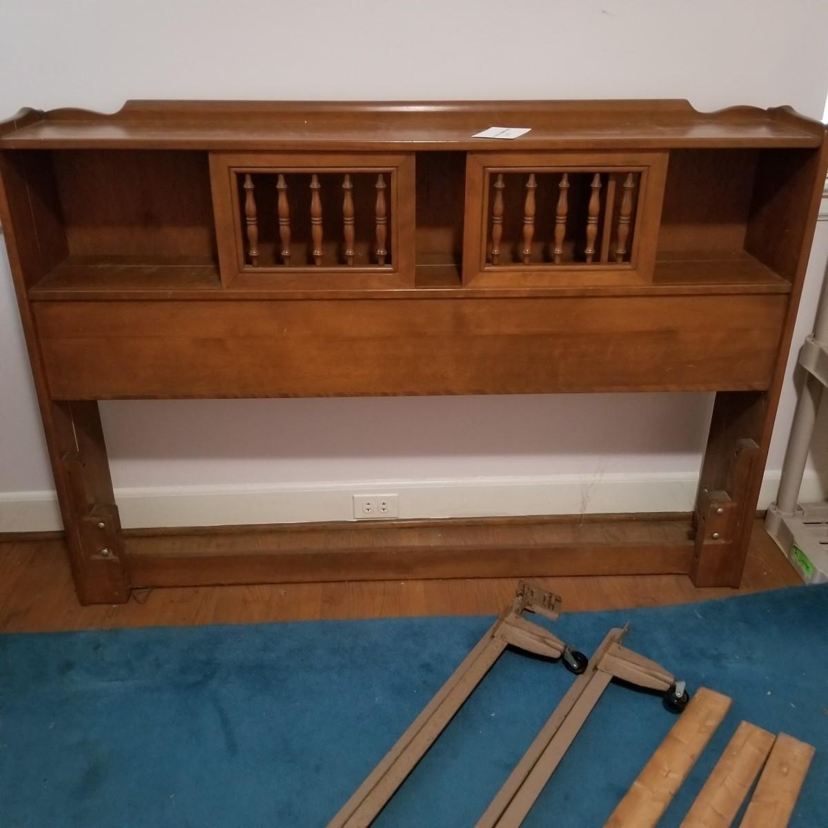 A nice twin size Ethan Allen brand headboard with bookcase storage and sliding spindle doors. Solid wood. Also includes bed slats and an adjustable metal frame with wheels. Headboard is 58" x 10" x 39" and in good condition. Local pickup only.