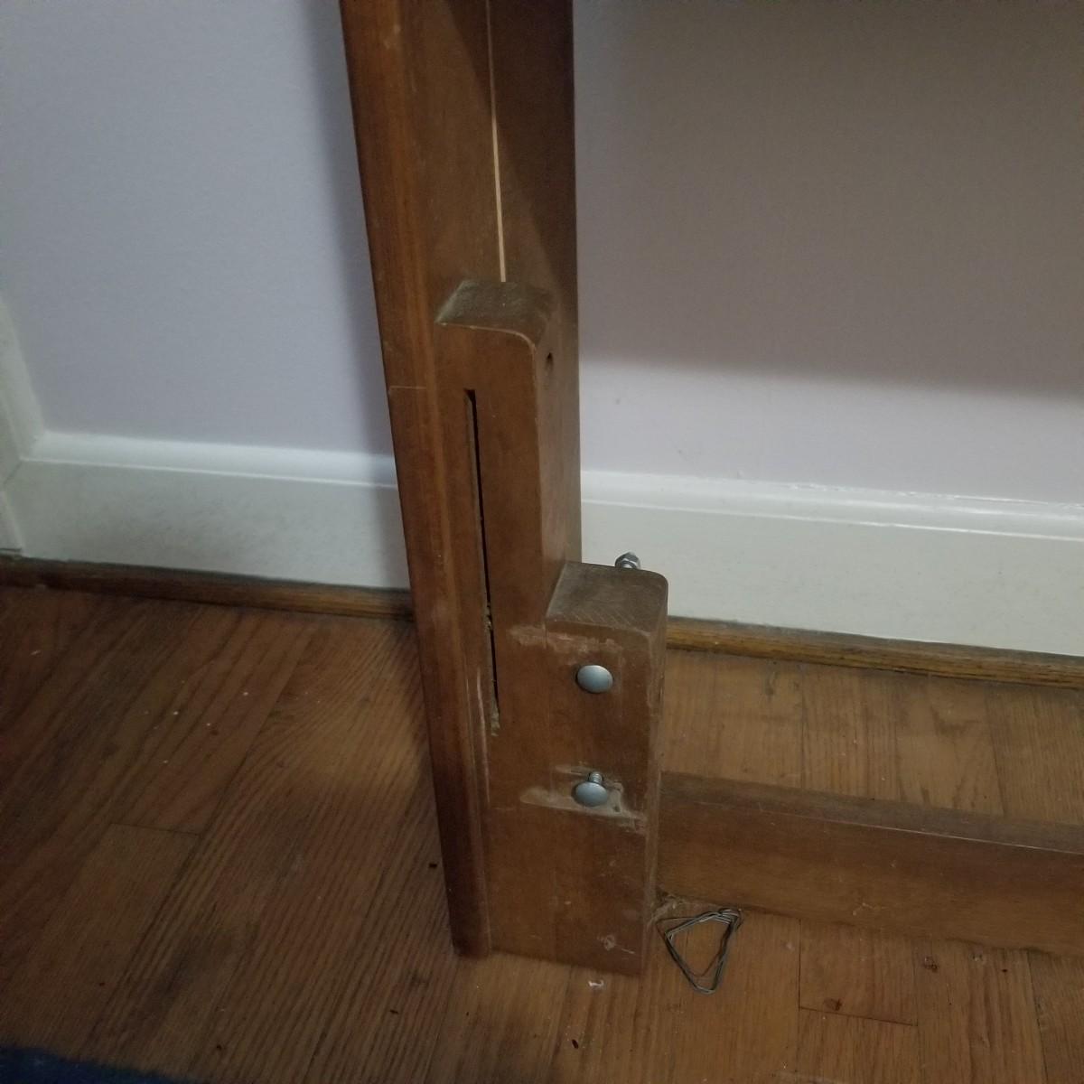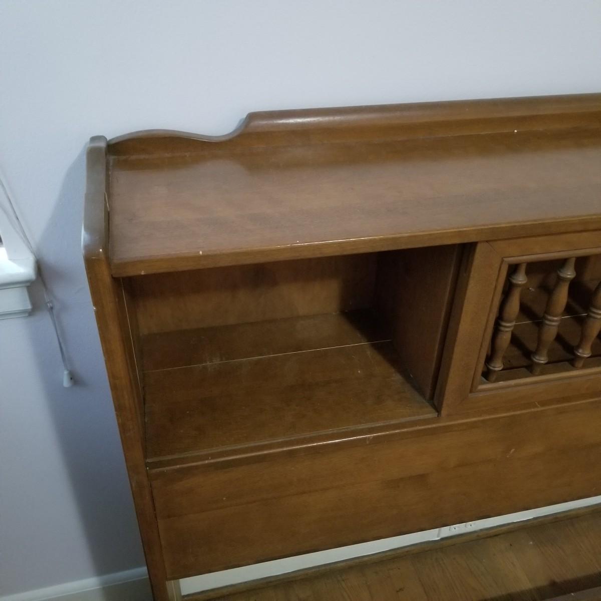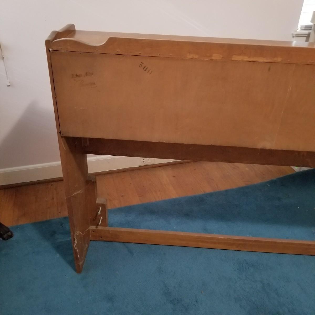 A nice twin size Ethan Allen brand headboard with bookcase storage and sliding spindle doors. Solid wood. Also includes bed slats and an adjustable metal frame with wheels. Headboard is 58" x 10" x 39" and in good condition. Local pickup only.