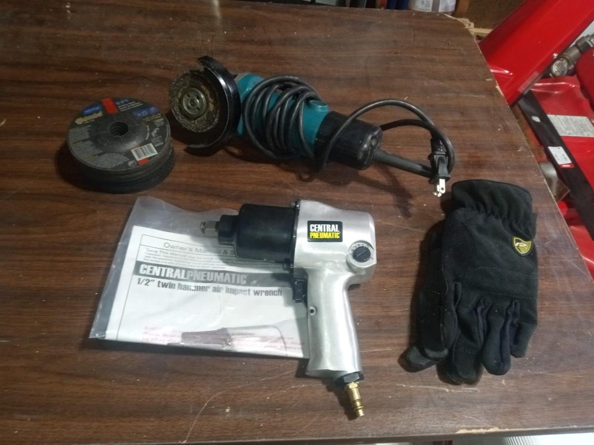 TWIN HAMMER AIR IMPACT WRENCH, GRINDER, GRINDING WHEELS AND GLOVES
