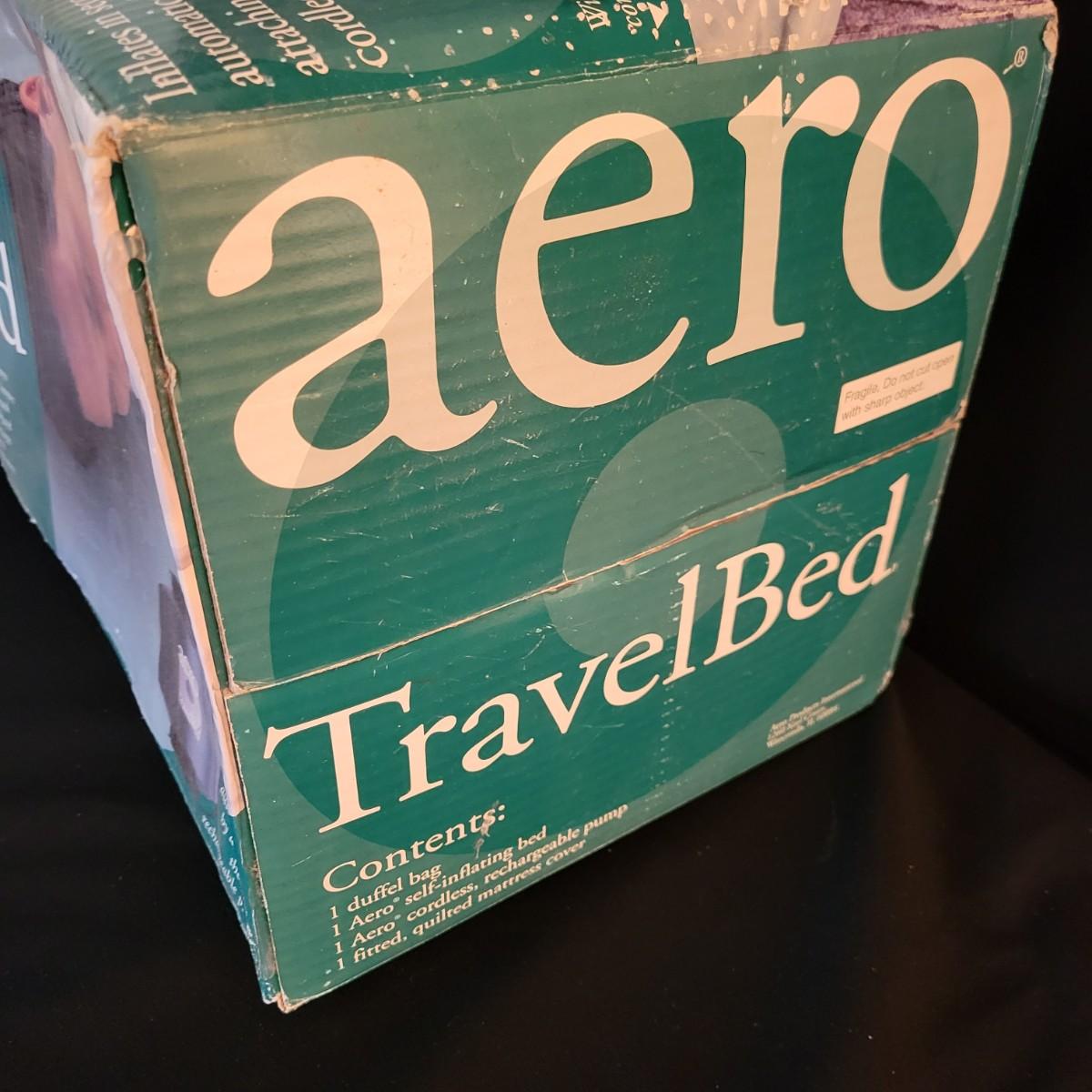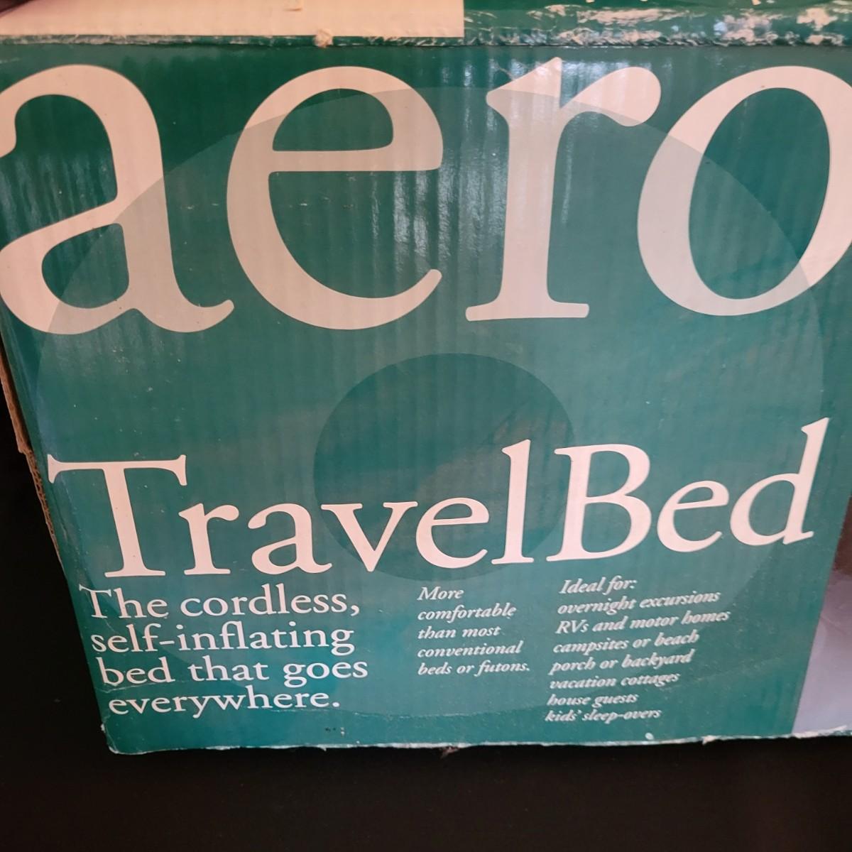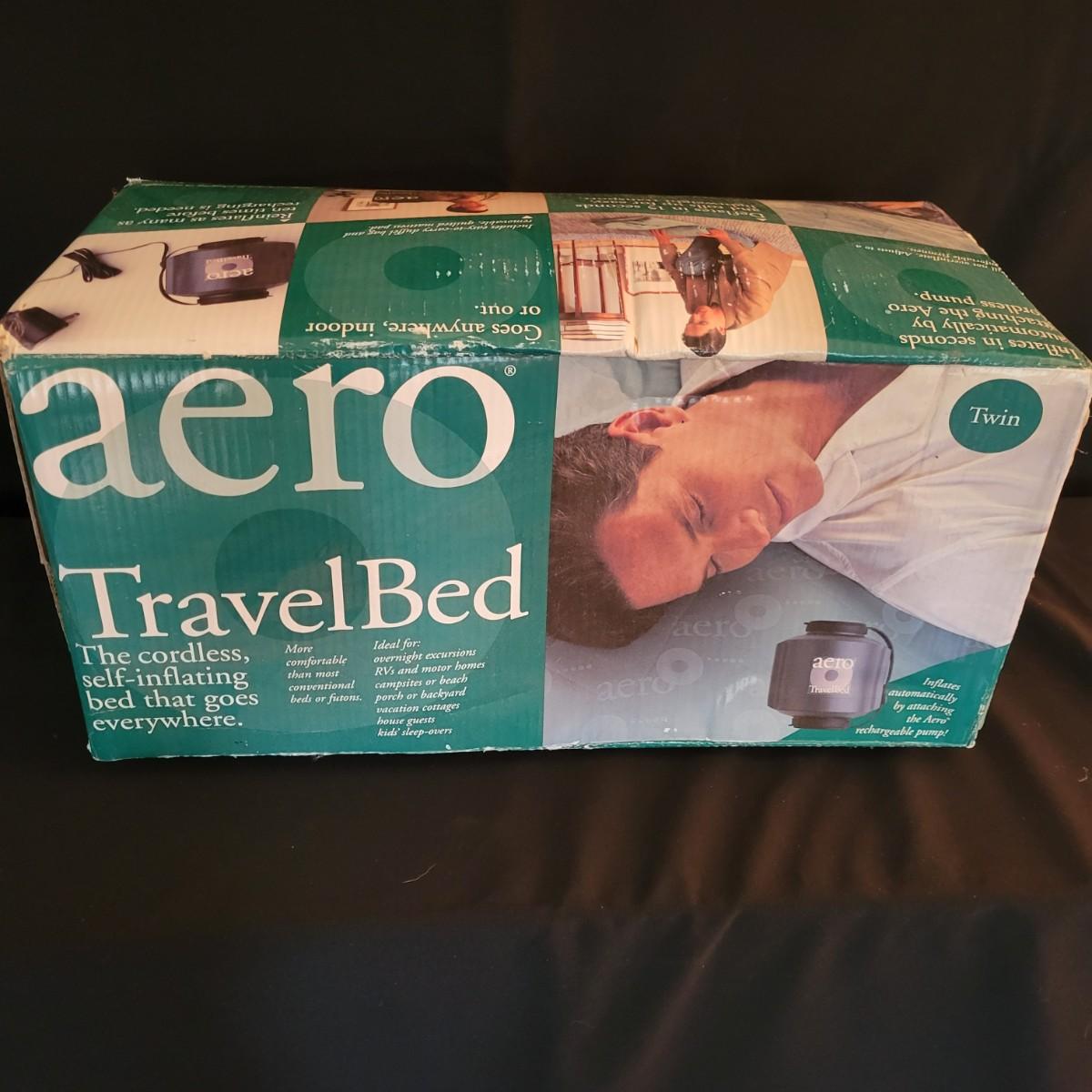 A twin size Aero Travel Bed that new in its original packaging. It features a rechargeable pump, a duffel bag and a quilted mattress cover. The product box measures approximately 23" x 12" x 12"H. Shipping available