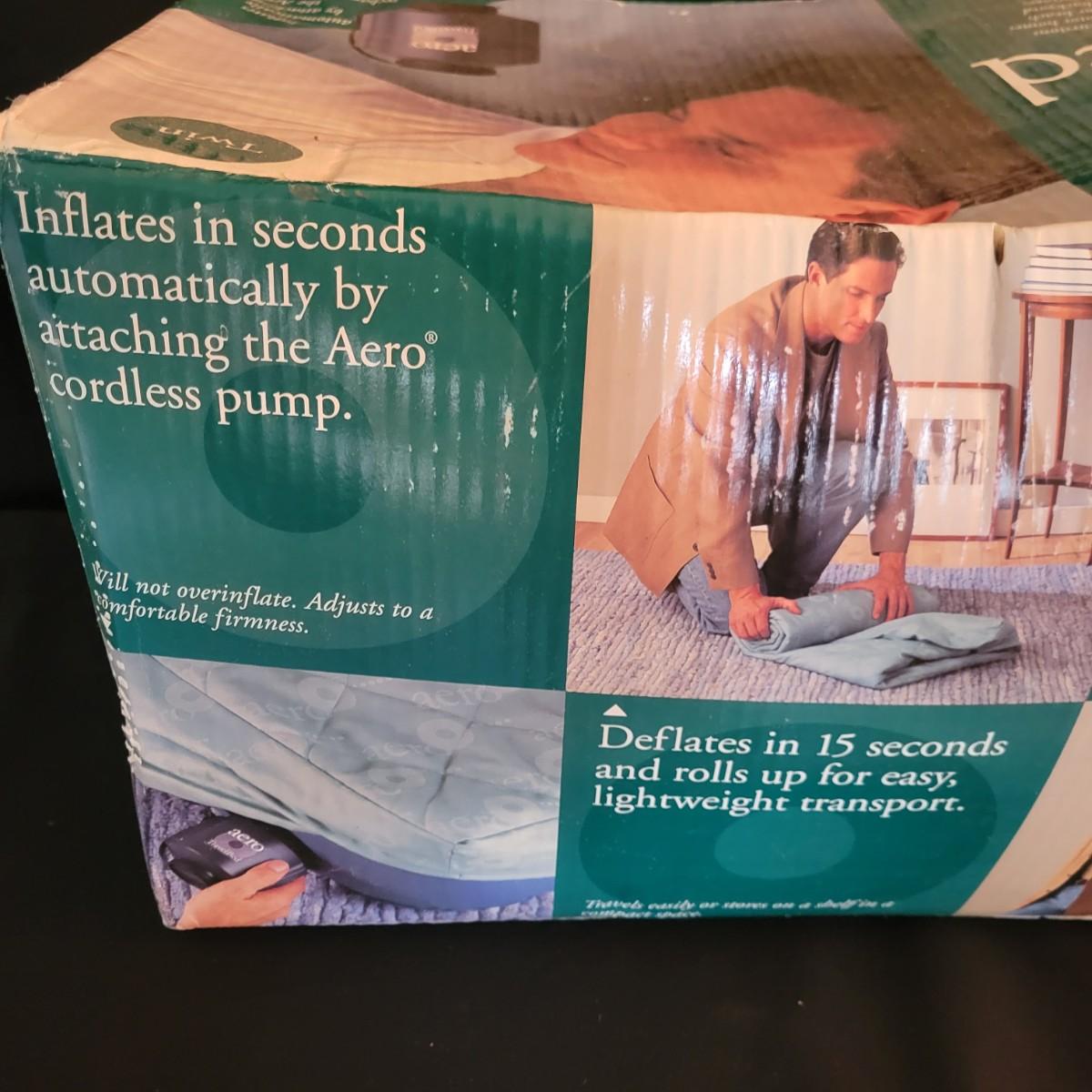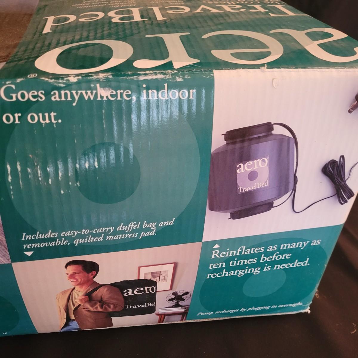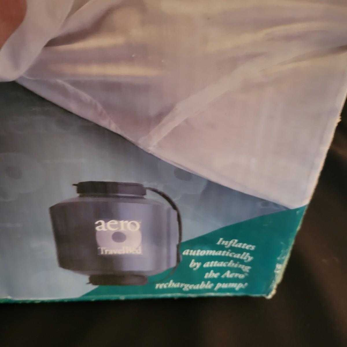 A twin size Aero Travel Bed that new in its original packaging. It features a rechargeable pump, a duffel bag and a quilted mattress cover. The product box measures approximately 23" x 12" x 12"H. Shipping available