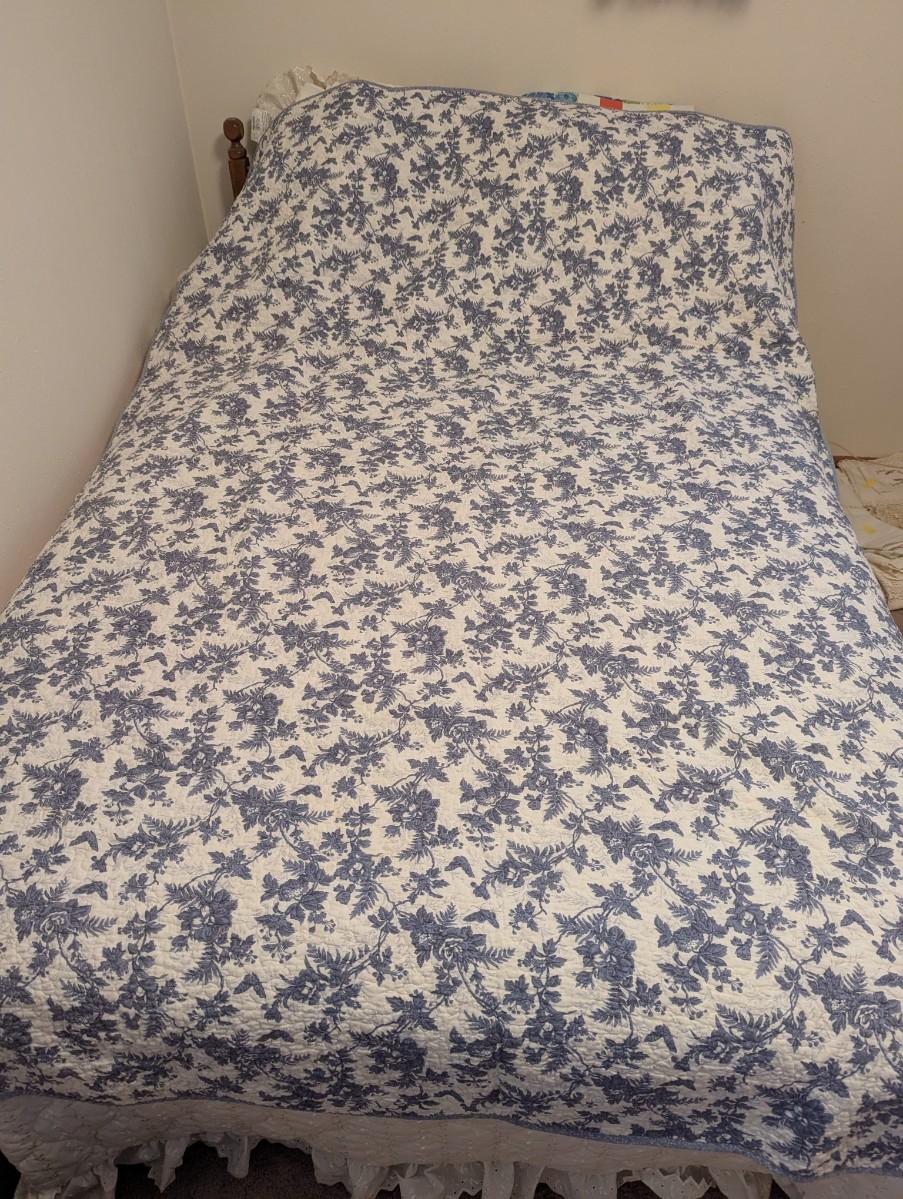.Twin size reversible quilted blue bedspread. very pretty blue.