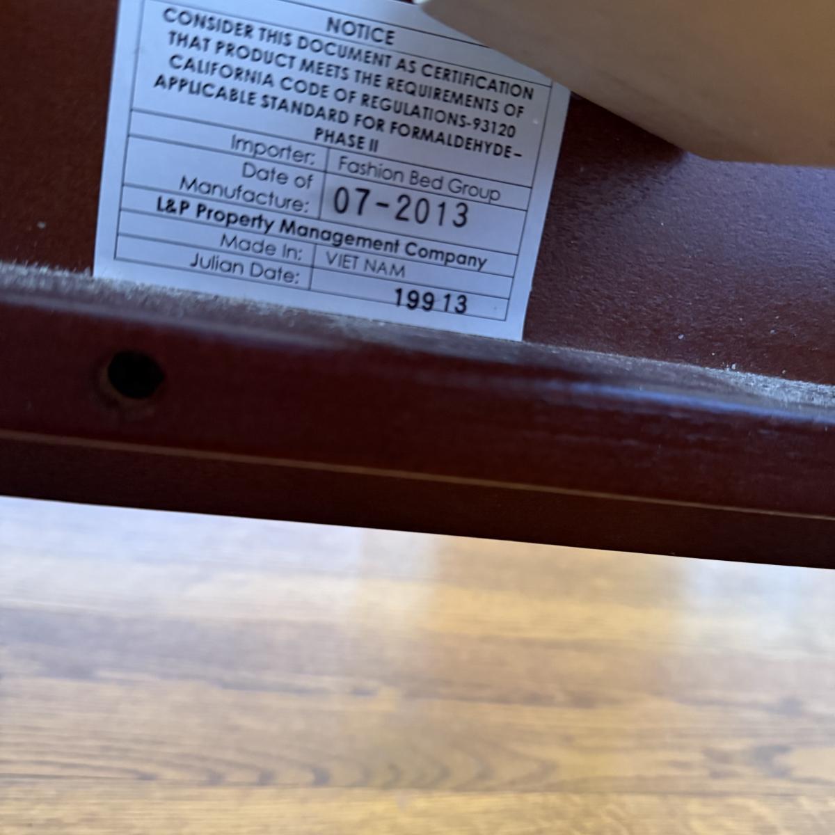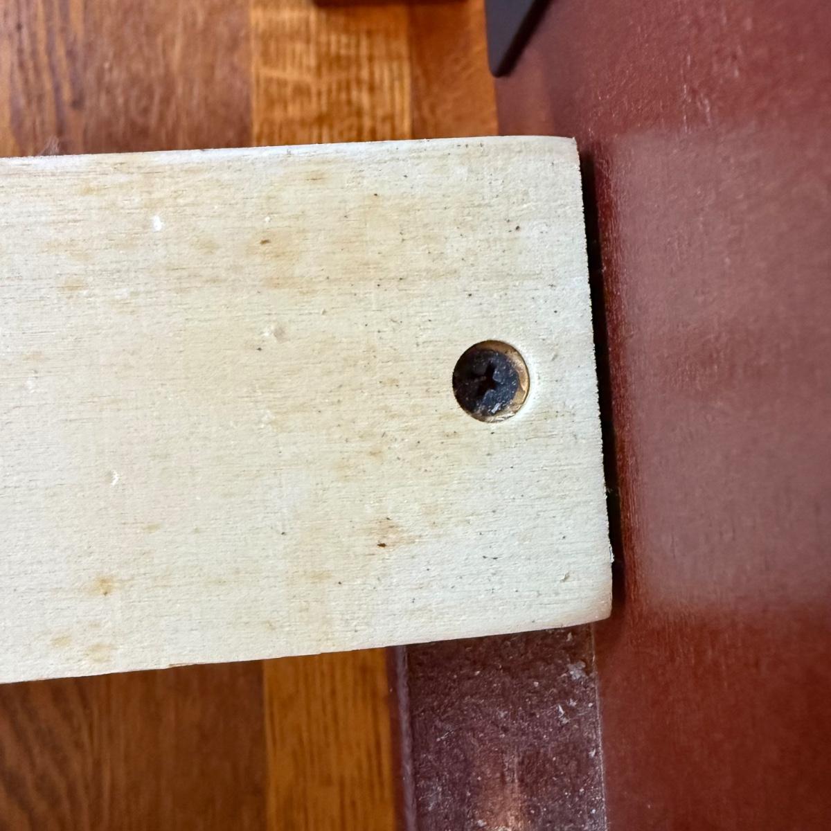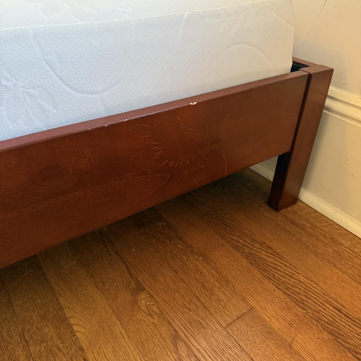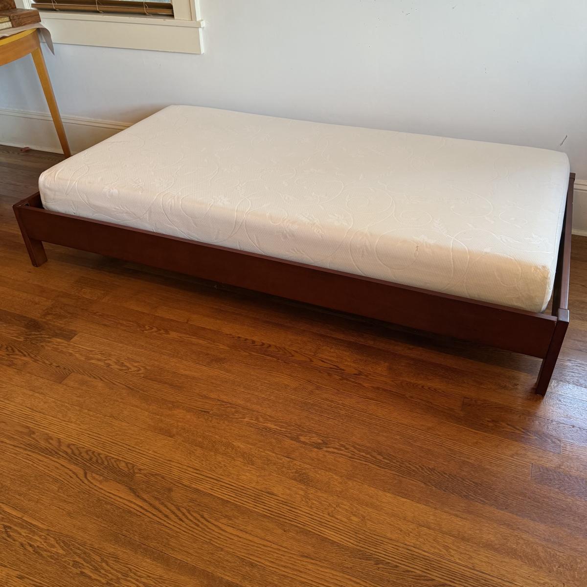 Wooden platform bed frame measures 78.25” x 41” x 11”H. Has a few scuffs around the edge. The platform slats are screwed in - slats and the bed frame can be disassembled with a Phillips head screwdriver. Winning bidder is responsible for disassembly.