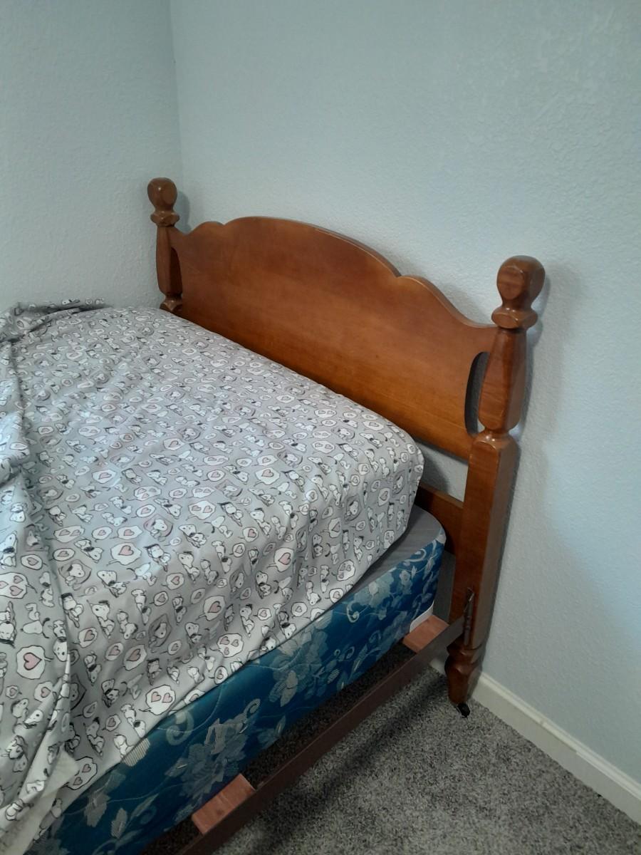 Twin Sized bed, with bedding, headboard, Footboard, Mattress and Box springs (small hole in corner of mattress as shown)