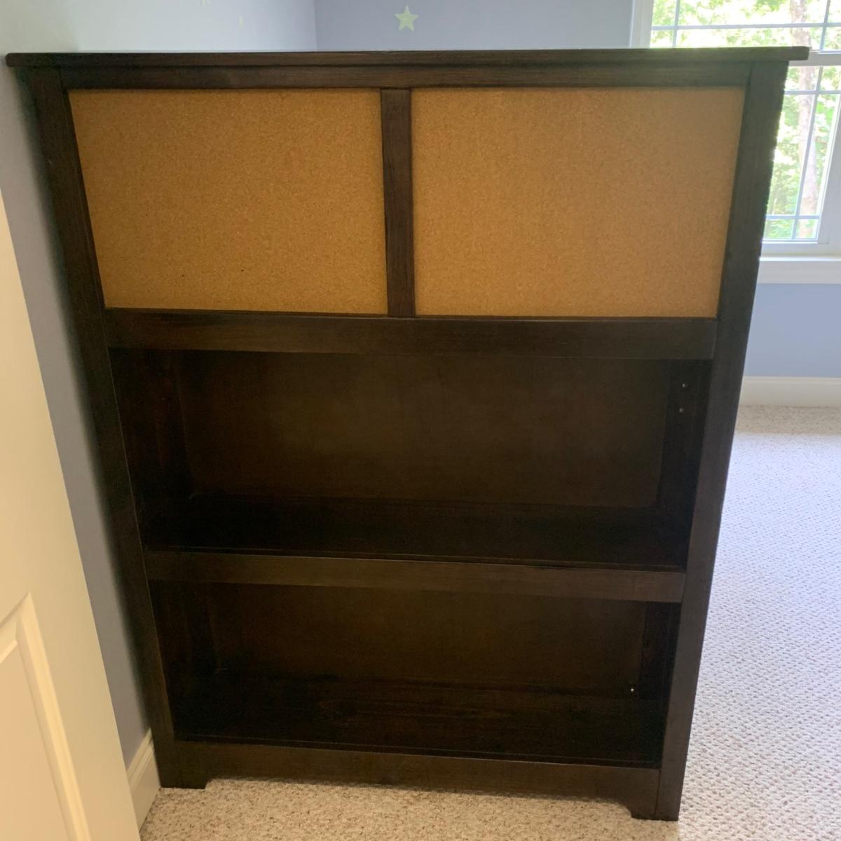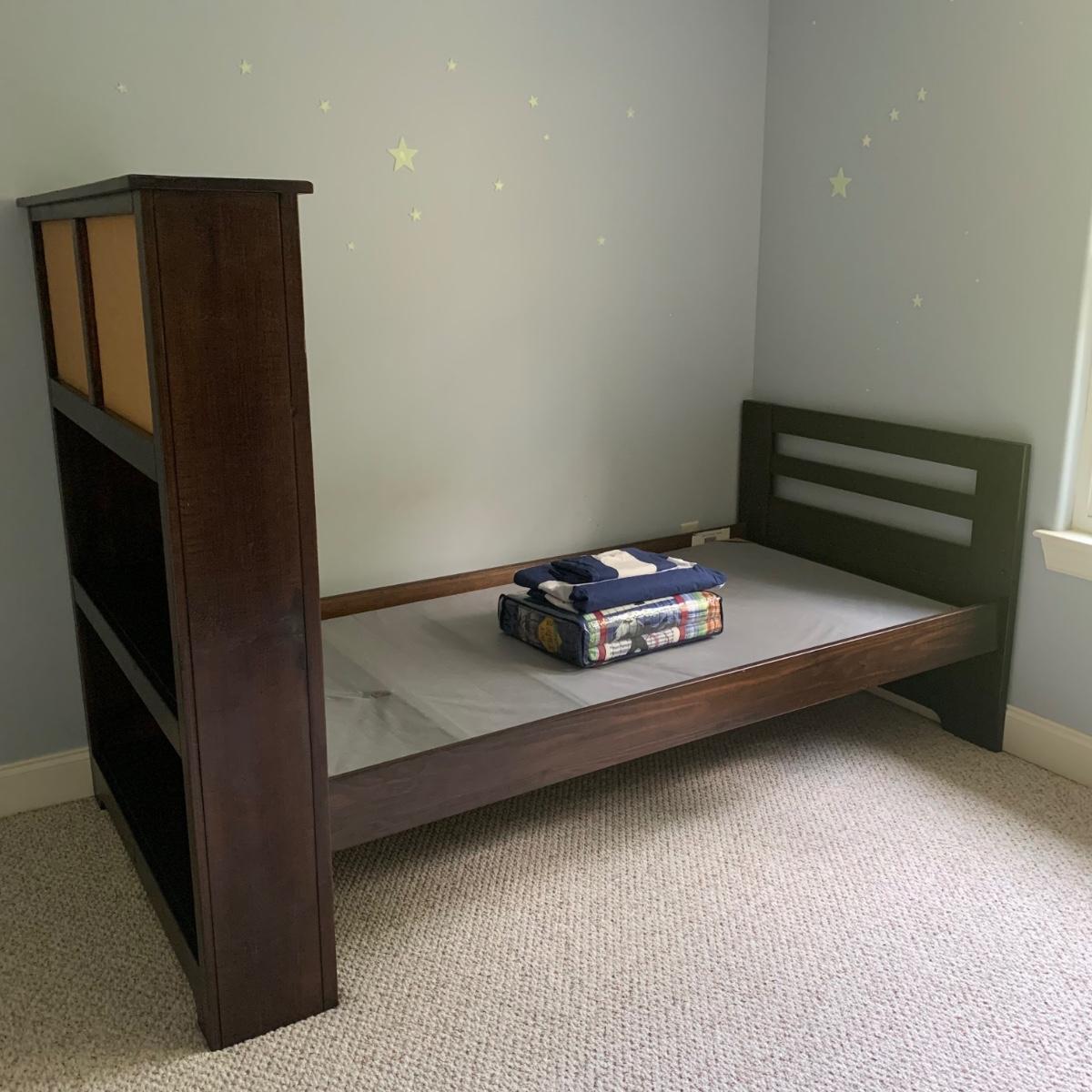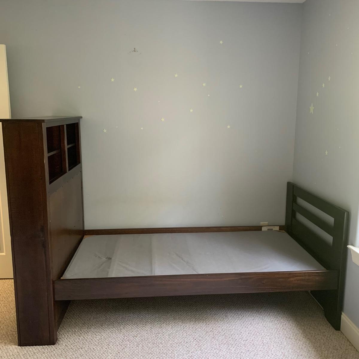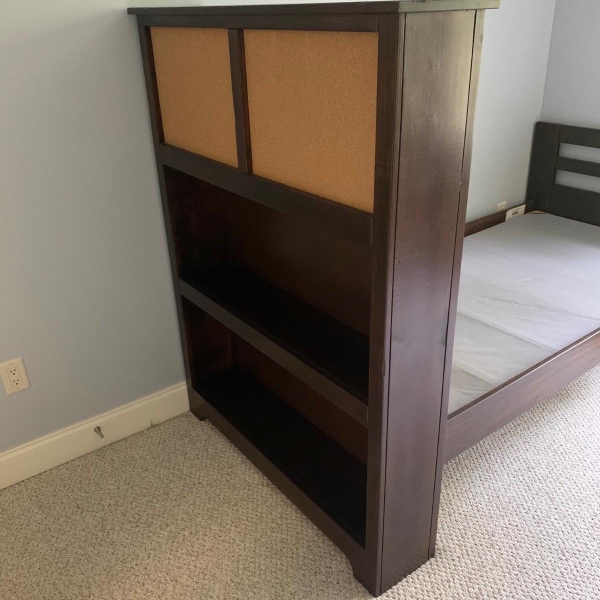 Dark wood colored twin bed frame with attached shelves. This frame comes with twin-sized bed linens. Shelf features two cork board squares. Whole unit measures, 86” x 45” x 58”H. Model number: 19B-701