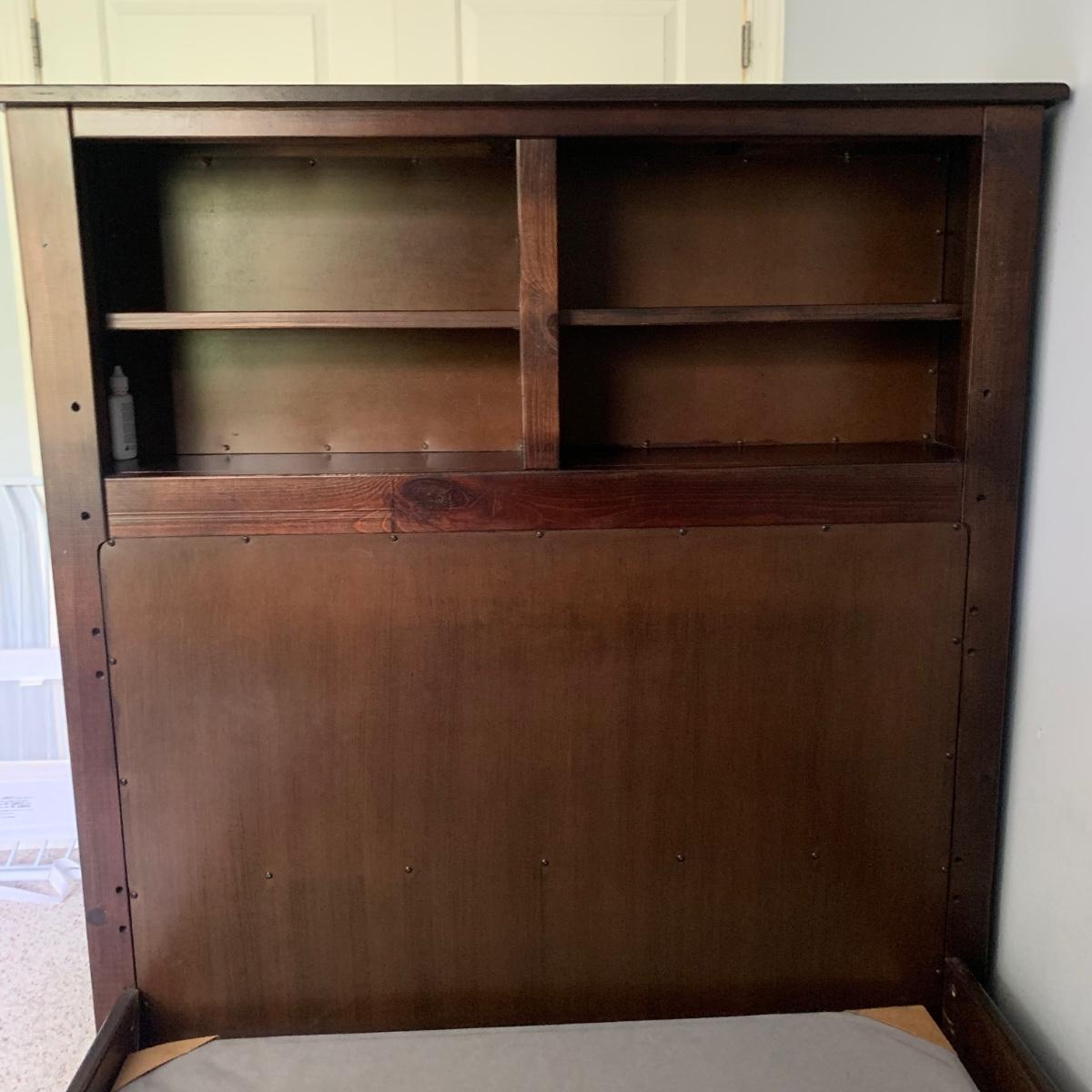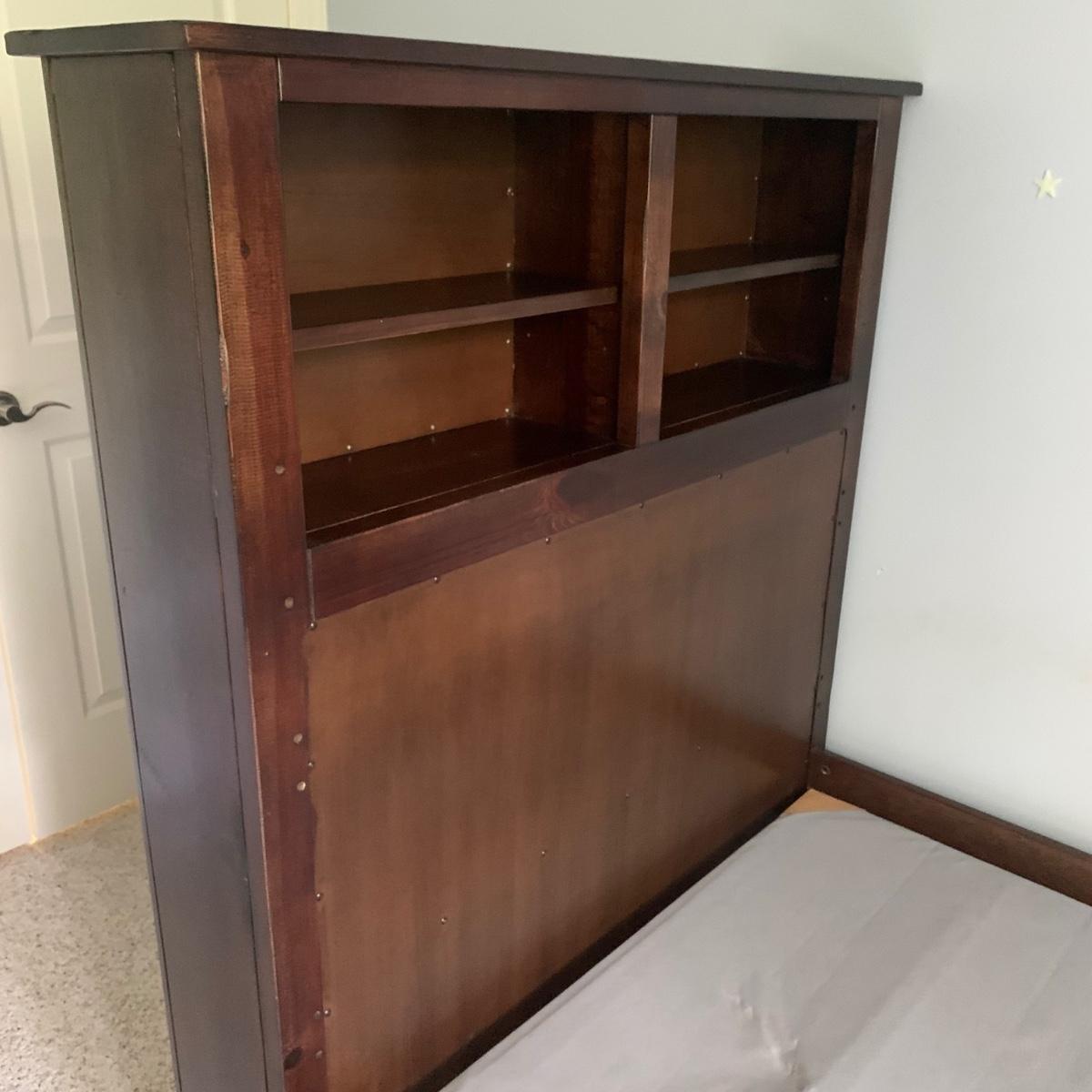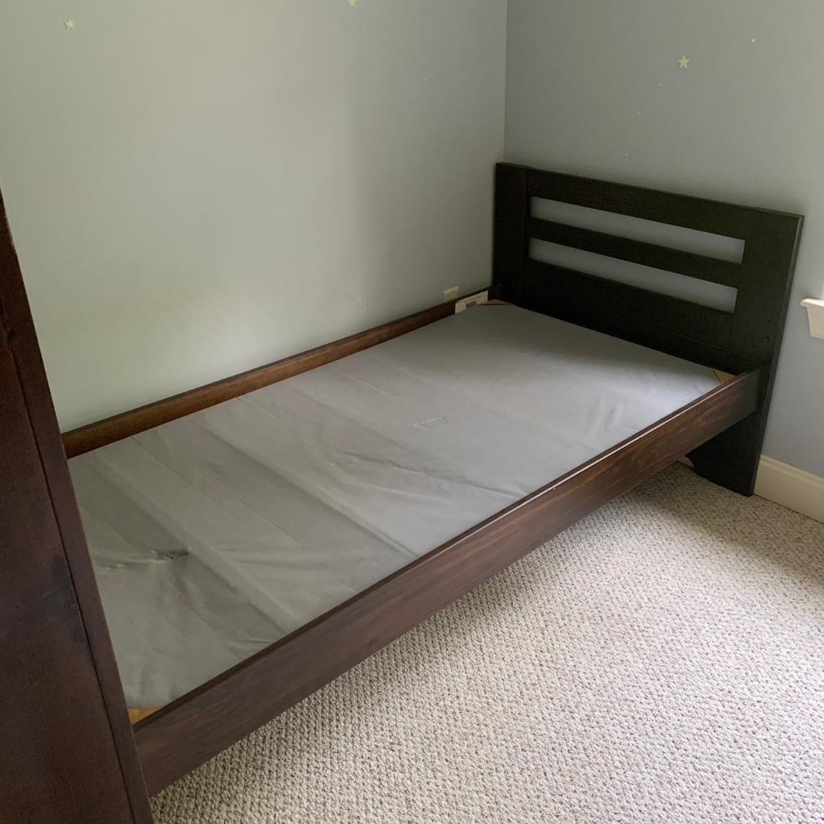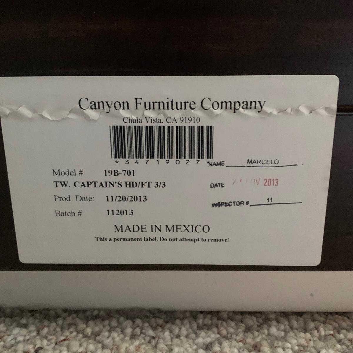 Dark wood colored twin bed frame with attached shelves. This frame comes with twin-sized bed linens. Shelf features two cork board squares. Whole unit measures, 86” x 45” x 58”H. Model number: 19B-701
