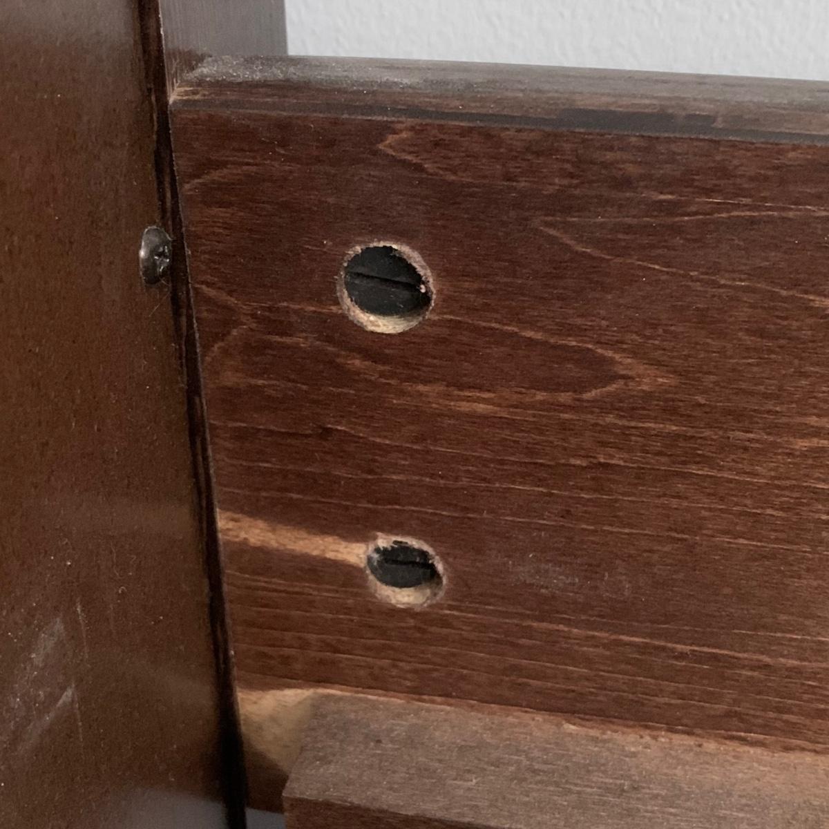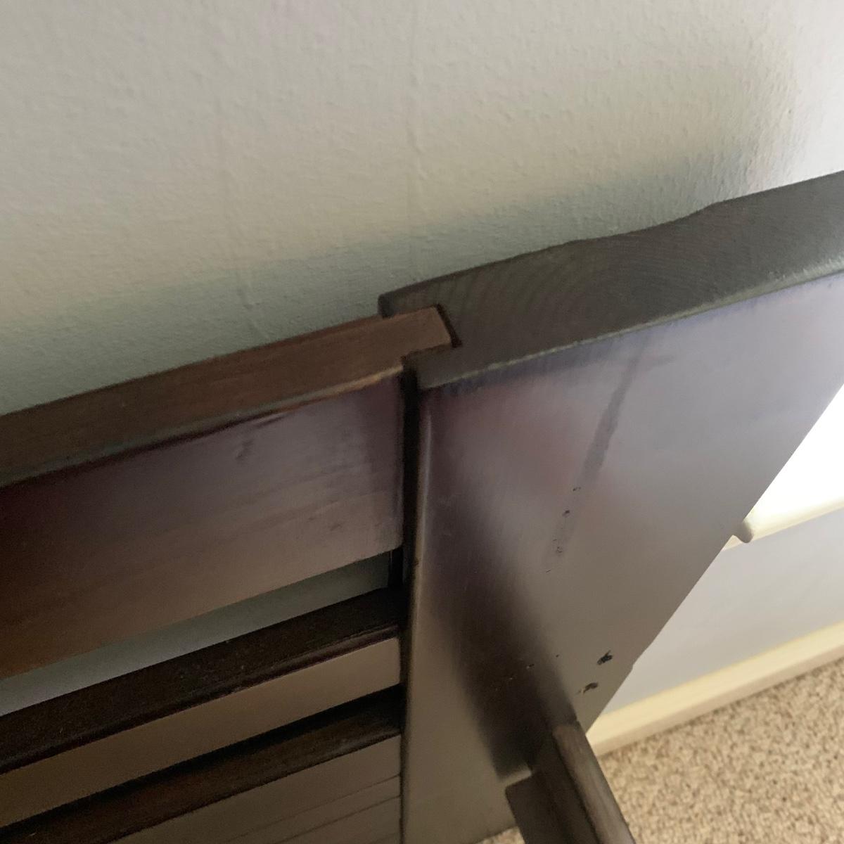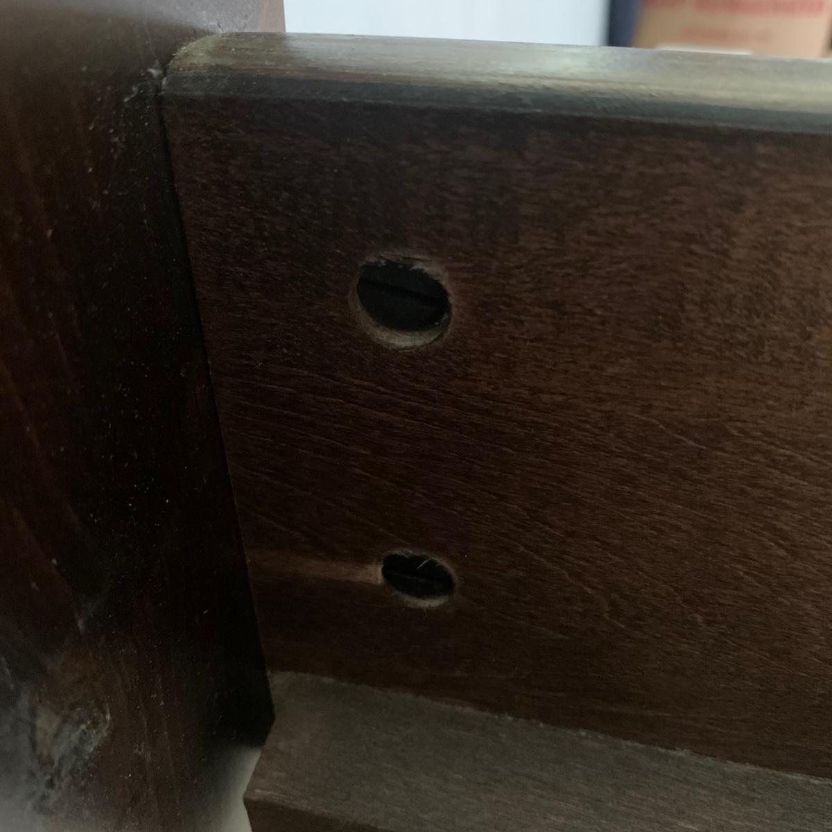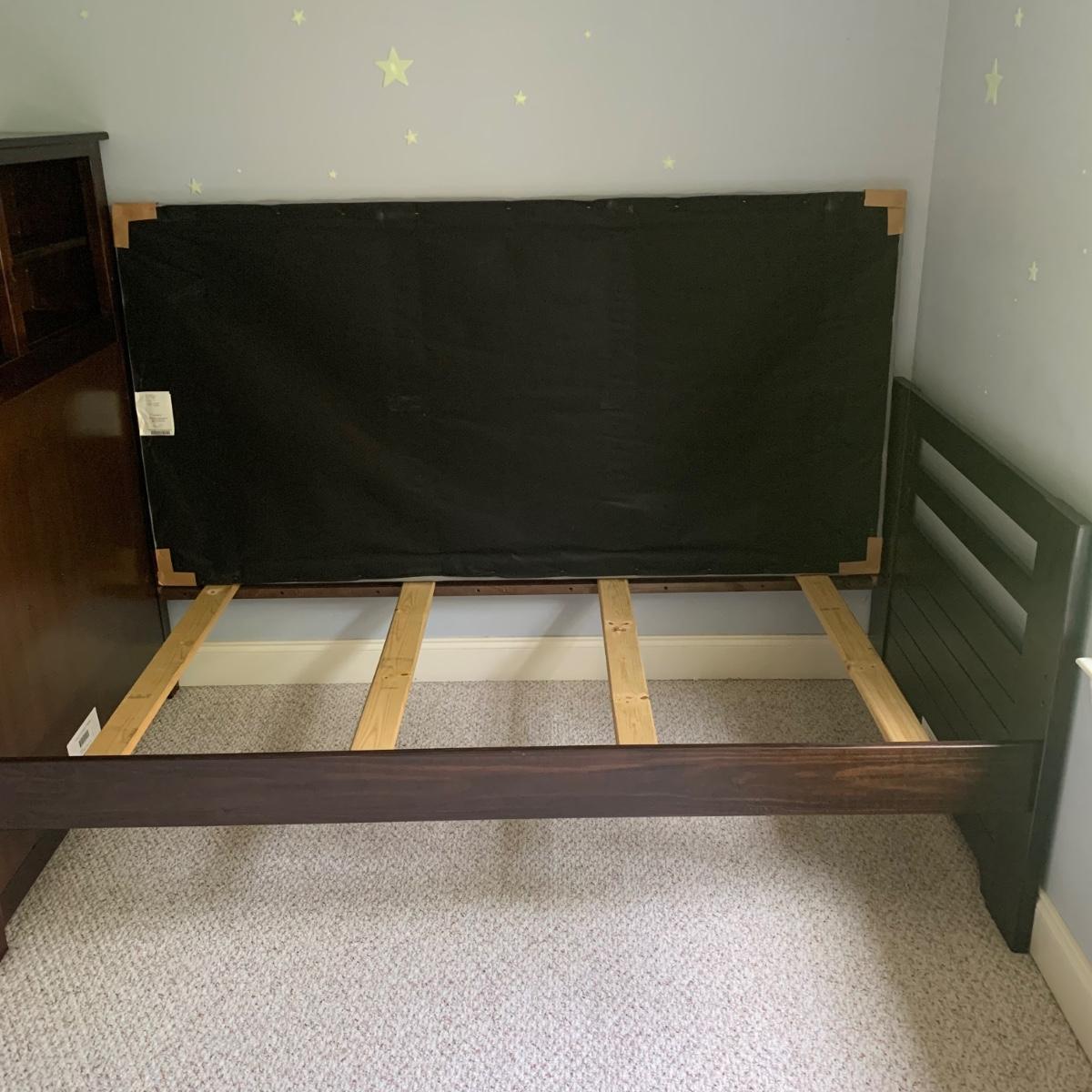 Dark wood colored twin bed frame with attached shelves. This frame comes with twin-sized bed linens. Shelf features two cork board squares. Whole unit measures, 86” x 45” x 58”H. Model number: 19B-701