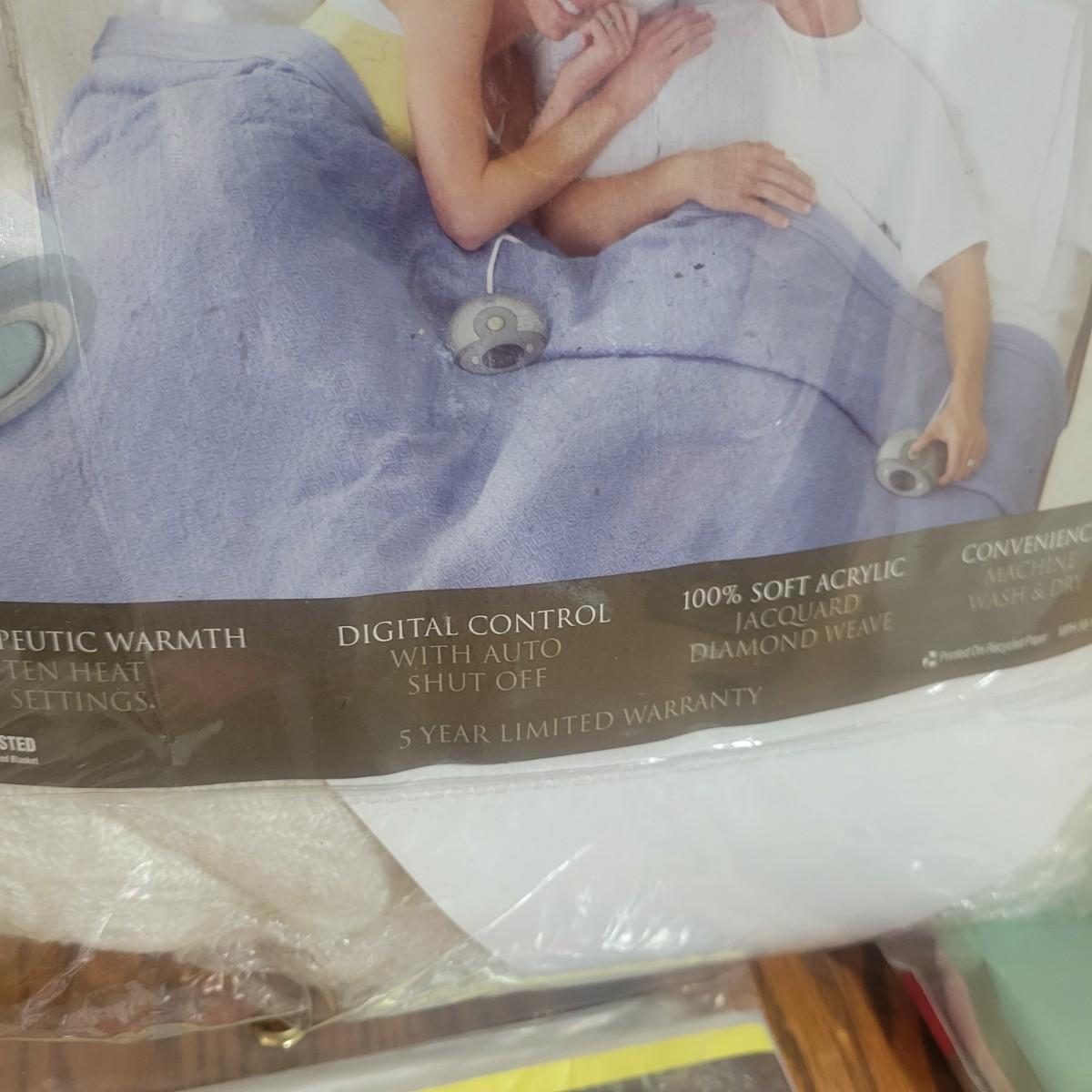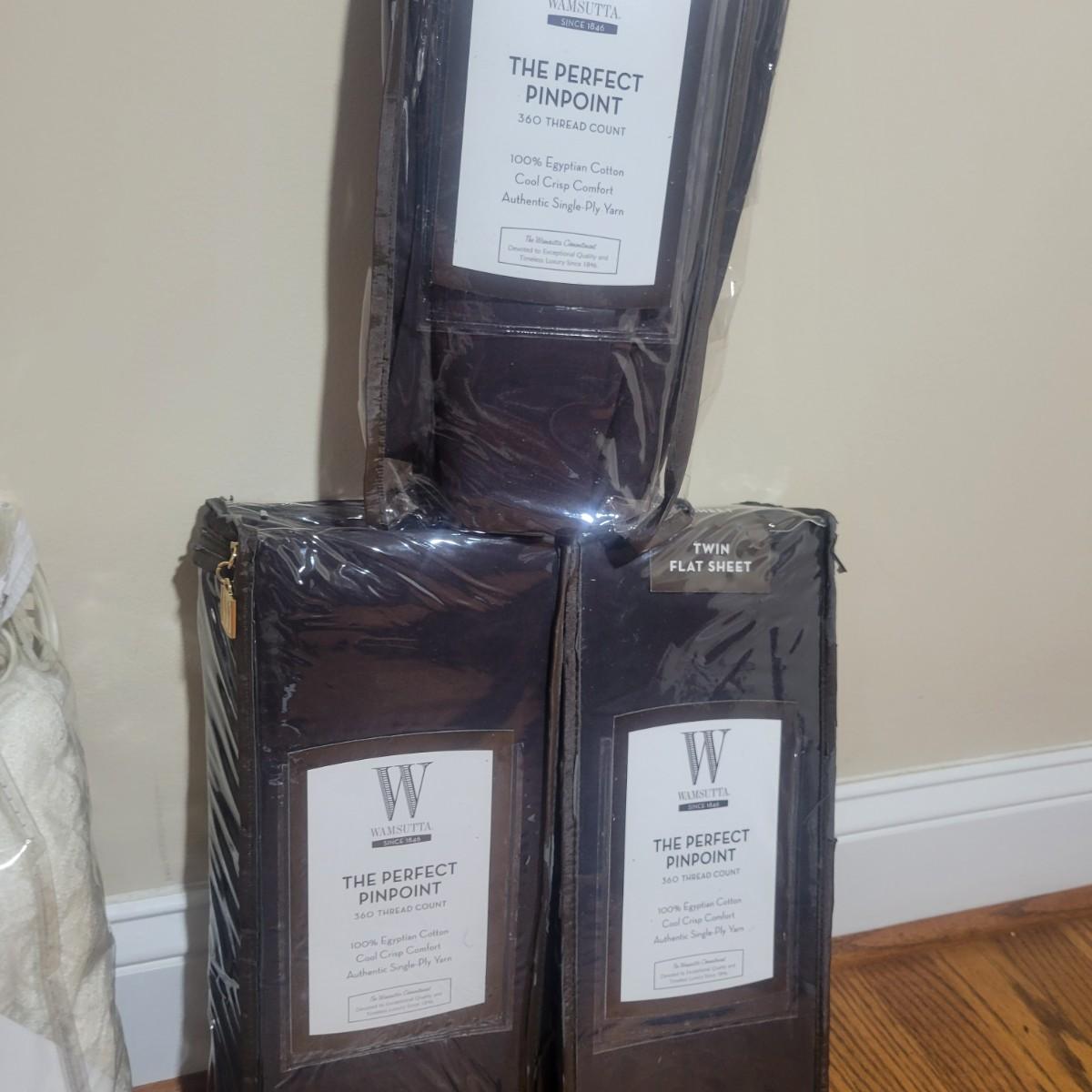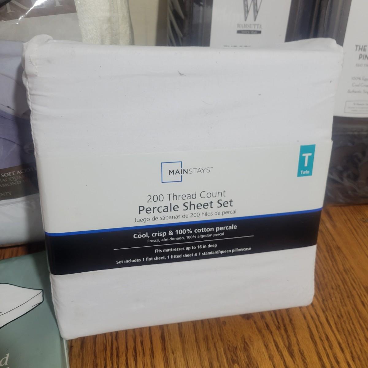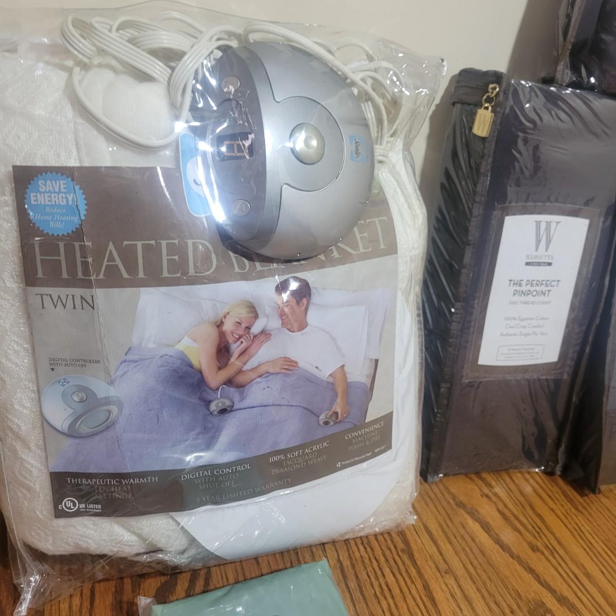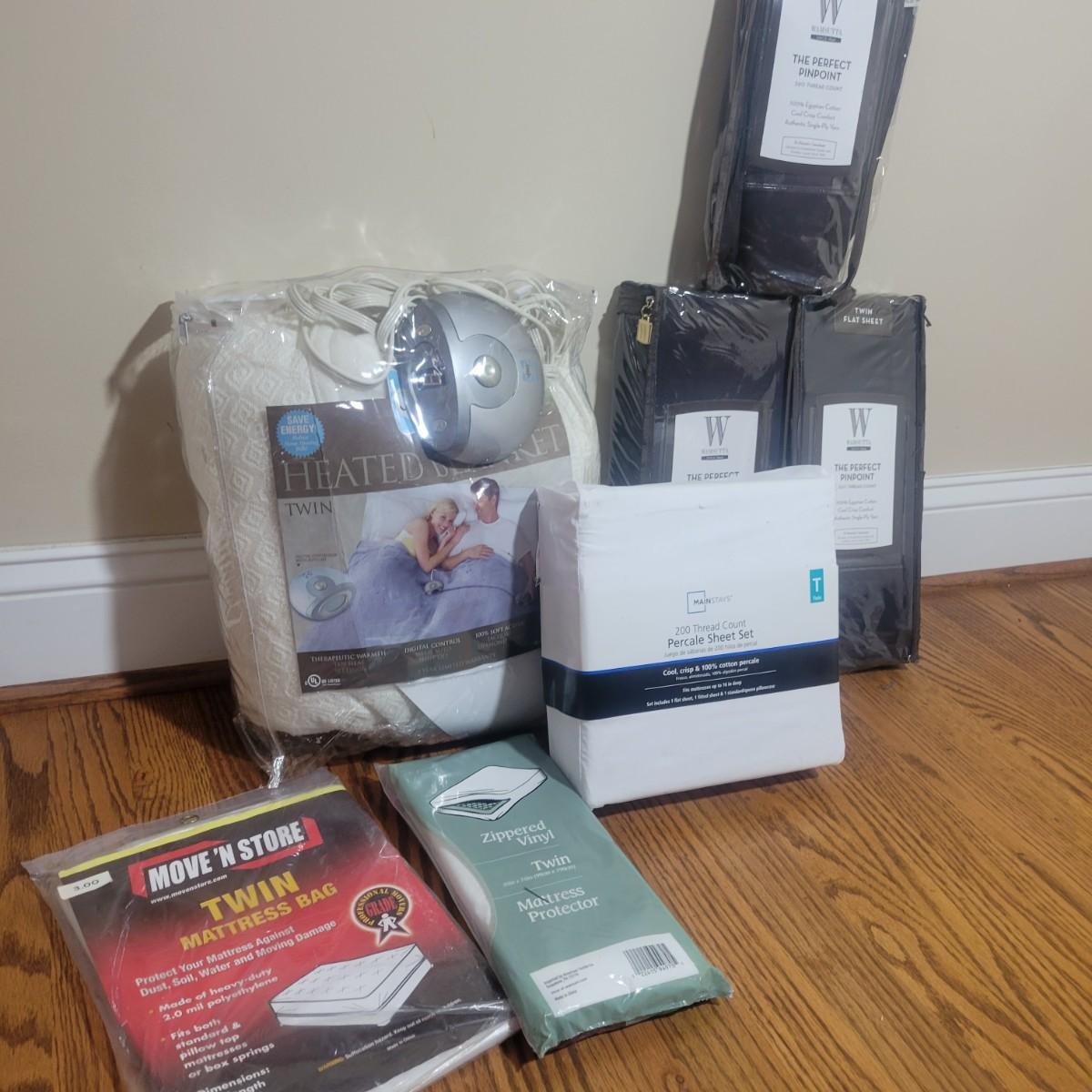 Almost everything for a twin sized bed. Sealy heated blanket, new and in original packaging, 3 black cotton sheet sets made by Wamsutta, another set by Mainstays in white, mattress protector and storage bag. Shipping available