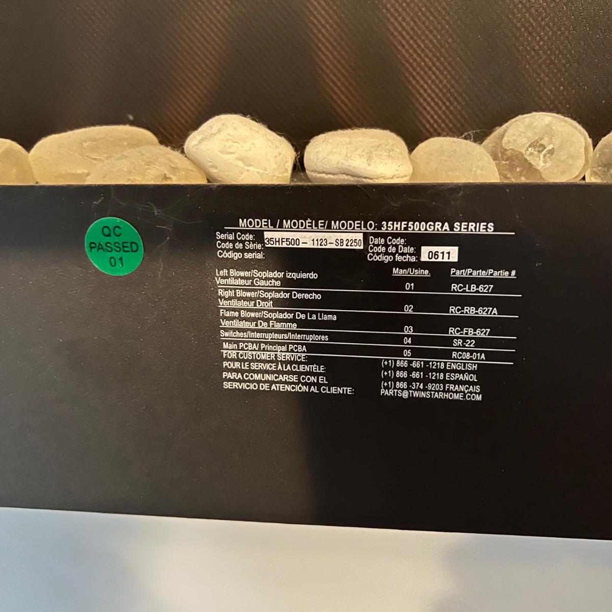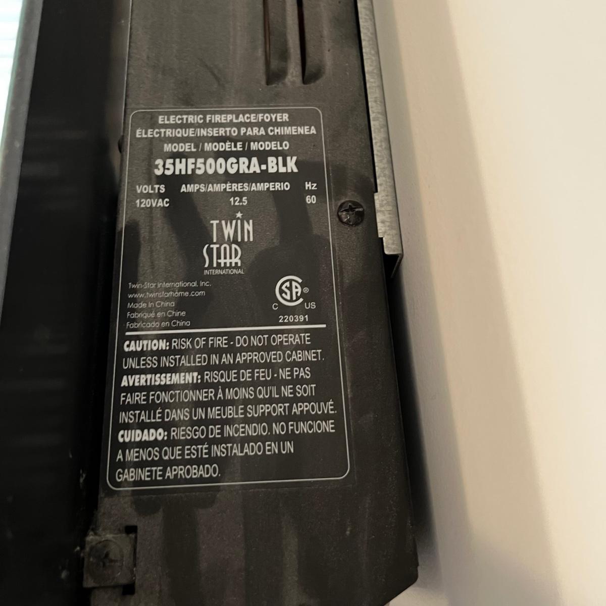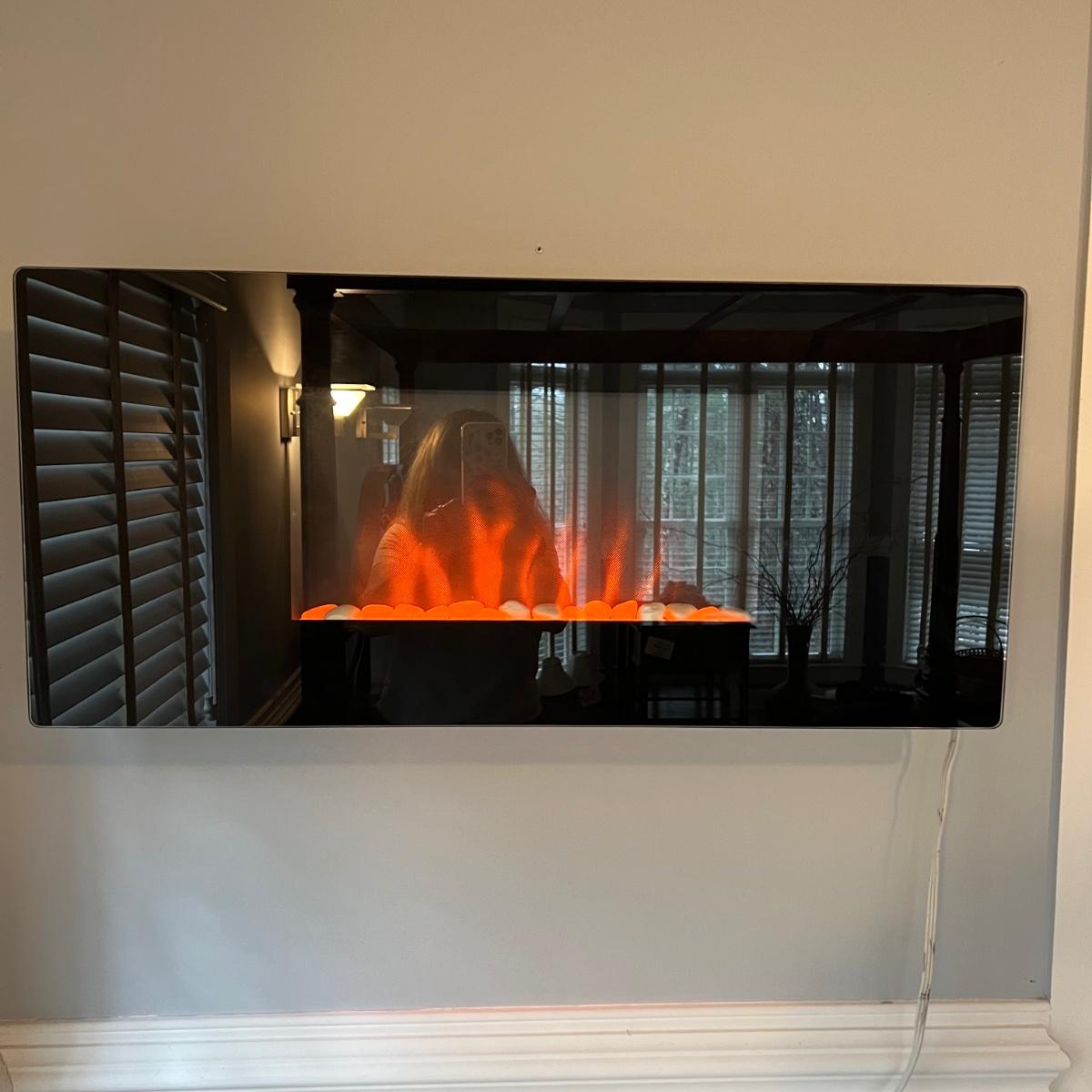 Electric wall-mounted Twin Star fireplace that measures 16”H x 35”W x 4”D. Unit blows heat from the bottom and has pebble like rocks in front of the flame image. Entire screen on the front is glass. Item has been removed from wall for pickup. Local pickup only.