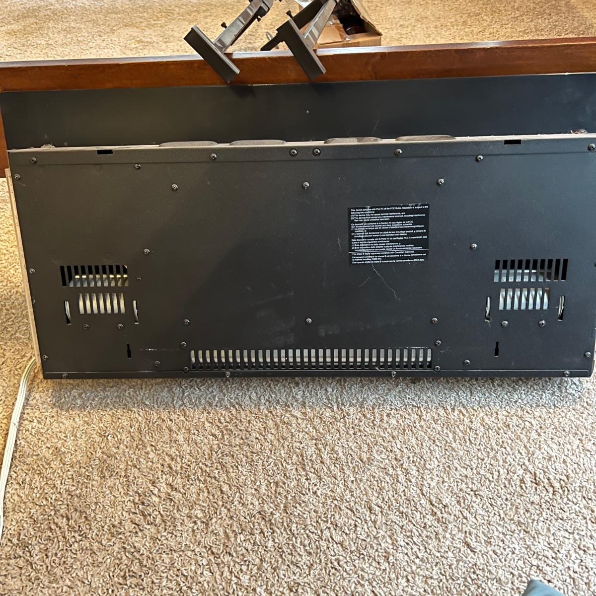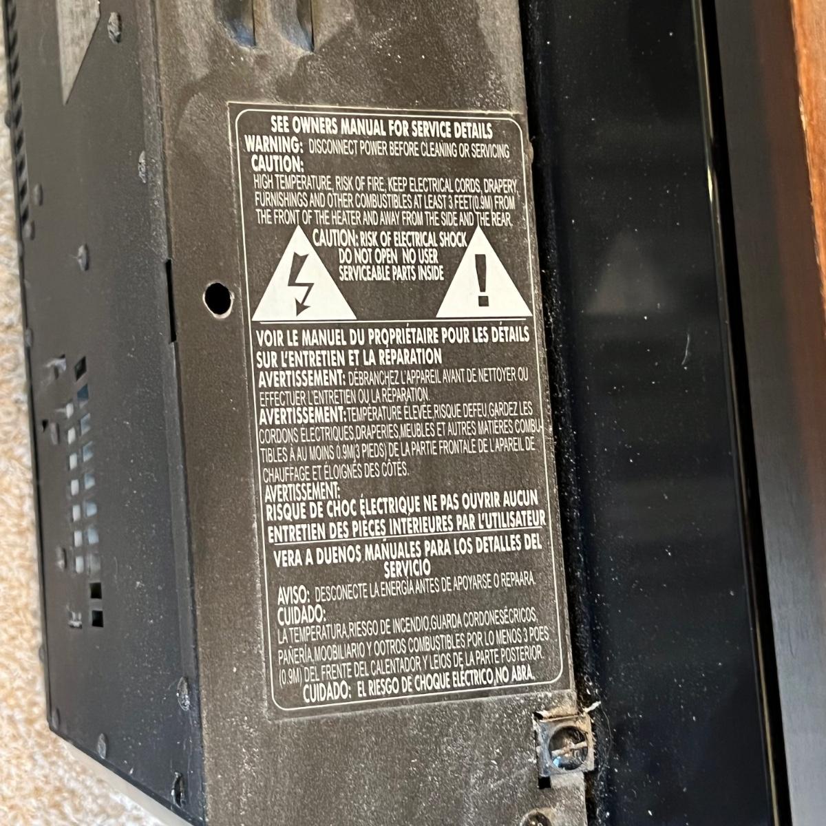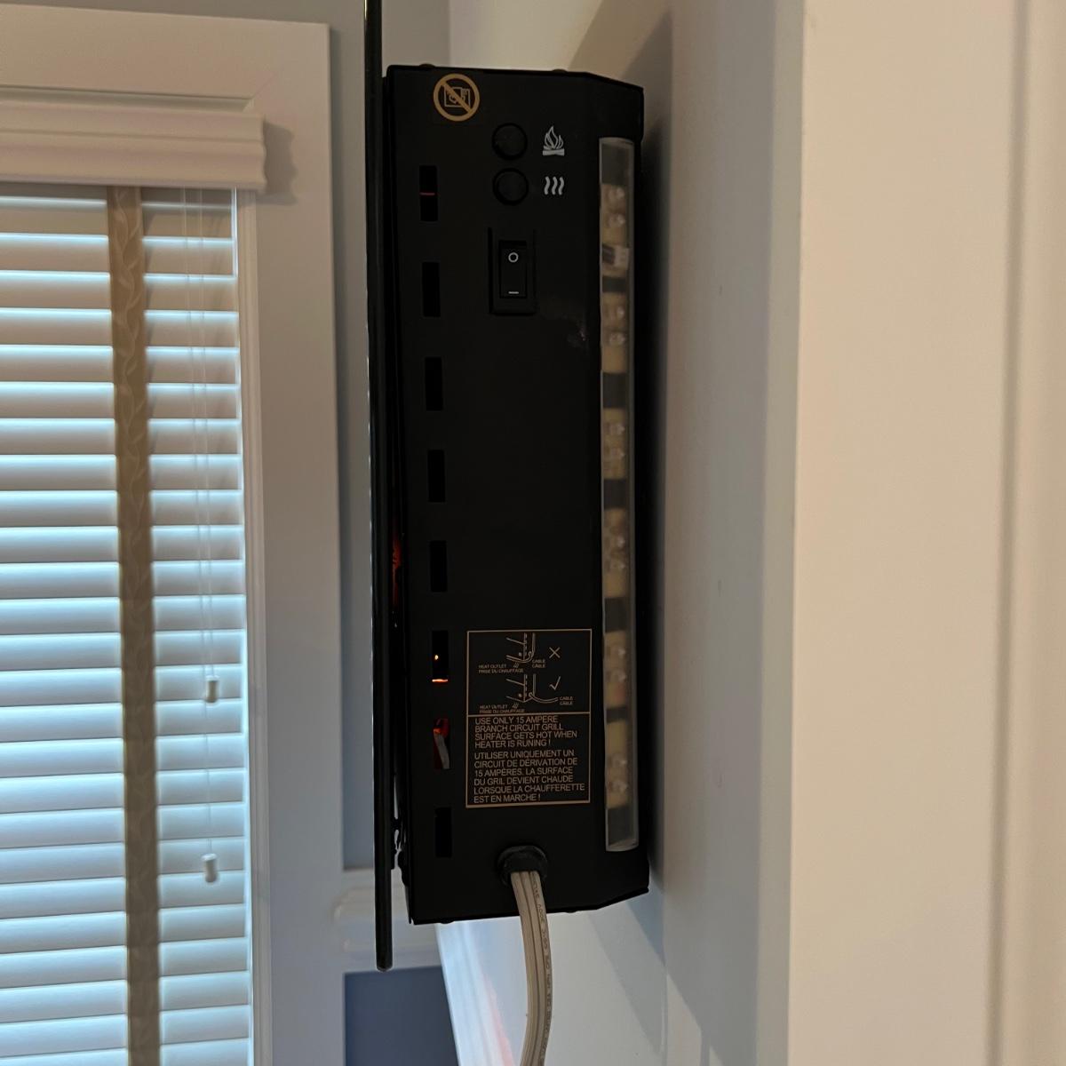 Electric wall-mounted Twin Star fireplace that measures 16”H x 35”W x 4”D. Unit blows heat from the bottom and has pebble like rocks in front of the flame image. Entire screen on the front is glass. Item has been removed from wall for pickup. Local pickup only.