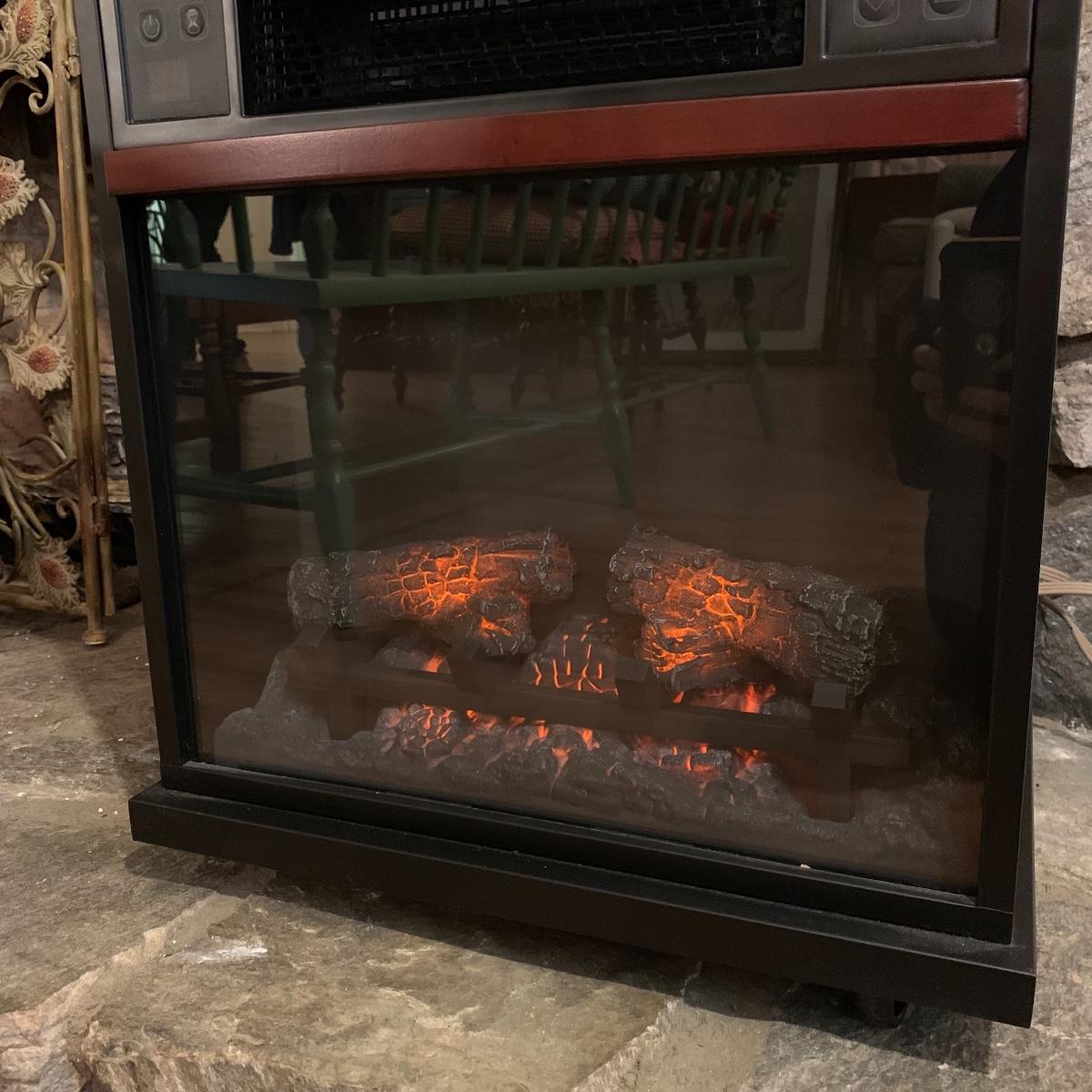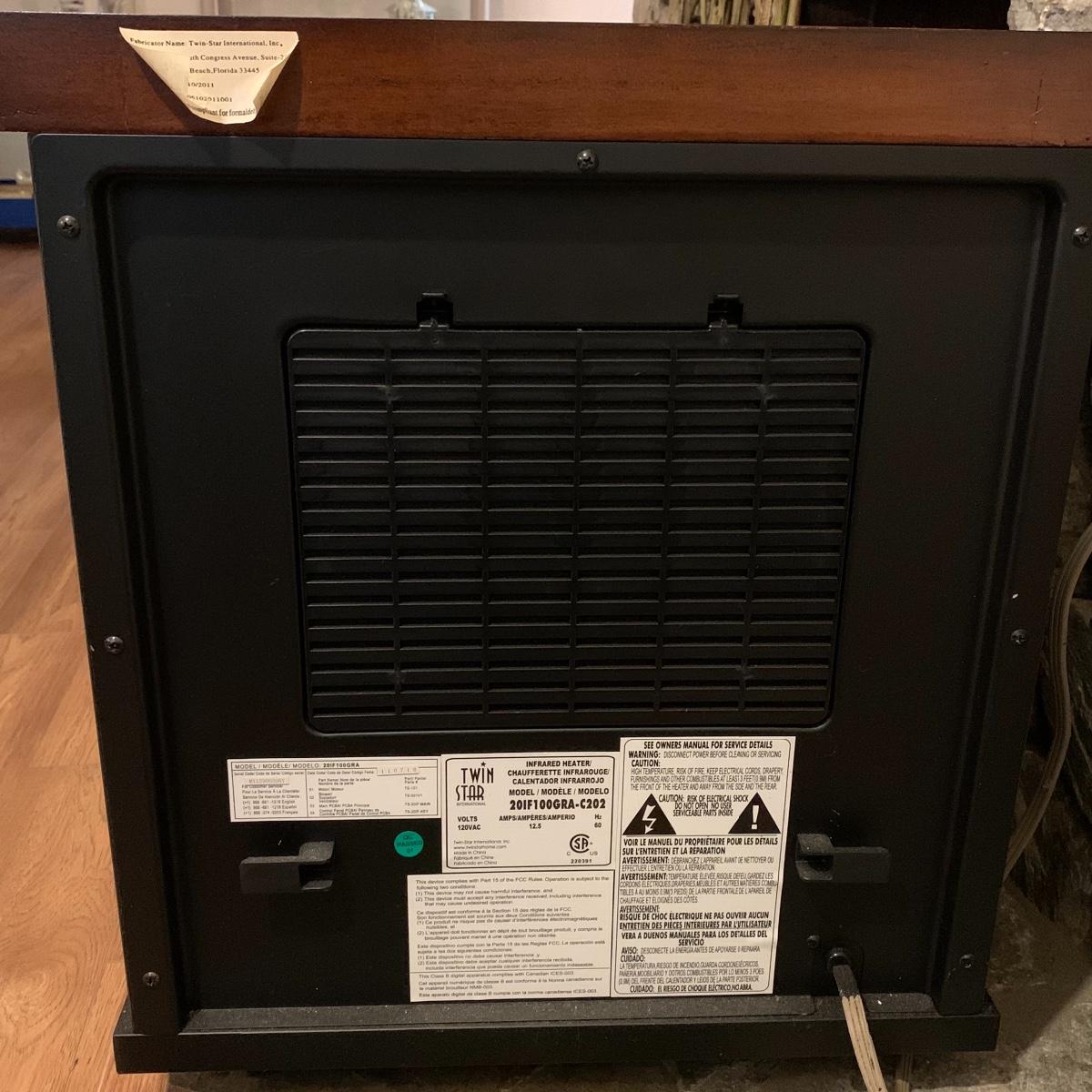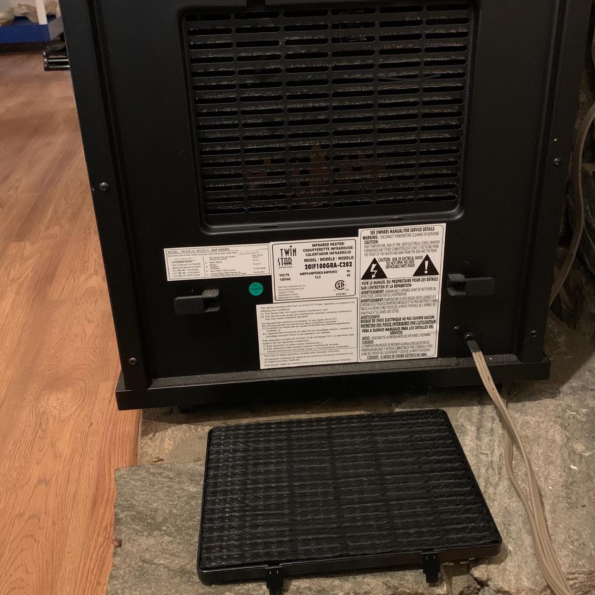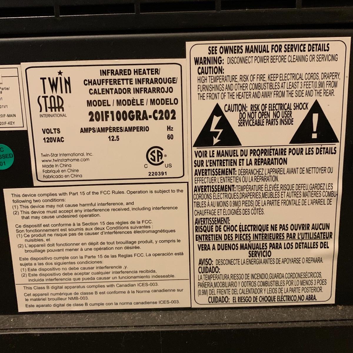 Infrared heater and electric fireplace made by Twin Star International, Model 20IF100GRA-C202. Has various settings, including a timer, a temperature setting, and a button to turn the flame on and off. Heat can come out of the top vent with or without the flame turned on. The unit is on four wheels and has a three-pronged electric plug. It measures 20” x 15” x 22”. Local Pickup Only