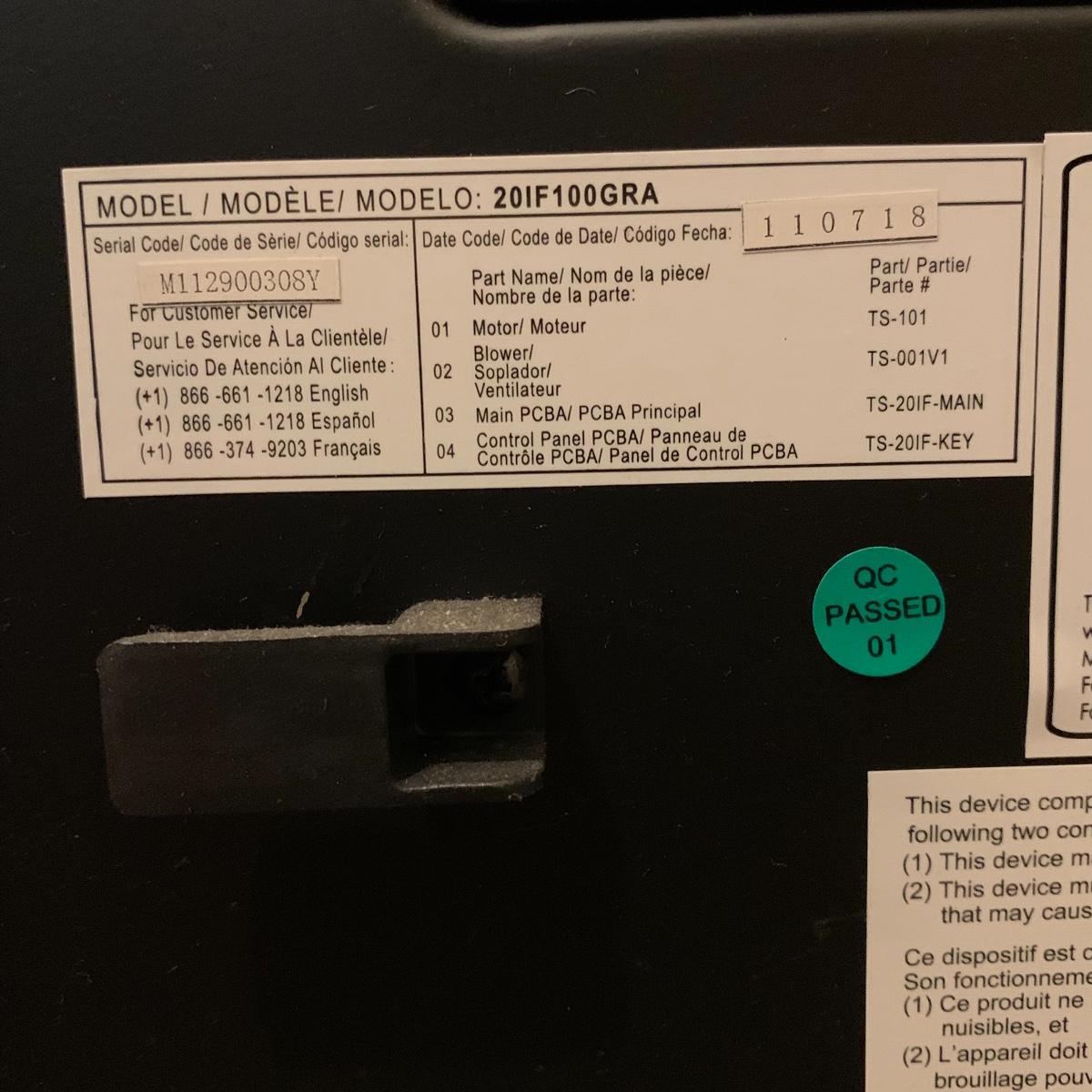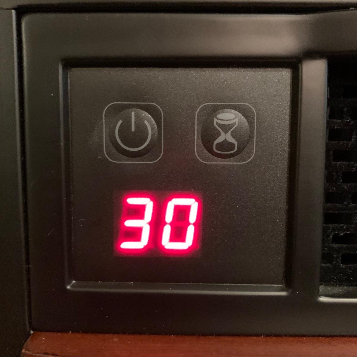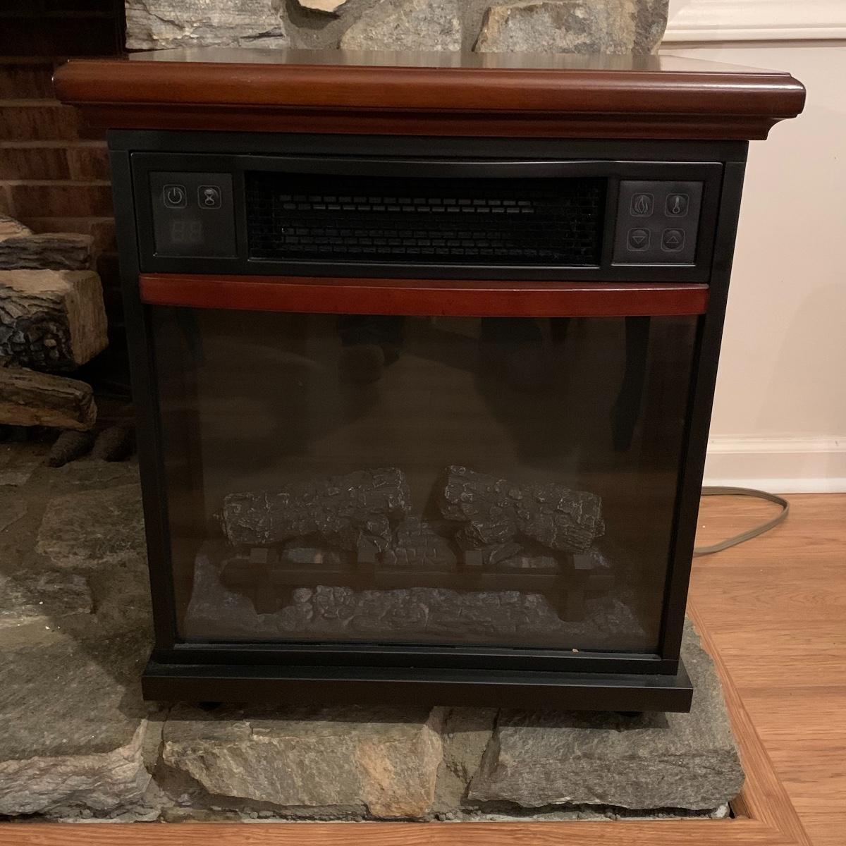 Infrared heater and electric fireplace made by Twin Star International, Model 20IF100GRA-C202. Has various settings, including a timer, a temperature setting, and a button to turn the flame on and off. Heat can come out of the top vent with or without the flame turned on. The unit is on four wheels and has a three-pronged electric plug. It measures 20” x 15” x 22”. Local Pickup Only