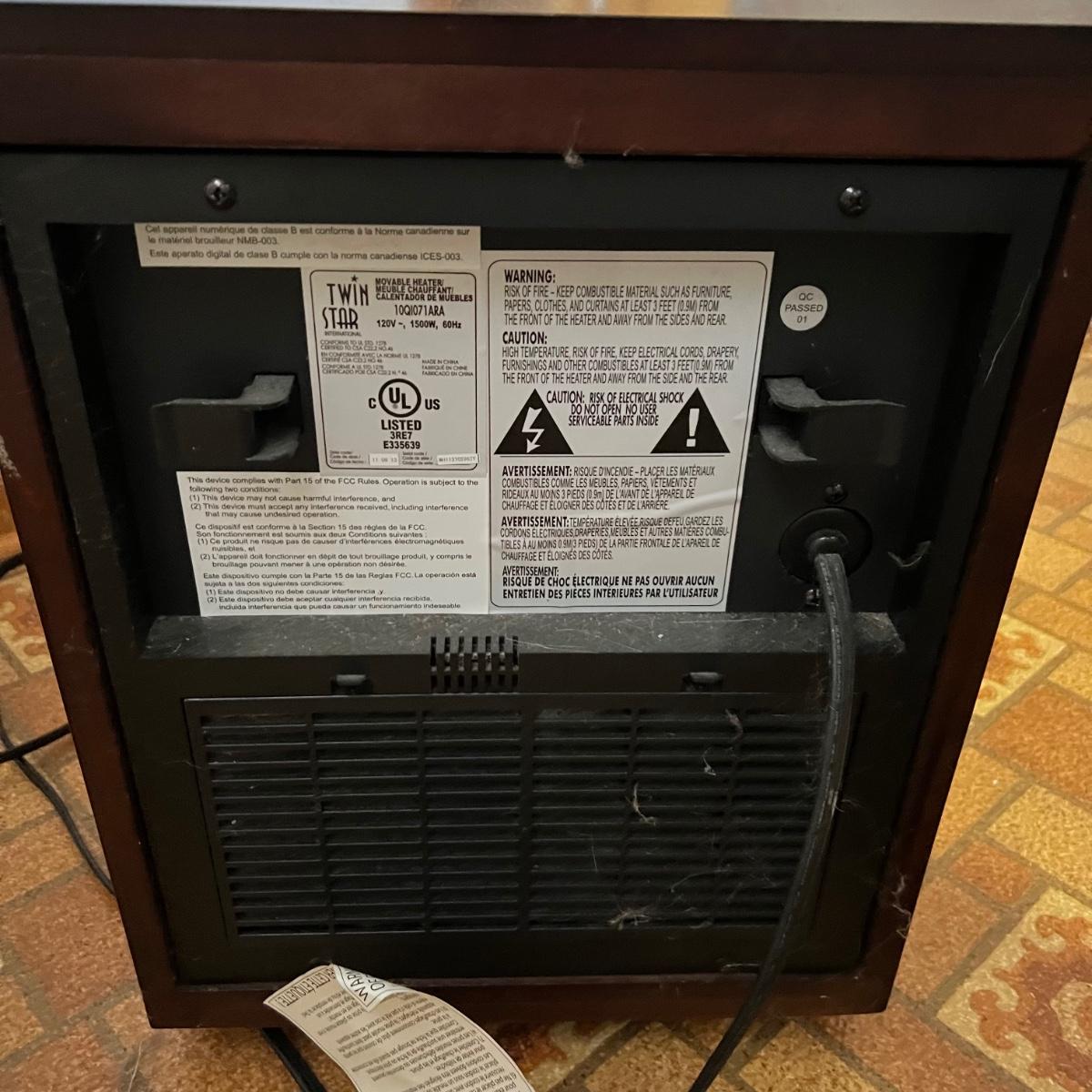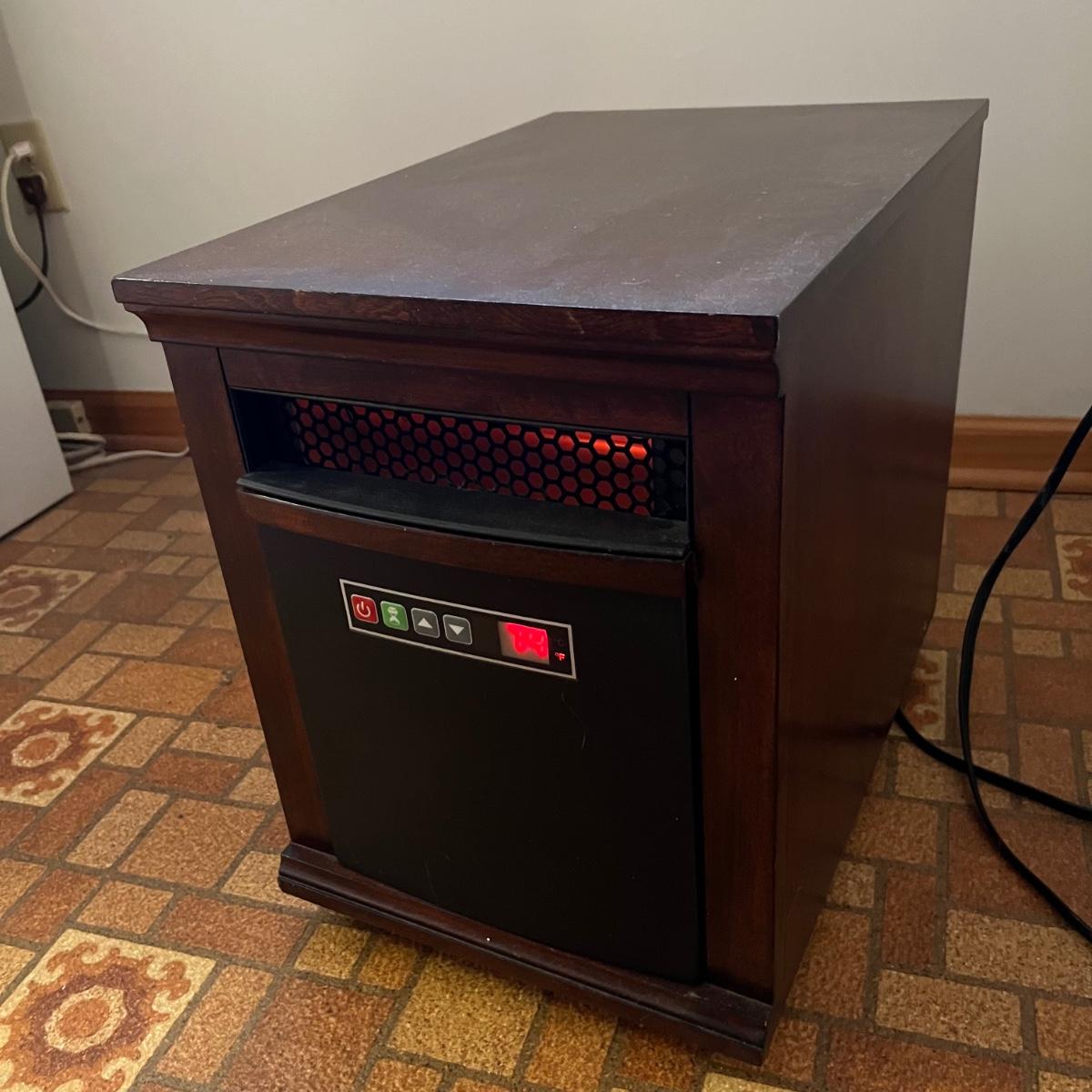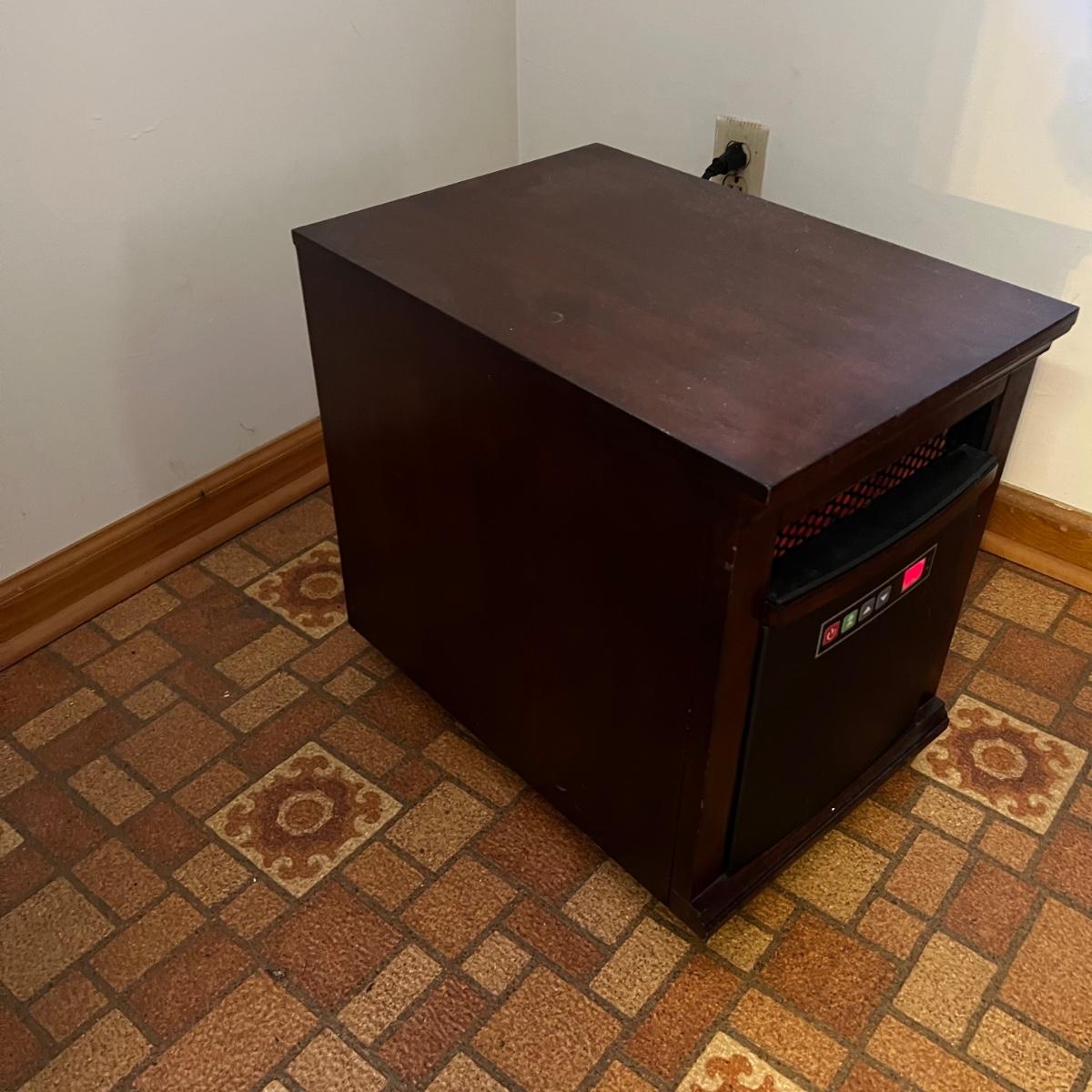 This Twin Star heater works great and kicks off some great heat. It is housed in a pressed wood surround that is a dark cherry color and measures 13.5” x 19.5” x 18”H. Unit is on plastic casters.