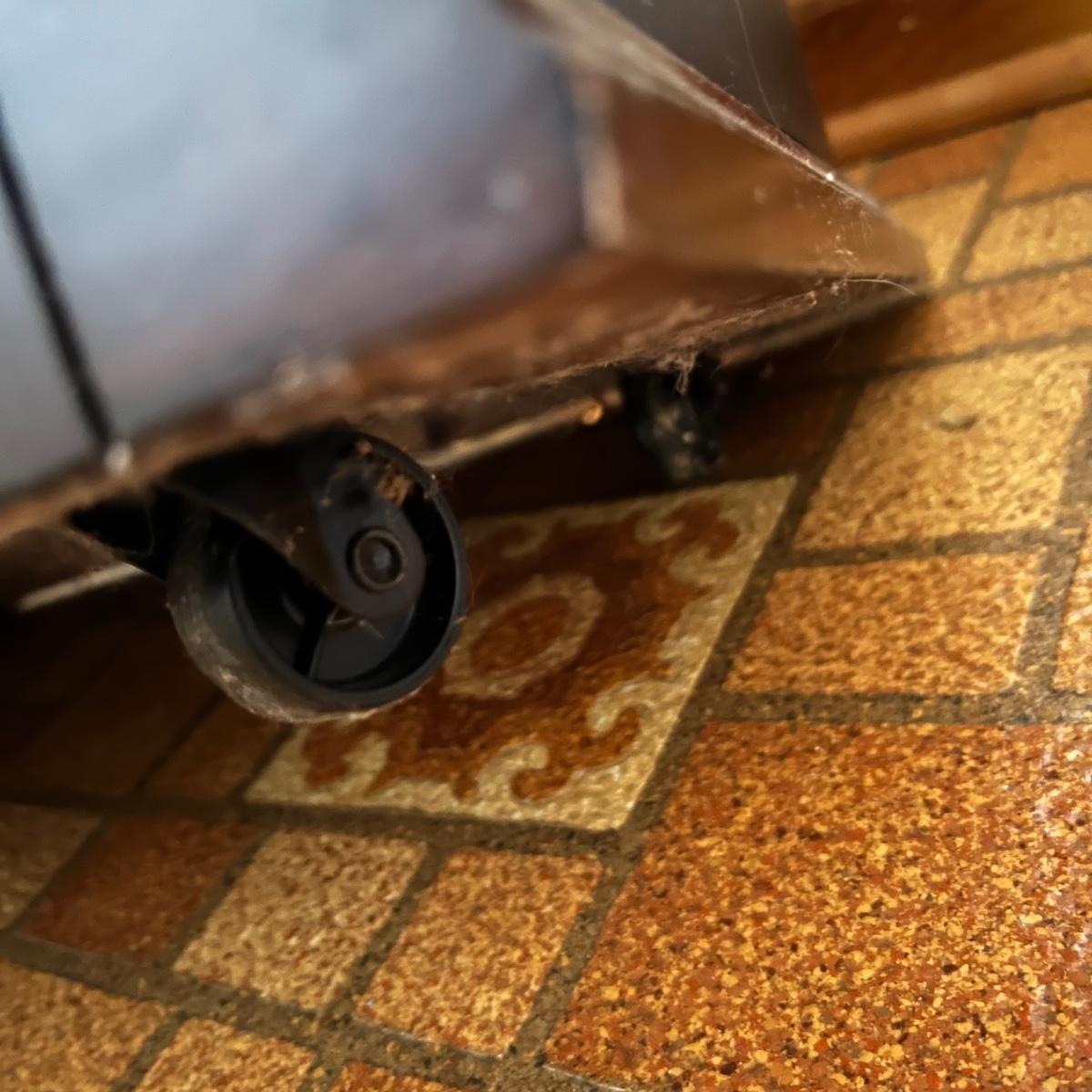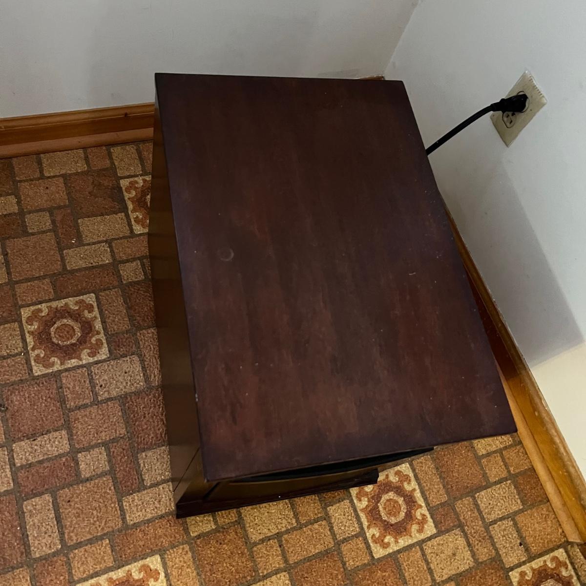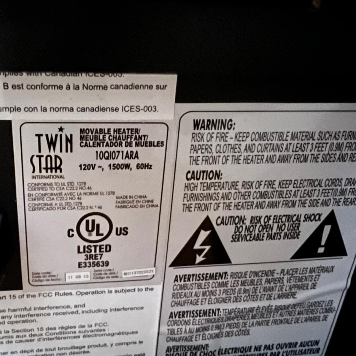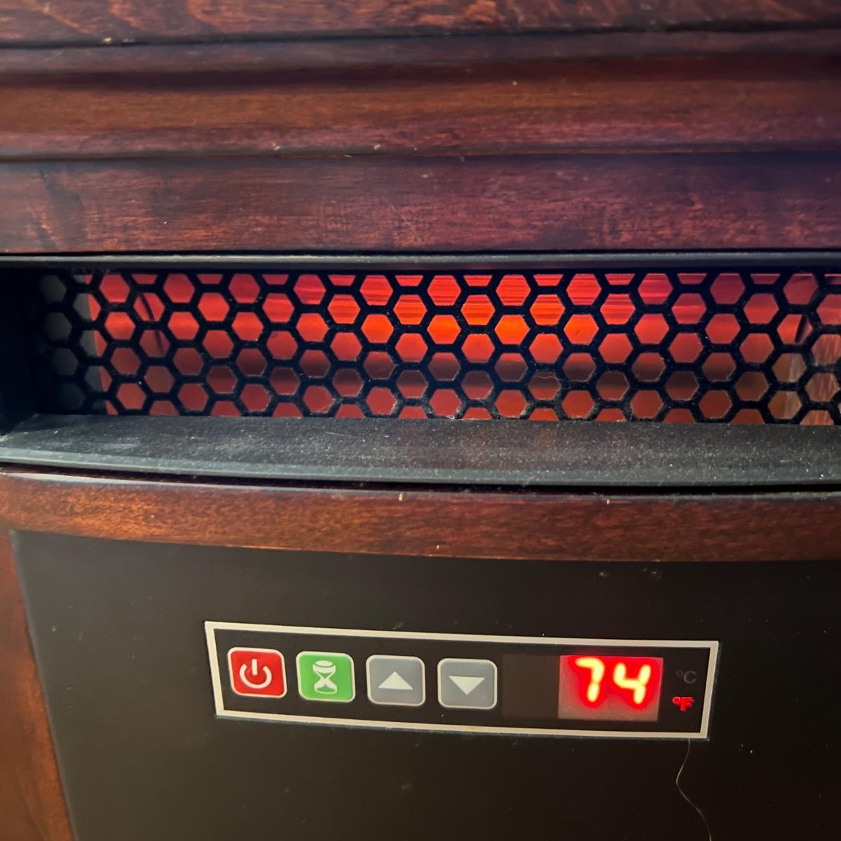 This Twin Star heater works great and kicks off some great heat. It is housed in a pressed wood surround that is a dark cherry color and measures 13.5” x 19.5” x 18”H. Unit is on plastic casters.
