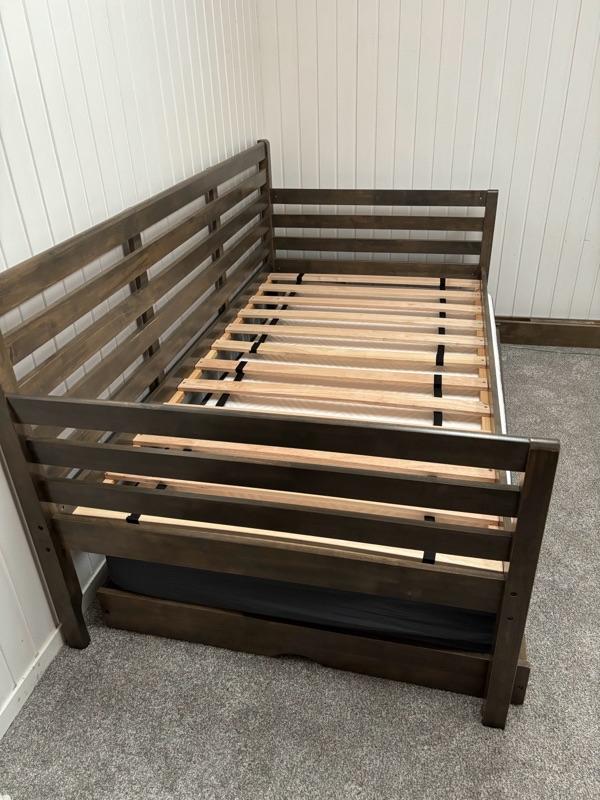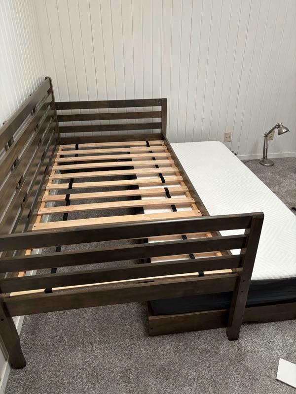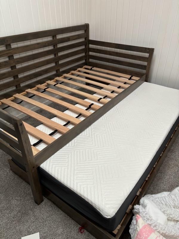 One mattress is not shown. Both are very nice gel top. The trundle slides smoothly