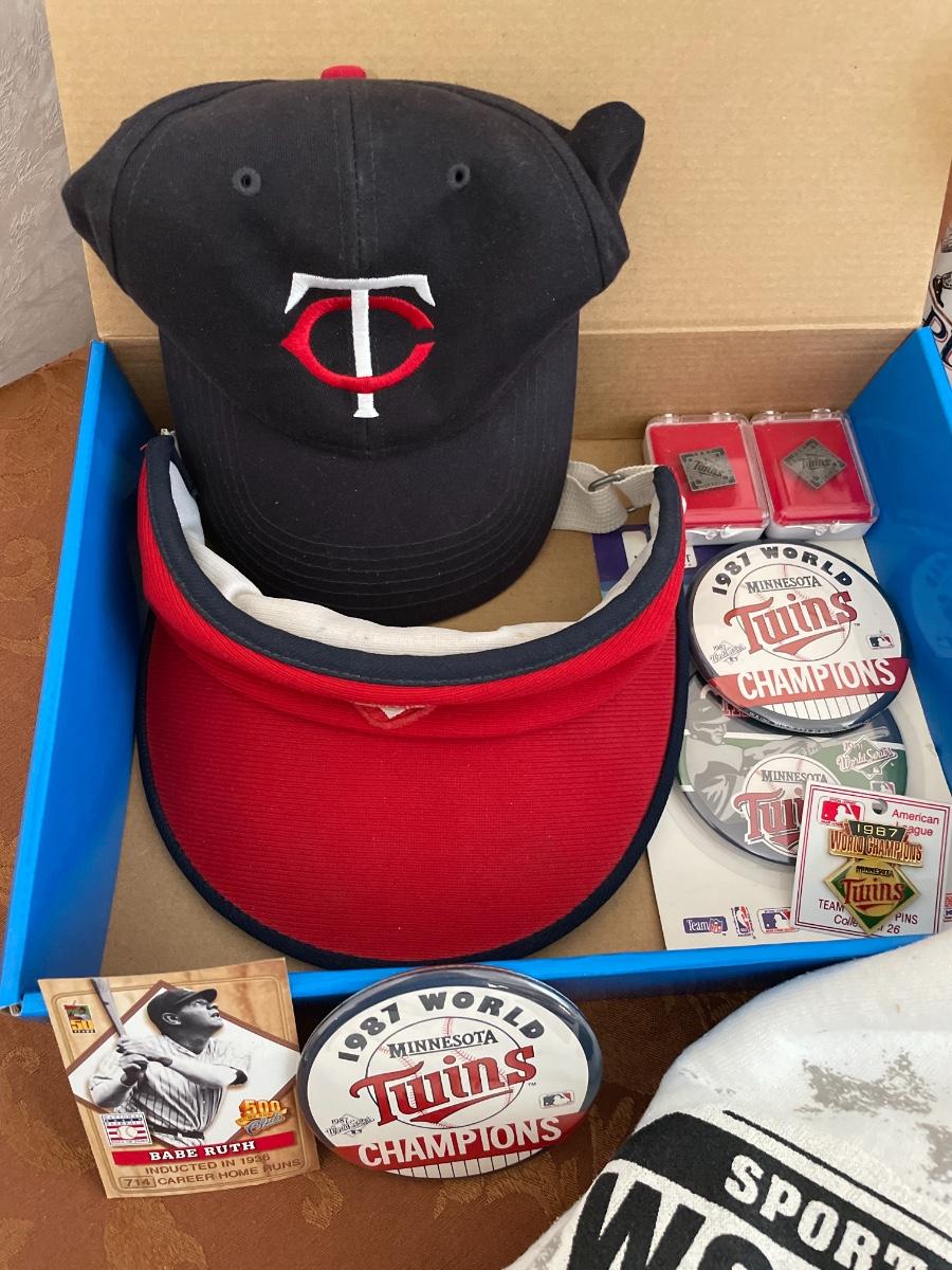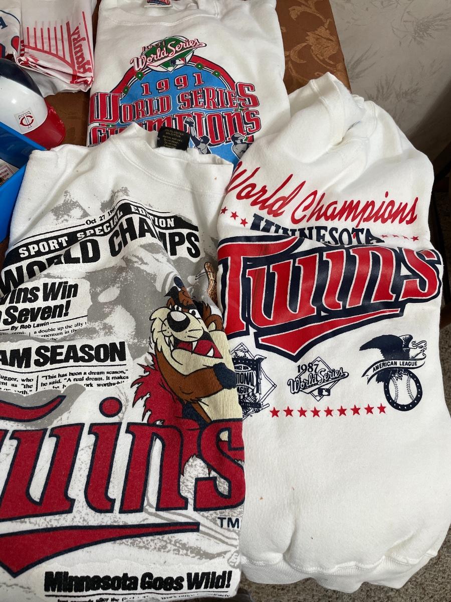 Vintage MN Twins collection includes 3 size M sweatshirts, cup, pins, hat, visor and boxes
