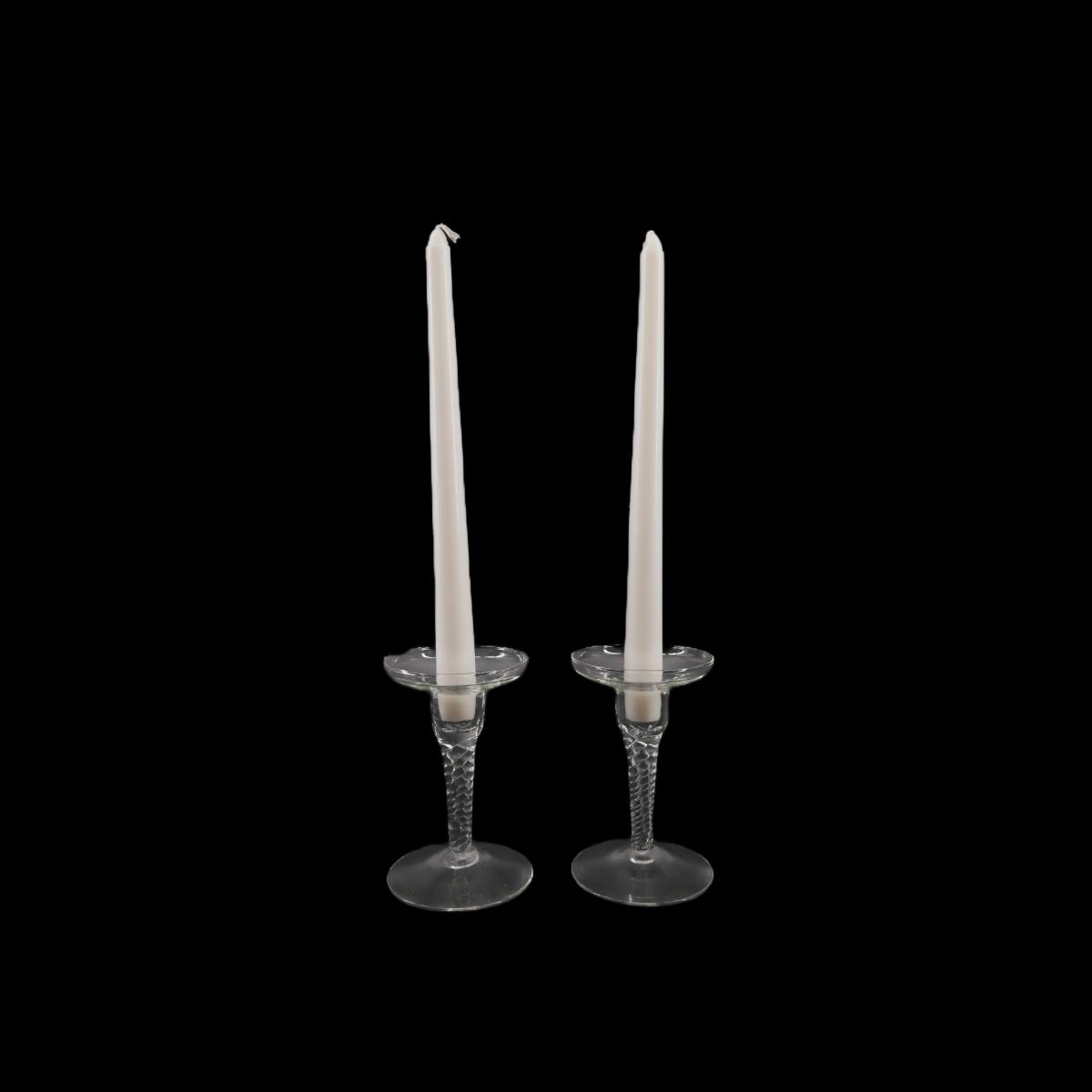 Two beautiful candlesticks with a twist stems. Each measures L 3" x H 4.5". Excellent condition, no issues found. Candles not included. Lot weighs 8 oz. (D100)