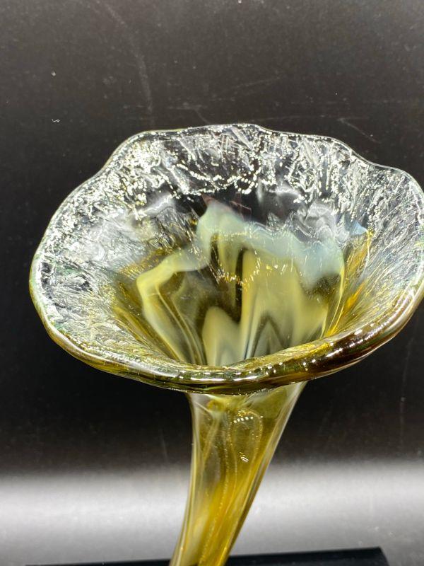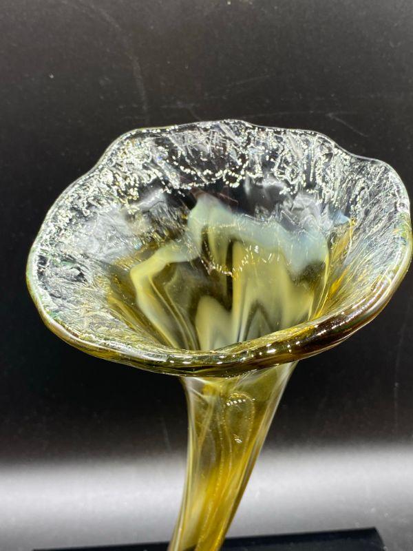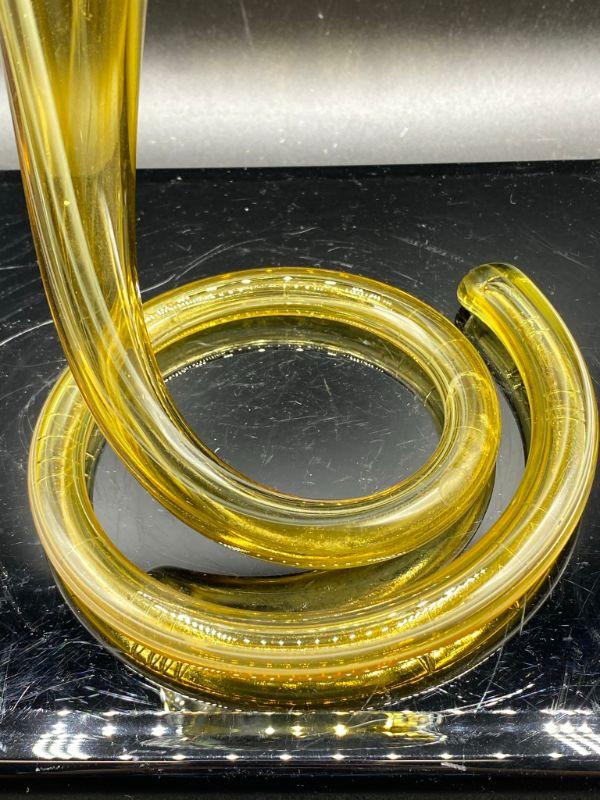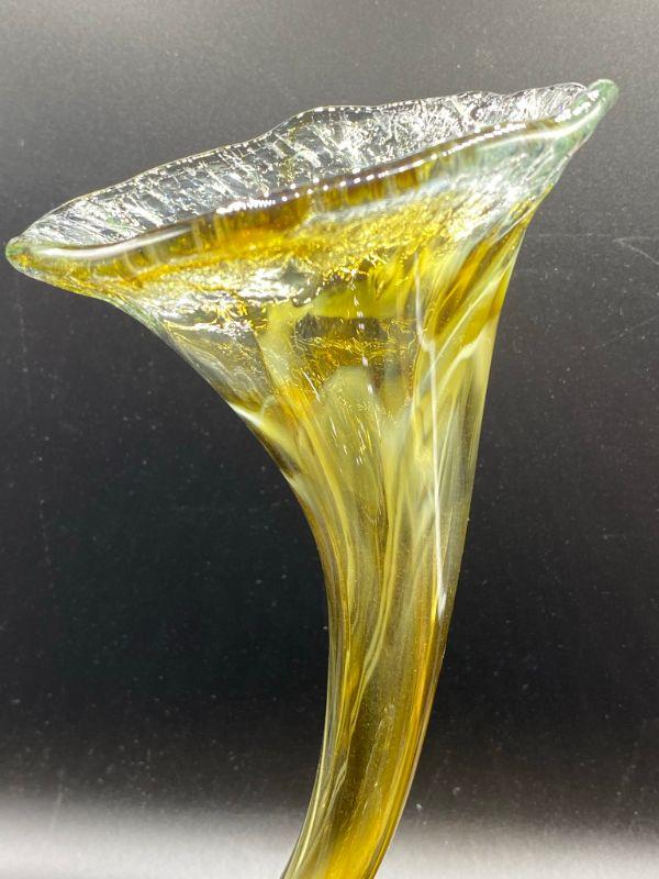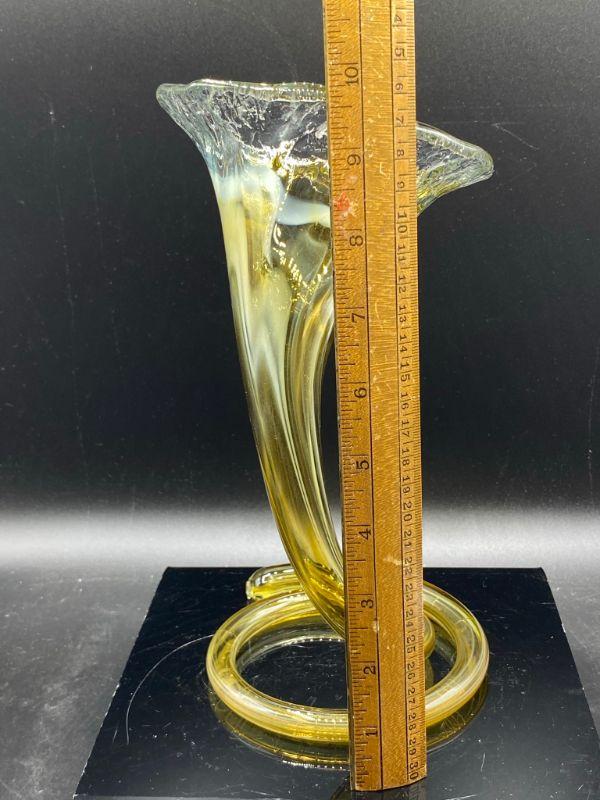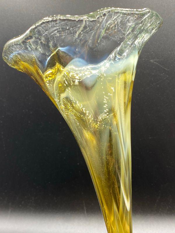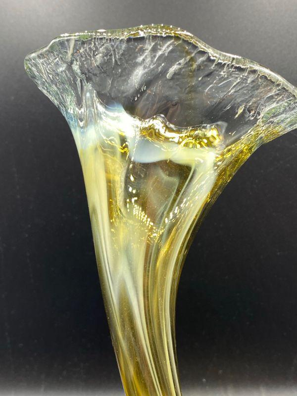 Interesting yellow art glass vase. Has a coil bottom to a fluted opening. Yellow art glass with a whispy white mixed in. Displays wonderfully. Good Condition. Stands 10".