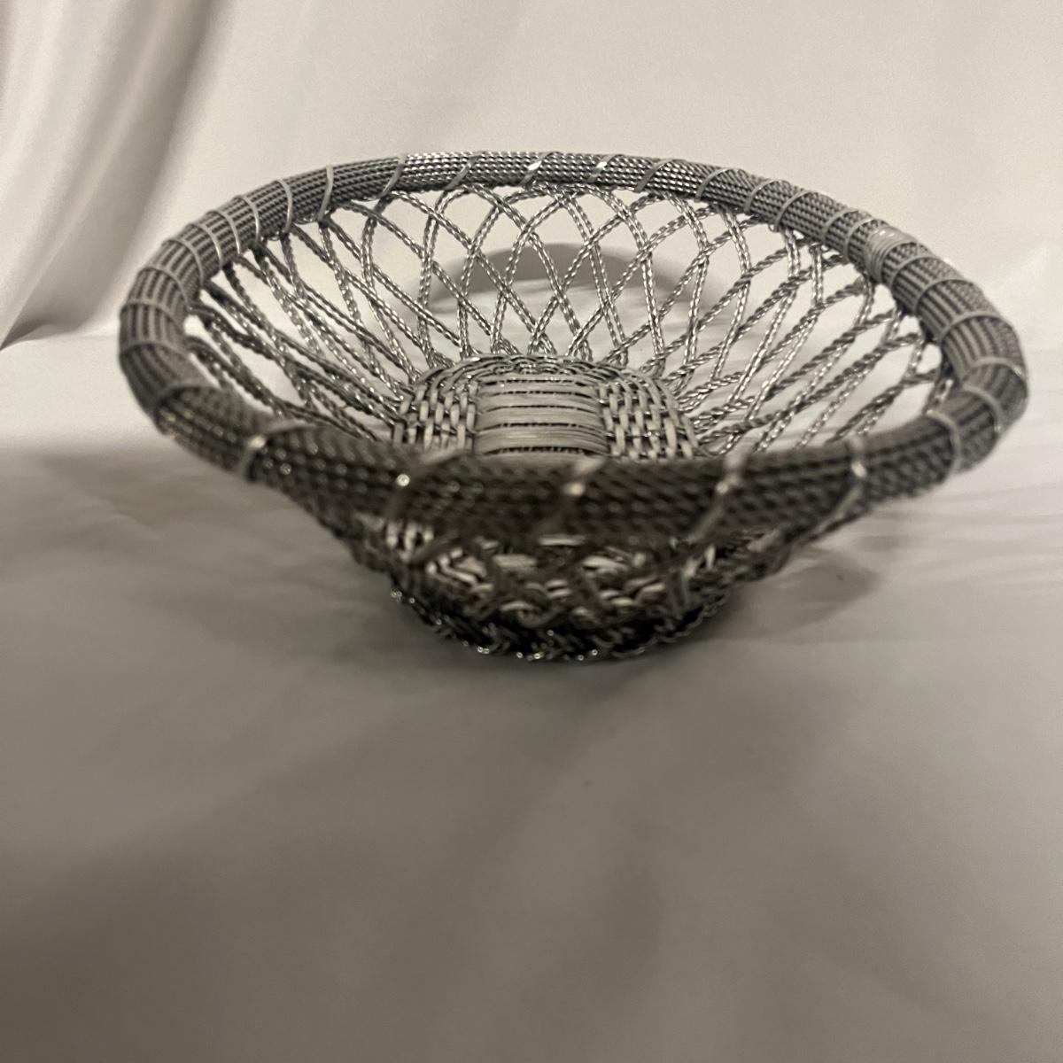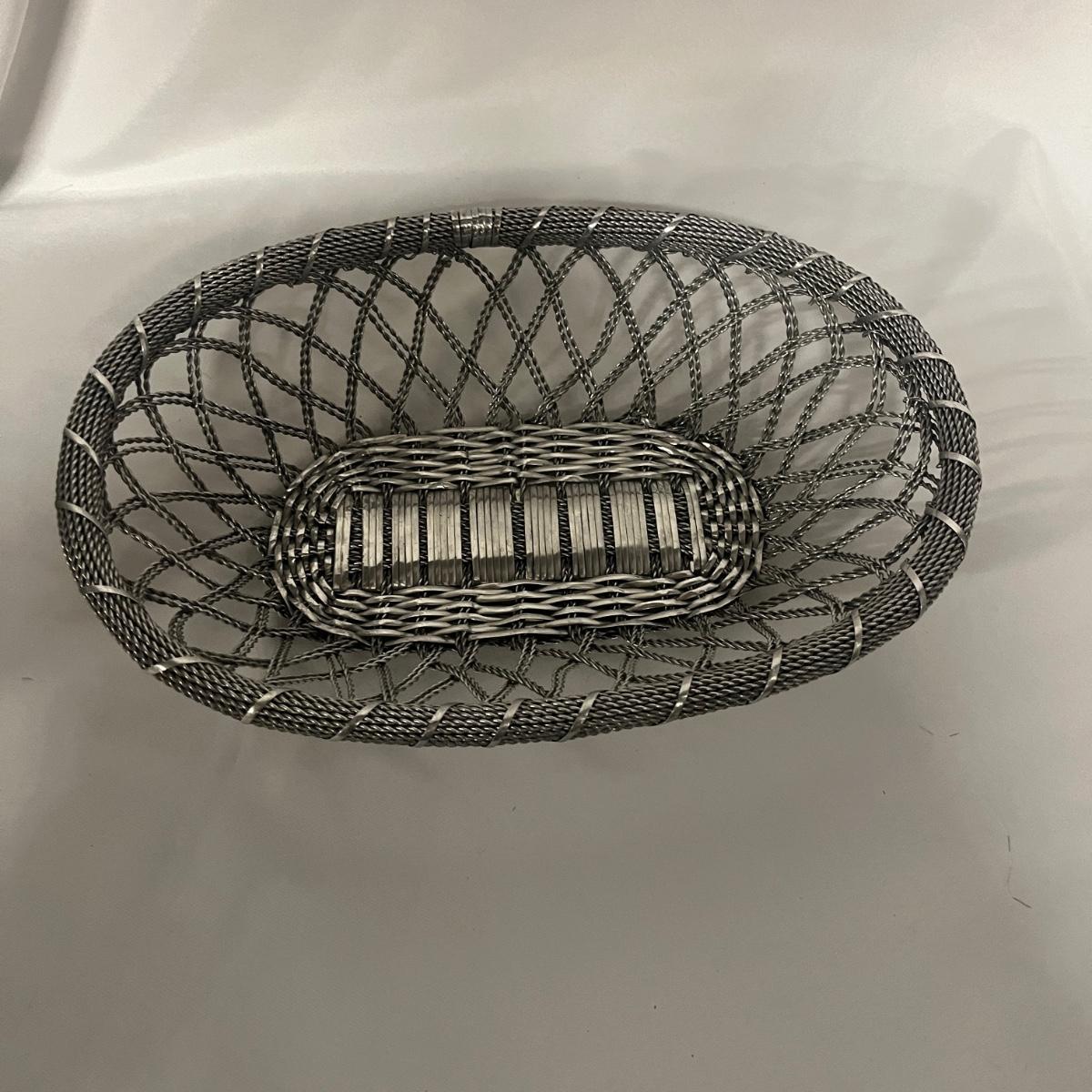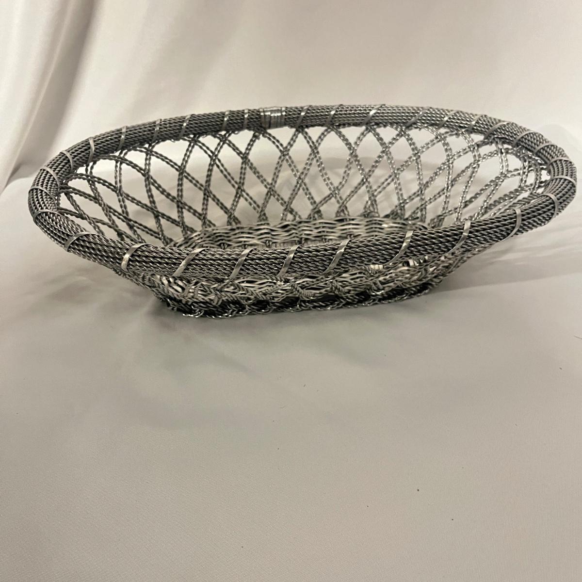 Two decorative wire baskets in this lot. The twisted metal bread basket measures 15” x 10” x 4”H. Also includes a basket style tray with a metal frame and handles with multi colored beads.