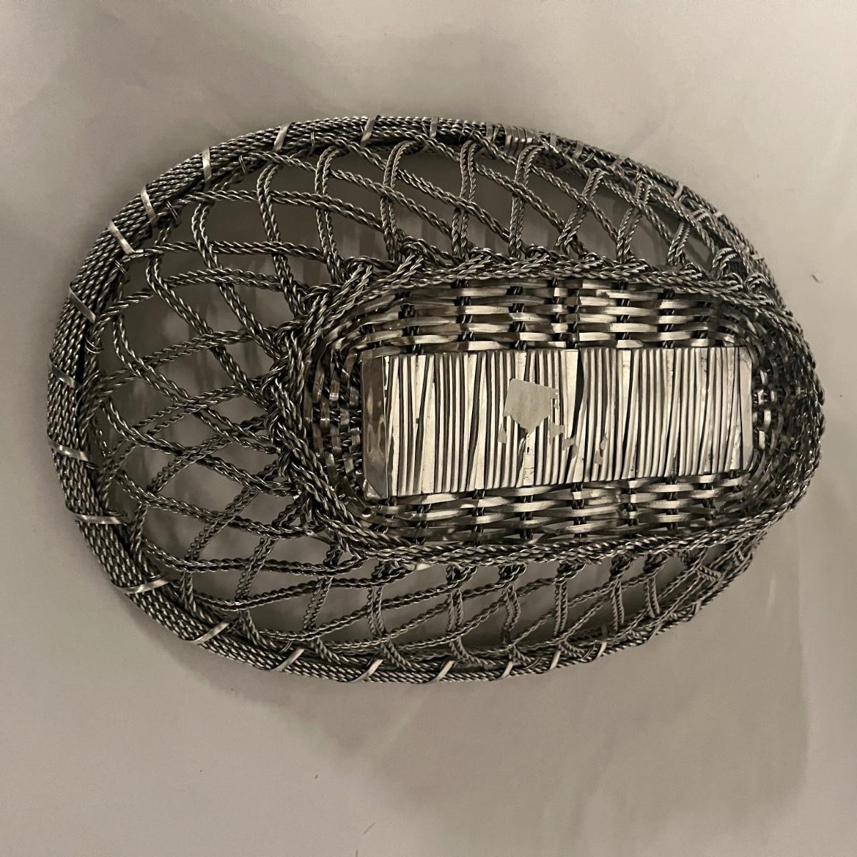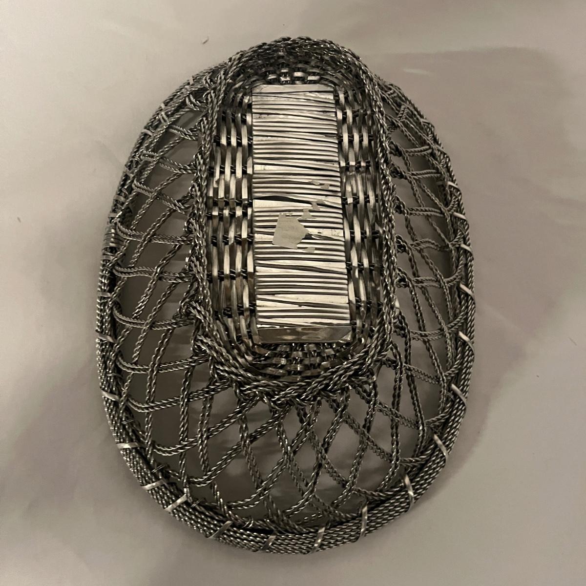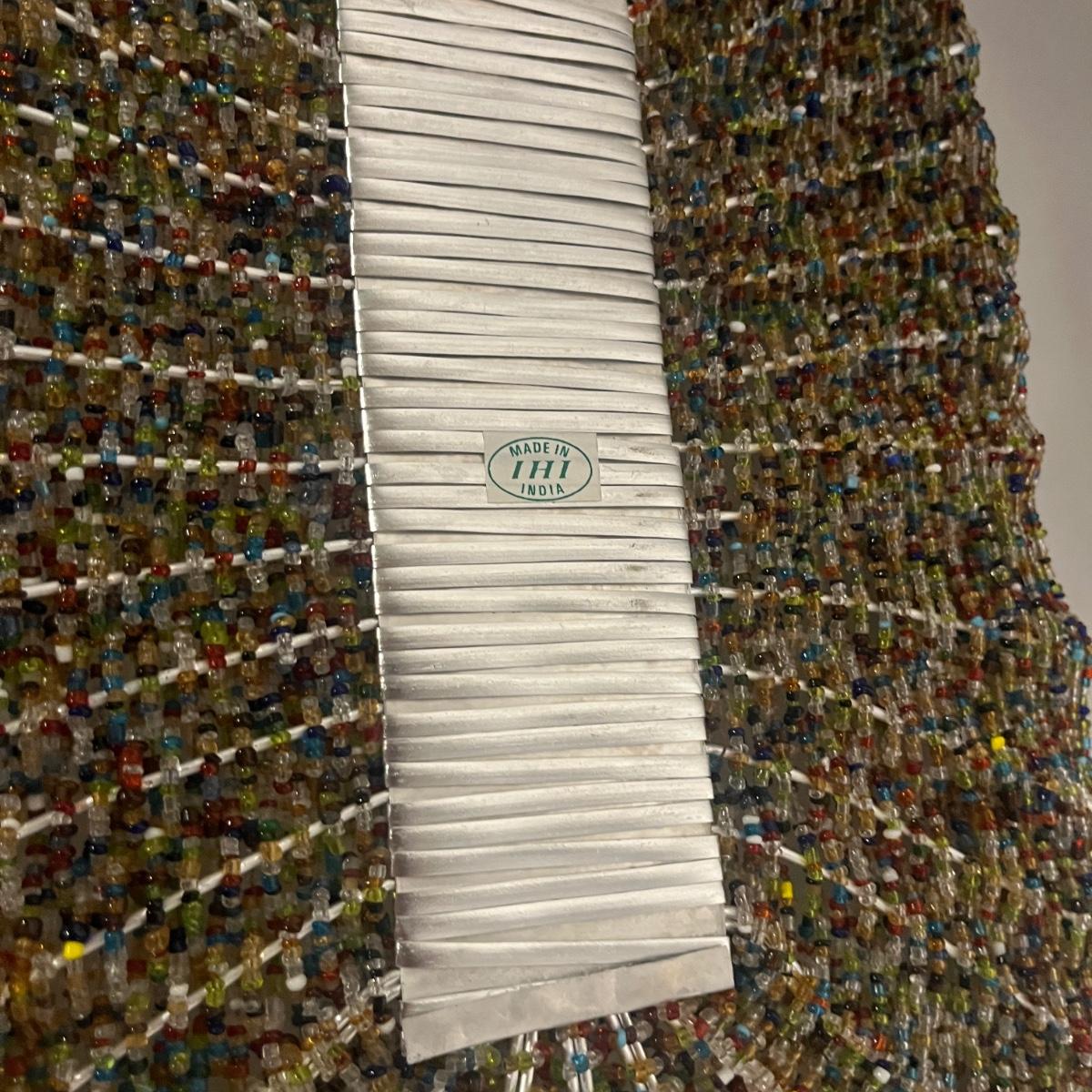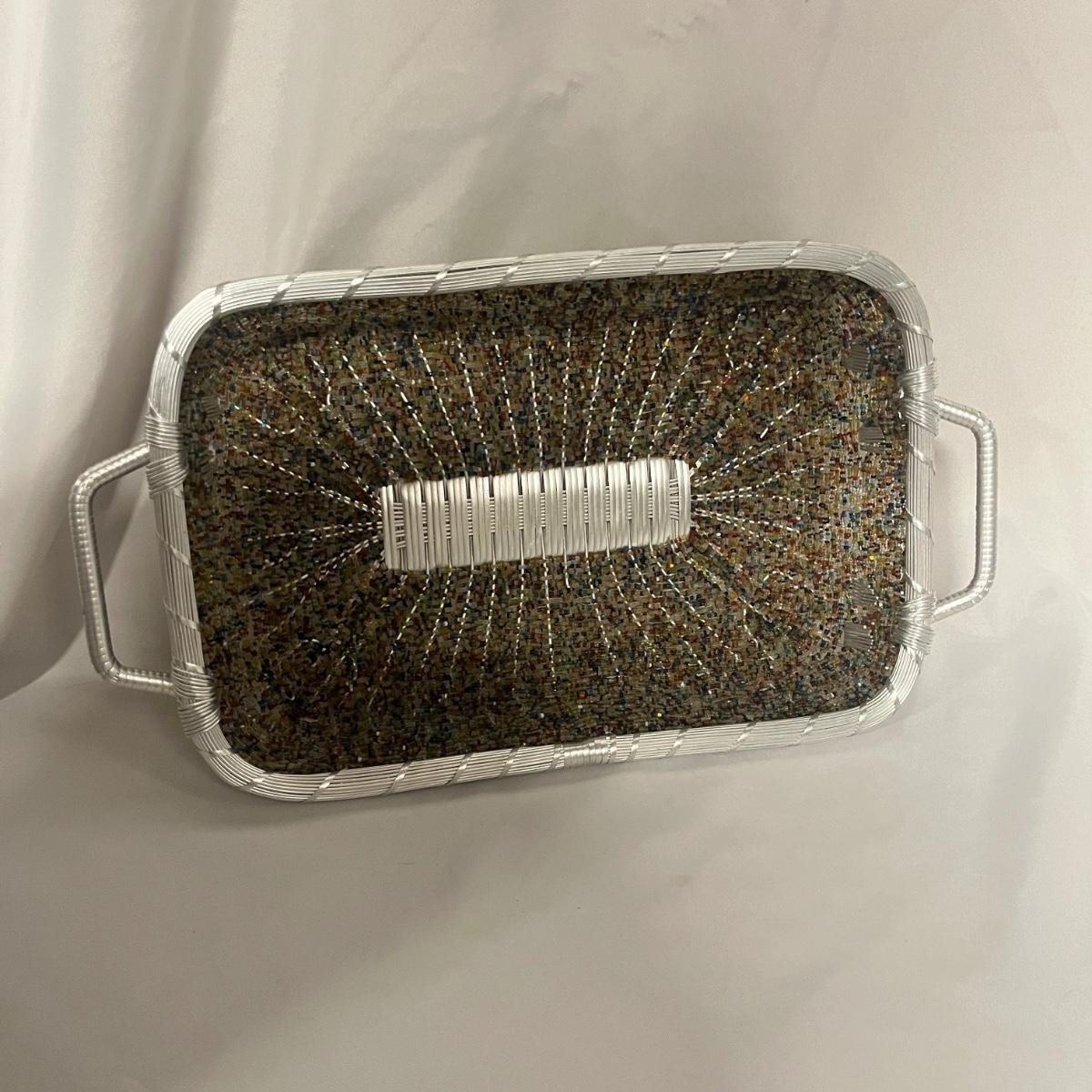 Two decorative wire baskets in this lot. The twisted metal bread basket measures 15” x 10” x 4”H. Also includes a basket style tray with a metal frame and handles with multi colored beads.