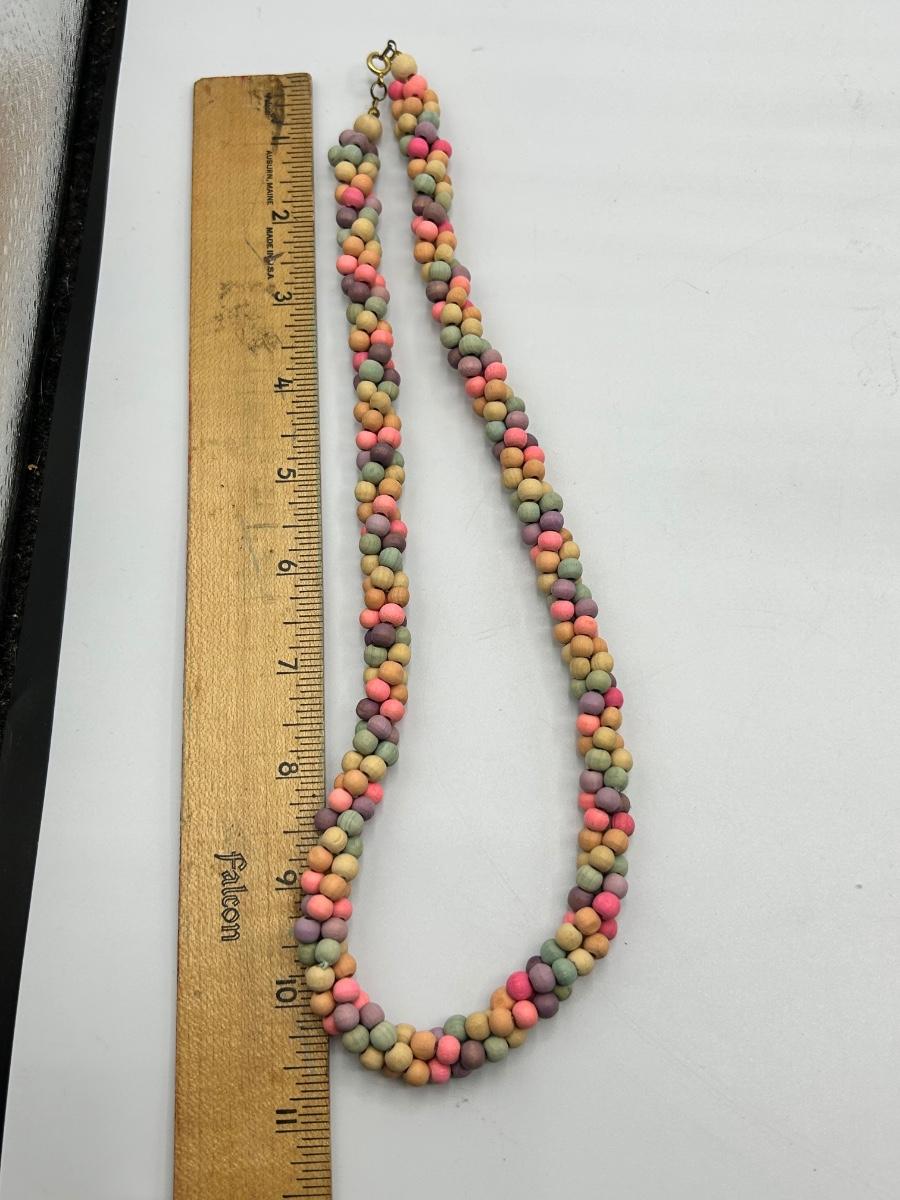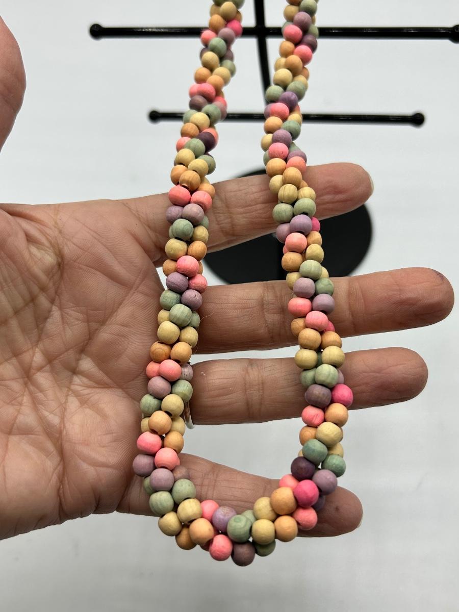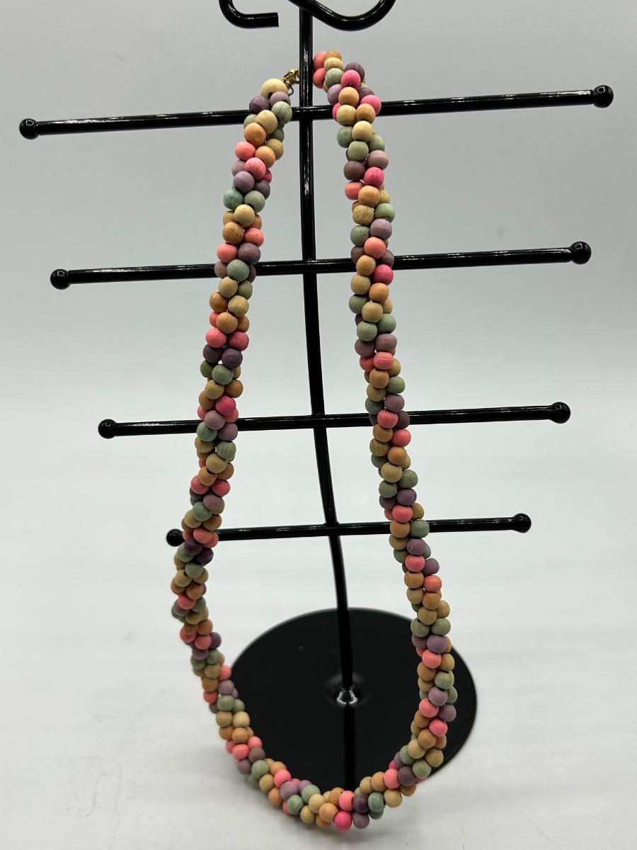 Twisted Strand Pastel Painted Wooden Bead Necklace. Three strands of pastel-colored wooden beads twisted together.