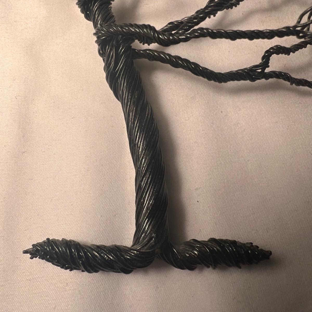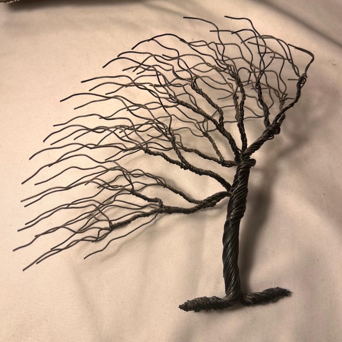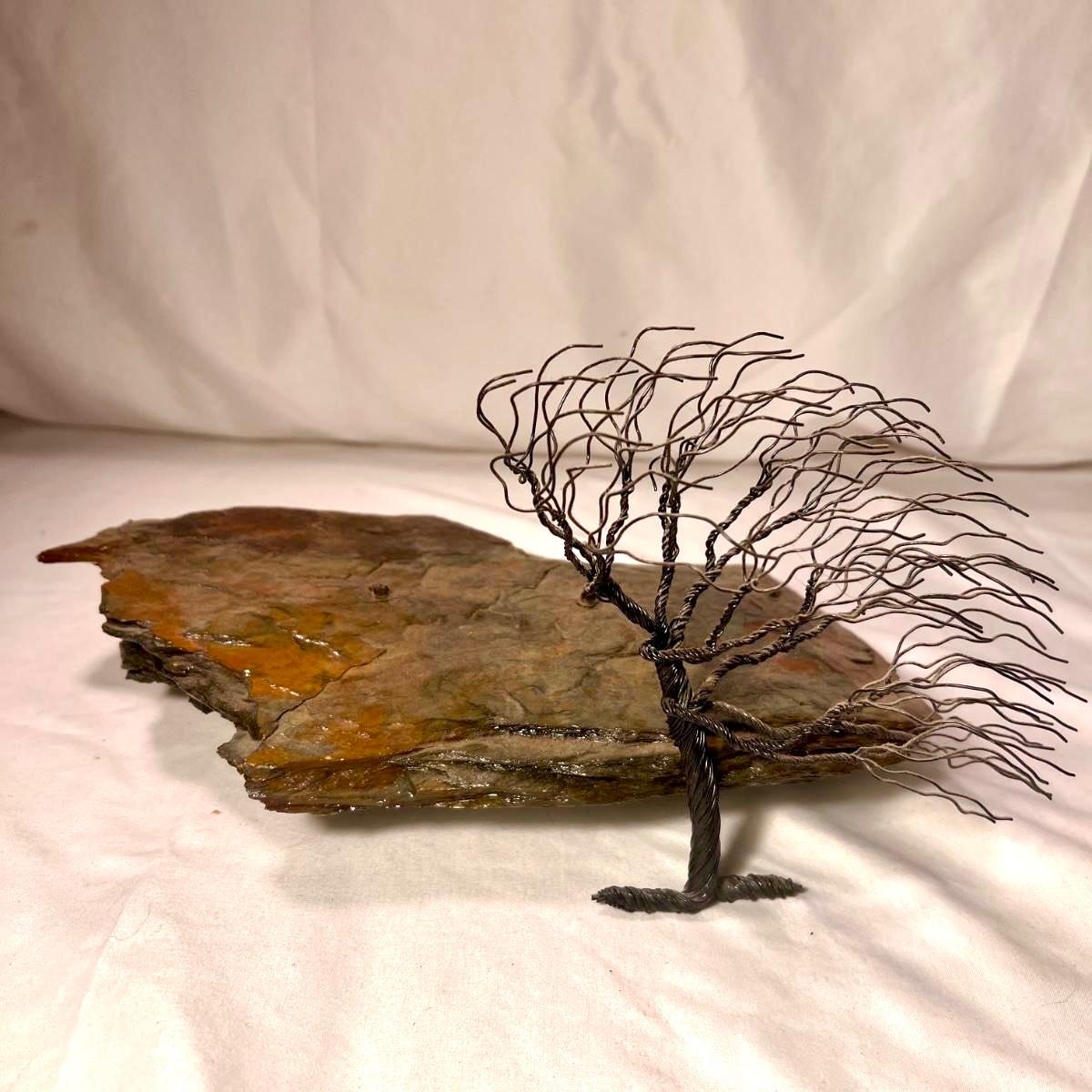 This beautiful handmade twisted wire tree has a wind-blown movement. Made up from lots of twisted wires, it measures 6” x 6”H. The slate stone oil candle has two wicks and a glass oil holder underneath.