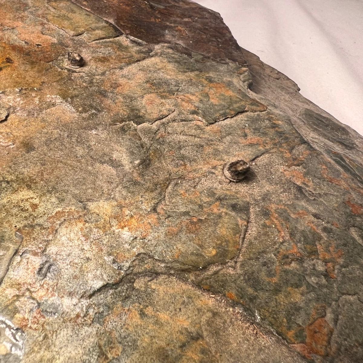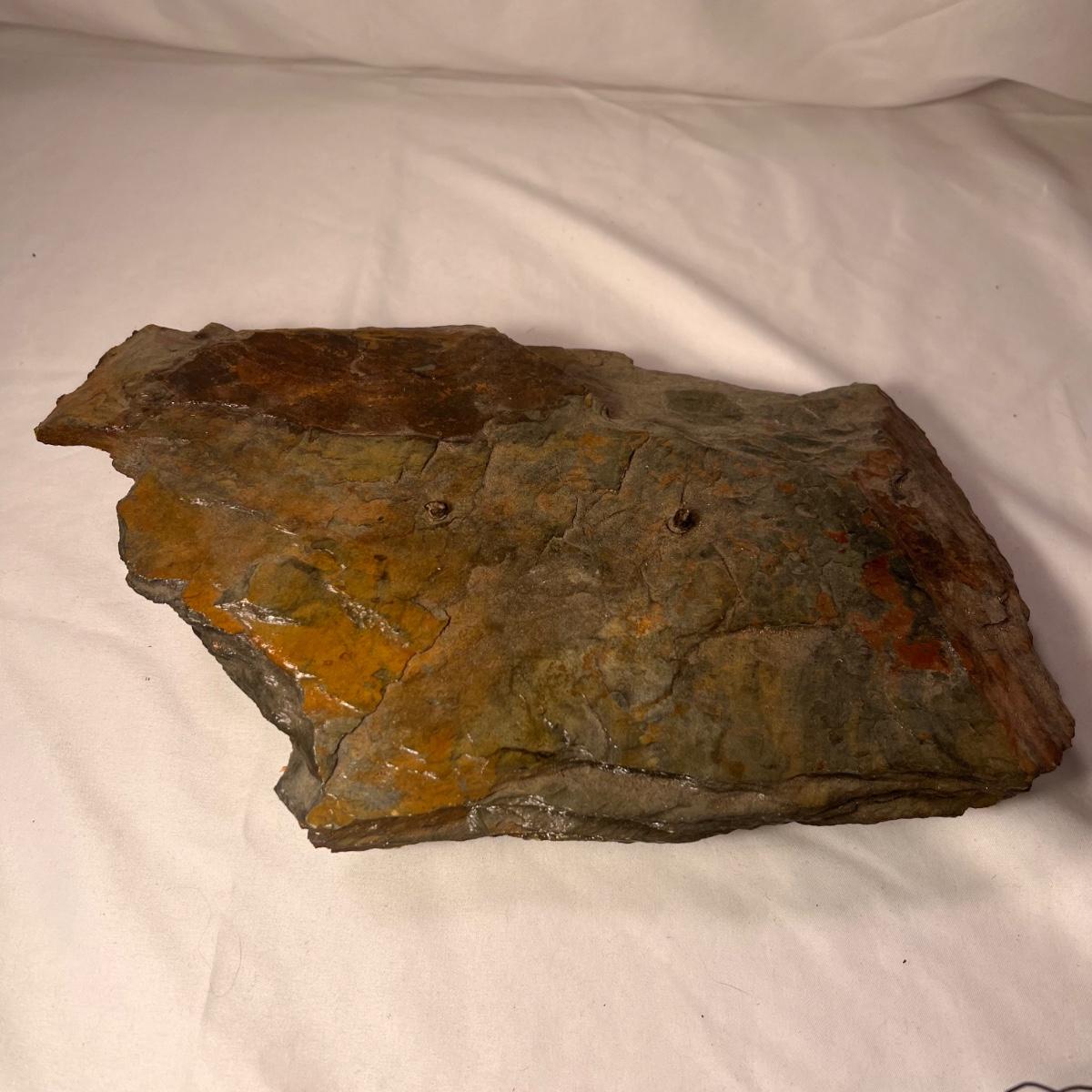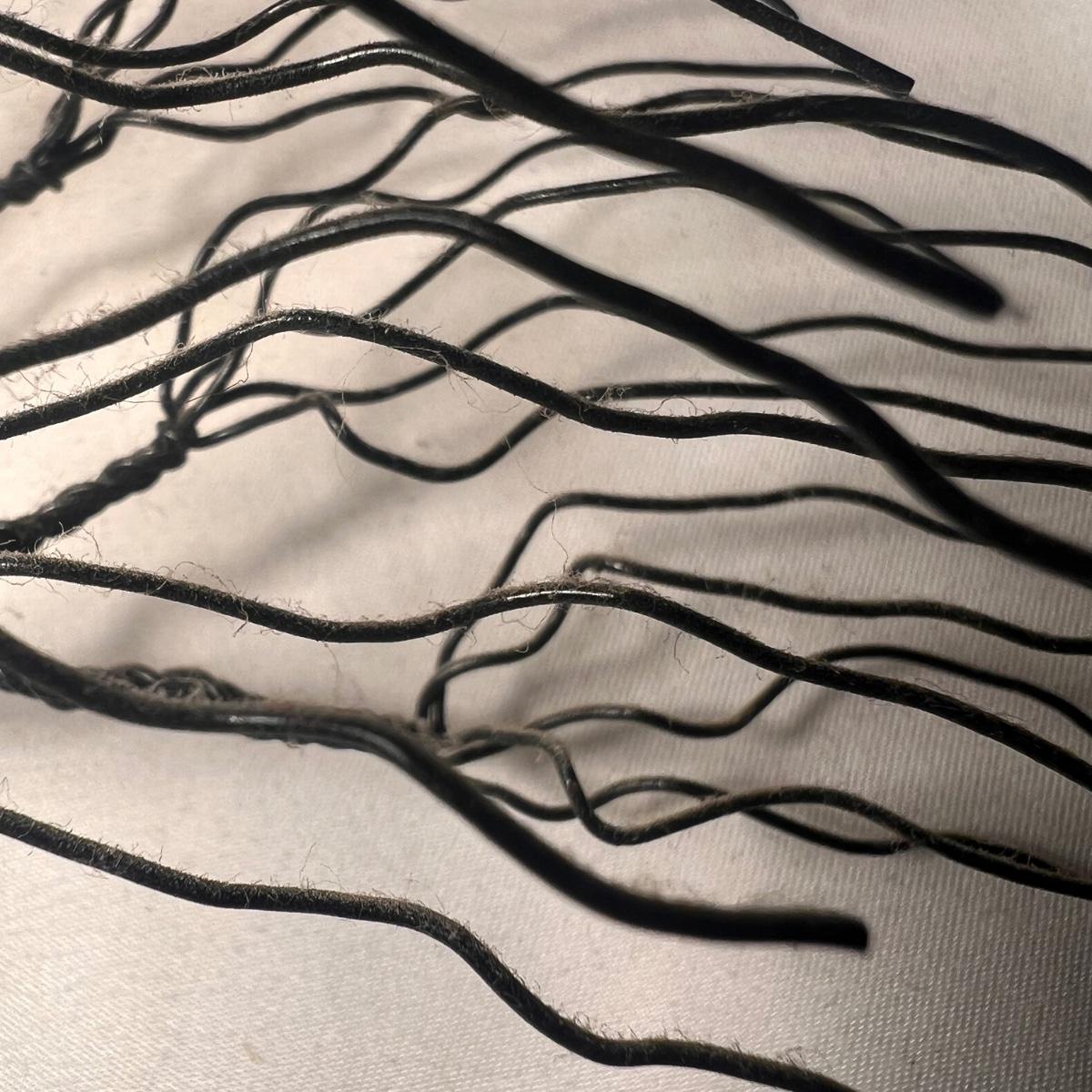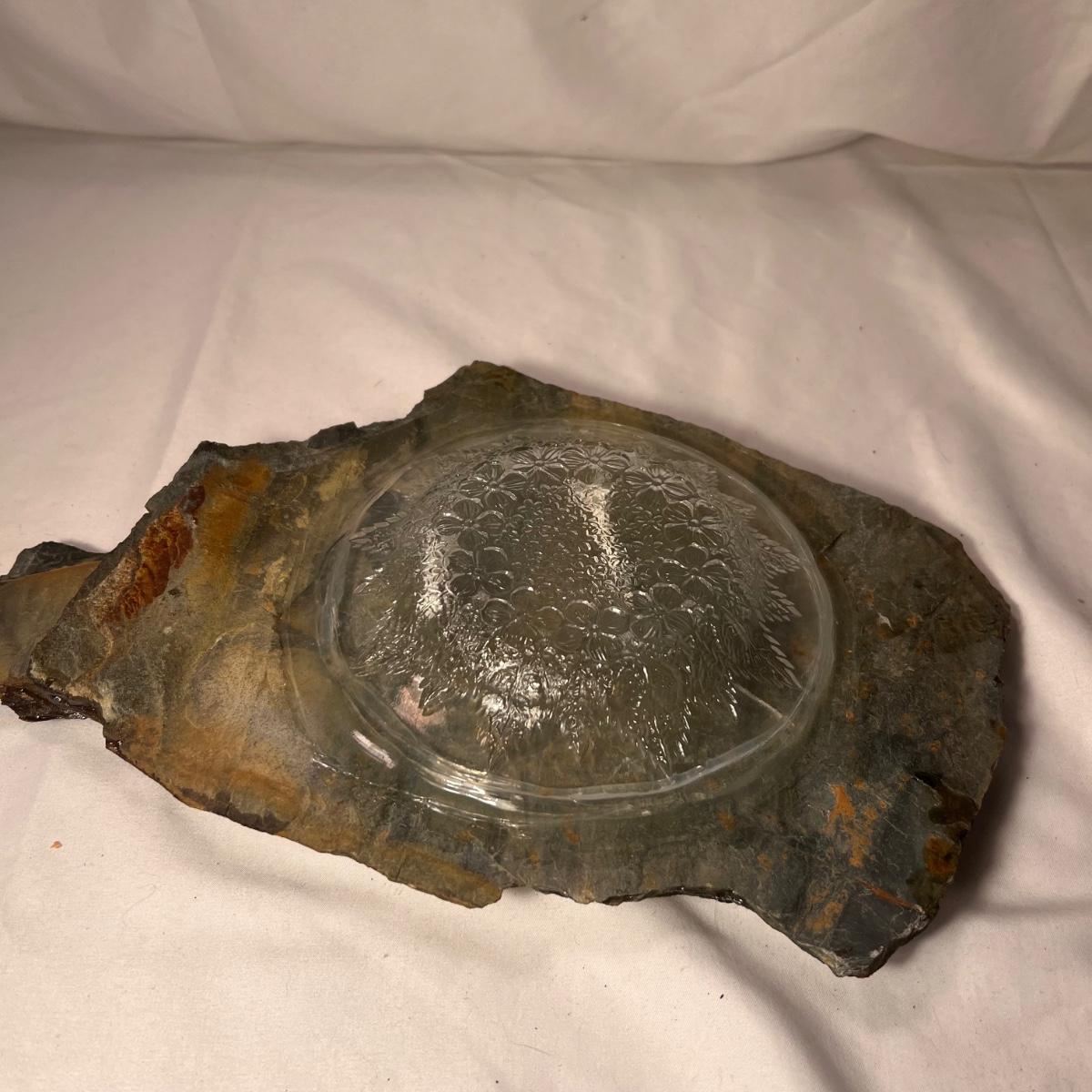 This beautiful handmade twisted wire tree has a wind-blown movement. Made up from lots of twisted wires, it measures 6” x 6”H. The slate stone oil candle has two wicks and a glass oil holder underneath.