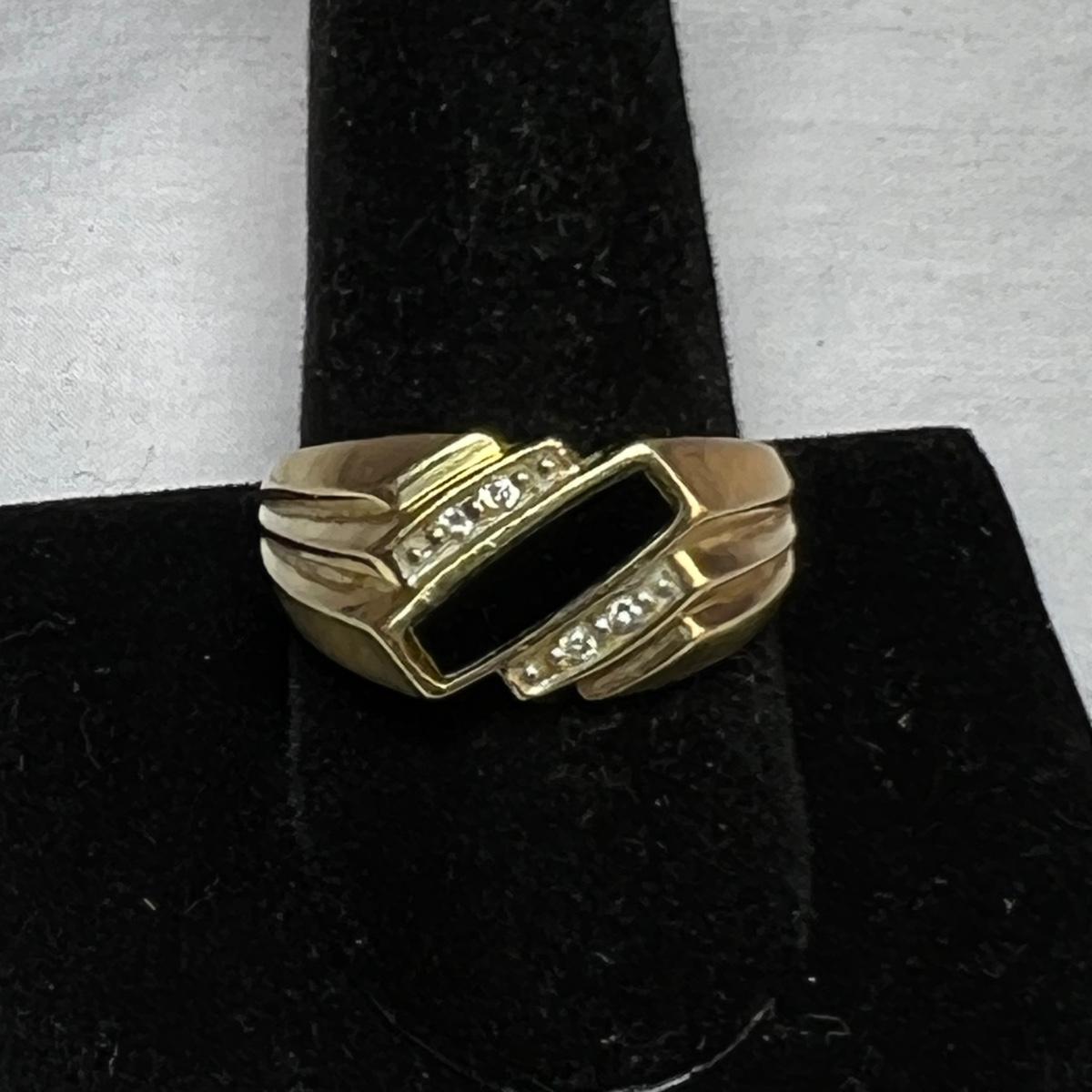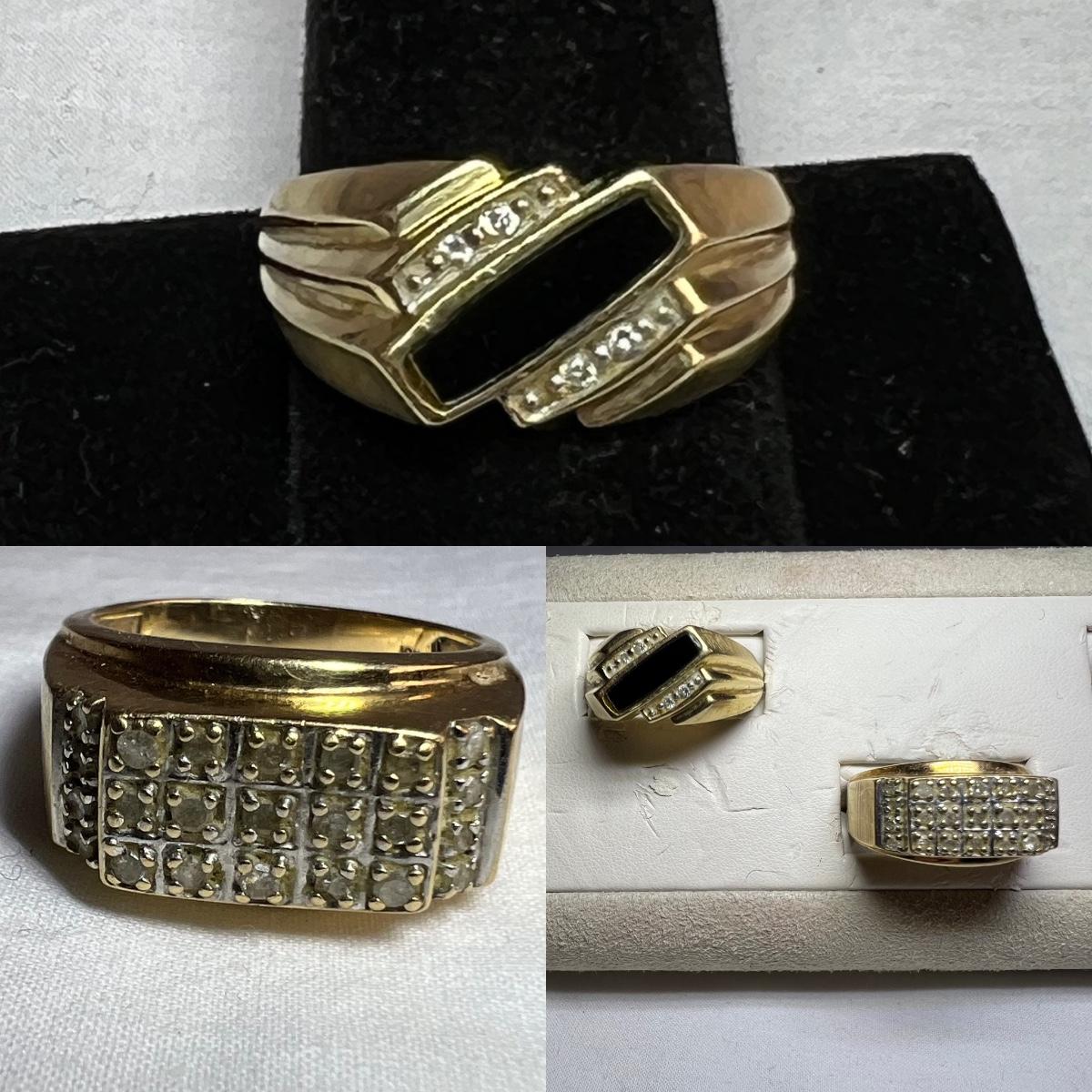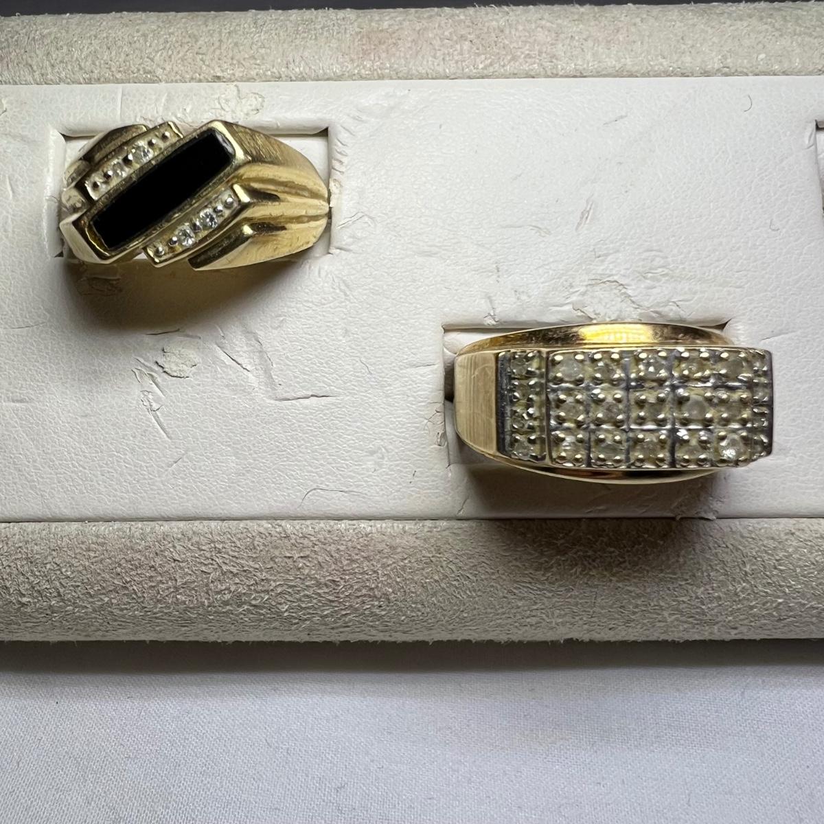 Both of these two men’s rings are stamped 10K and the diamonds tested positive on our tester. One ring also has a black onyx stone. See the images for sizes. All sales are final, no refunds so please bid accordingly.