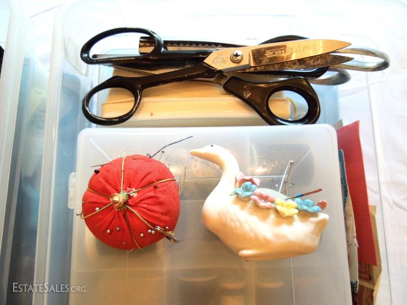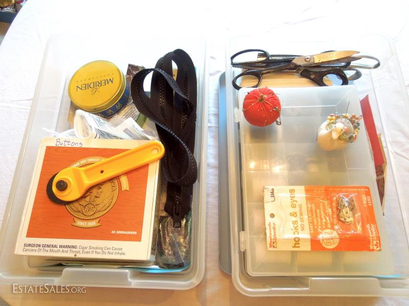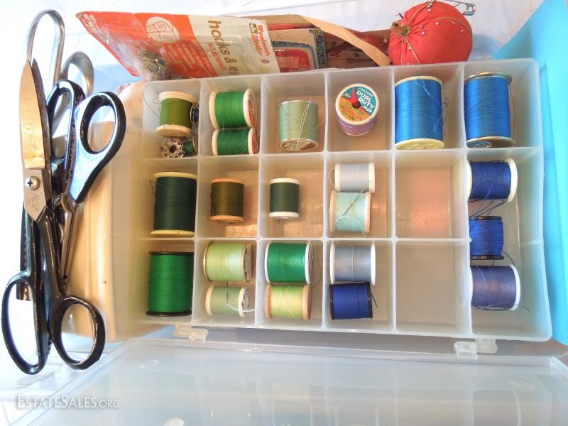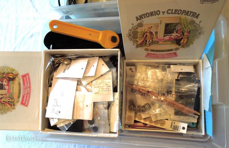 Some vintage items, buttons, thread, pinking shears, rotary cutter and much more.