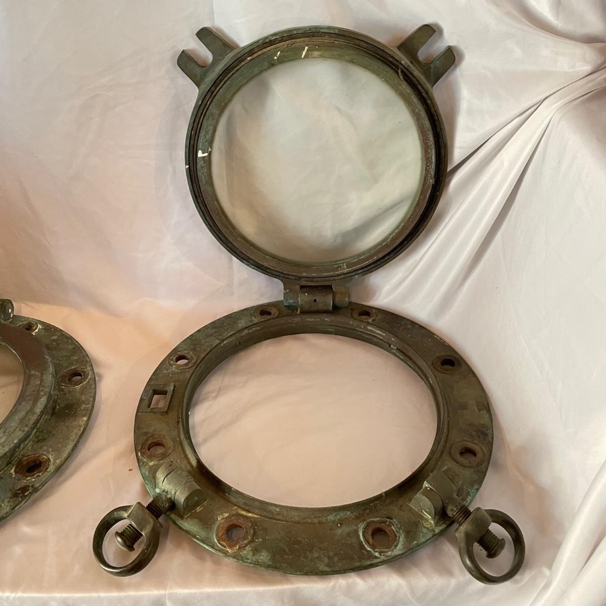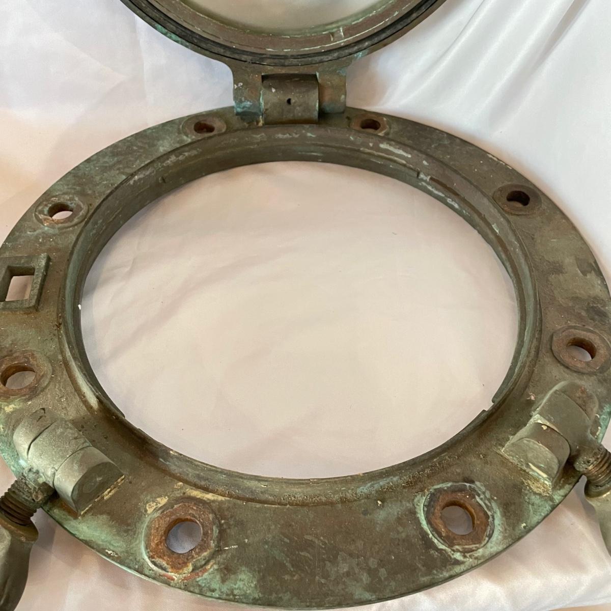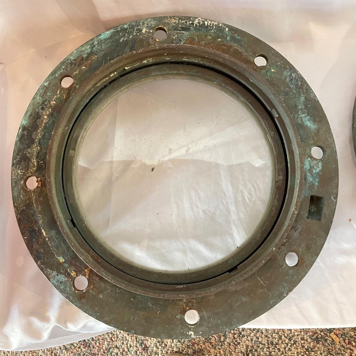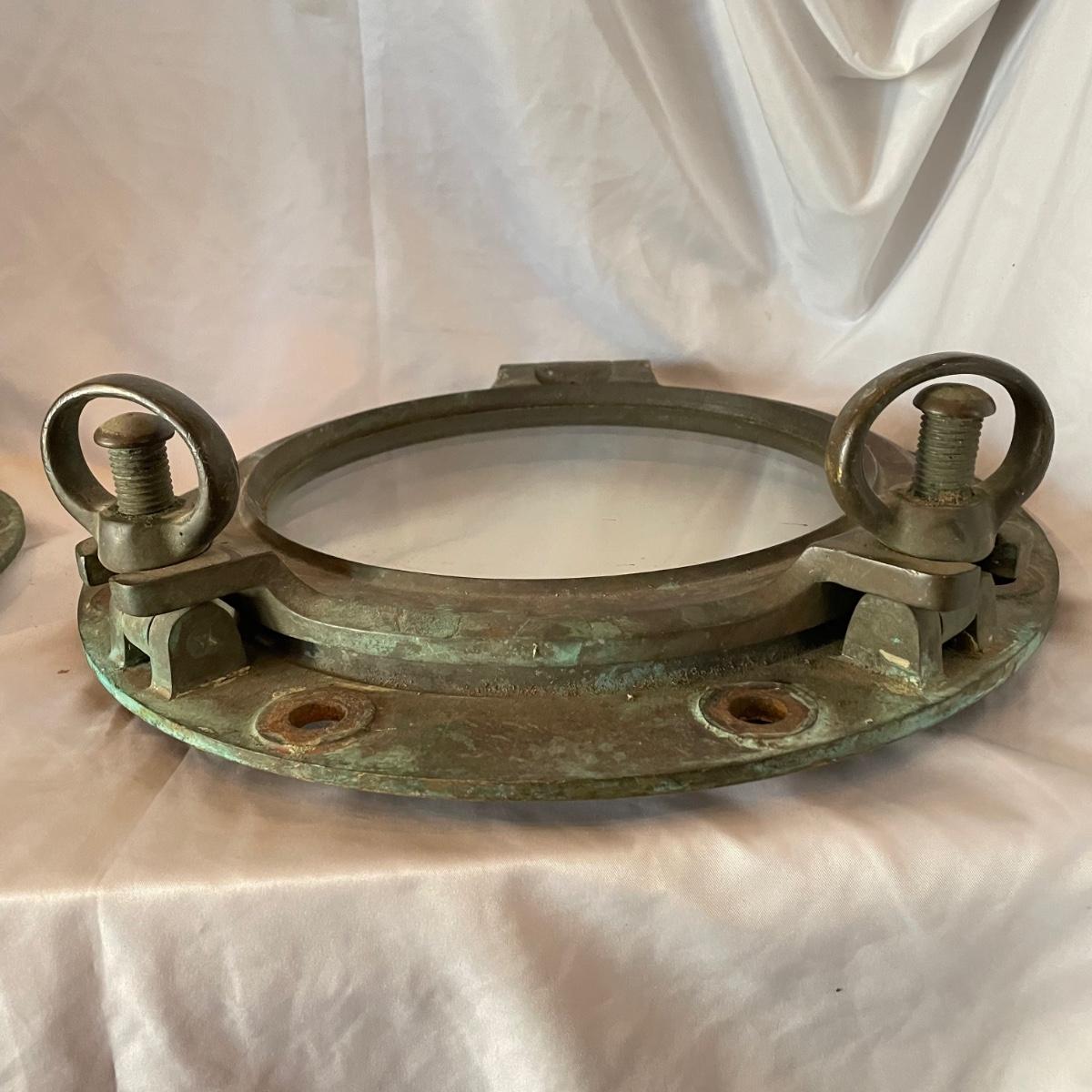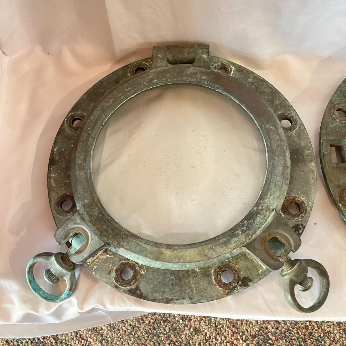 Two vintage, very similar, nautical porthole windows. Each window is in working order and shows some oxidation on the heavy metal frame. Each window is about 9.5” in diameter with the frames measuring approximately 15” in diameter. See images. Shipping available. Please call UPS with dimensions at 828-252-6930 for a shipping quote prior to bidding.