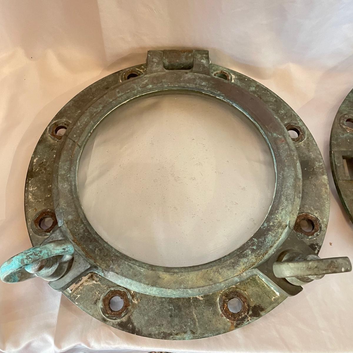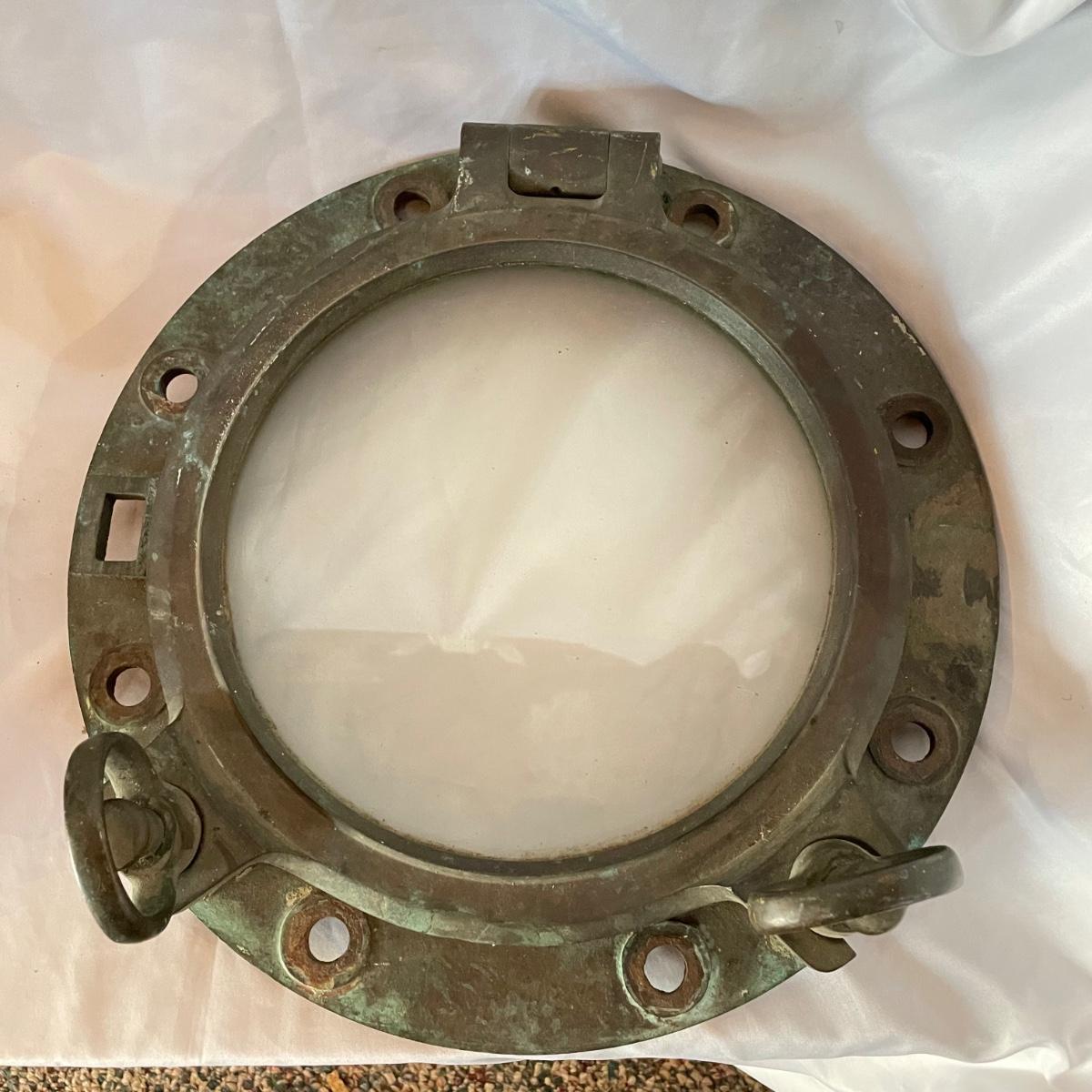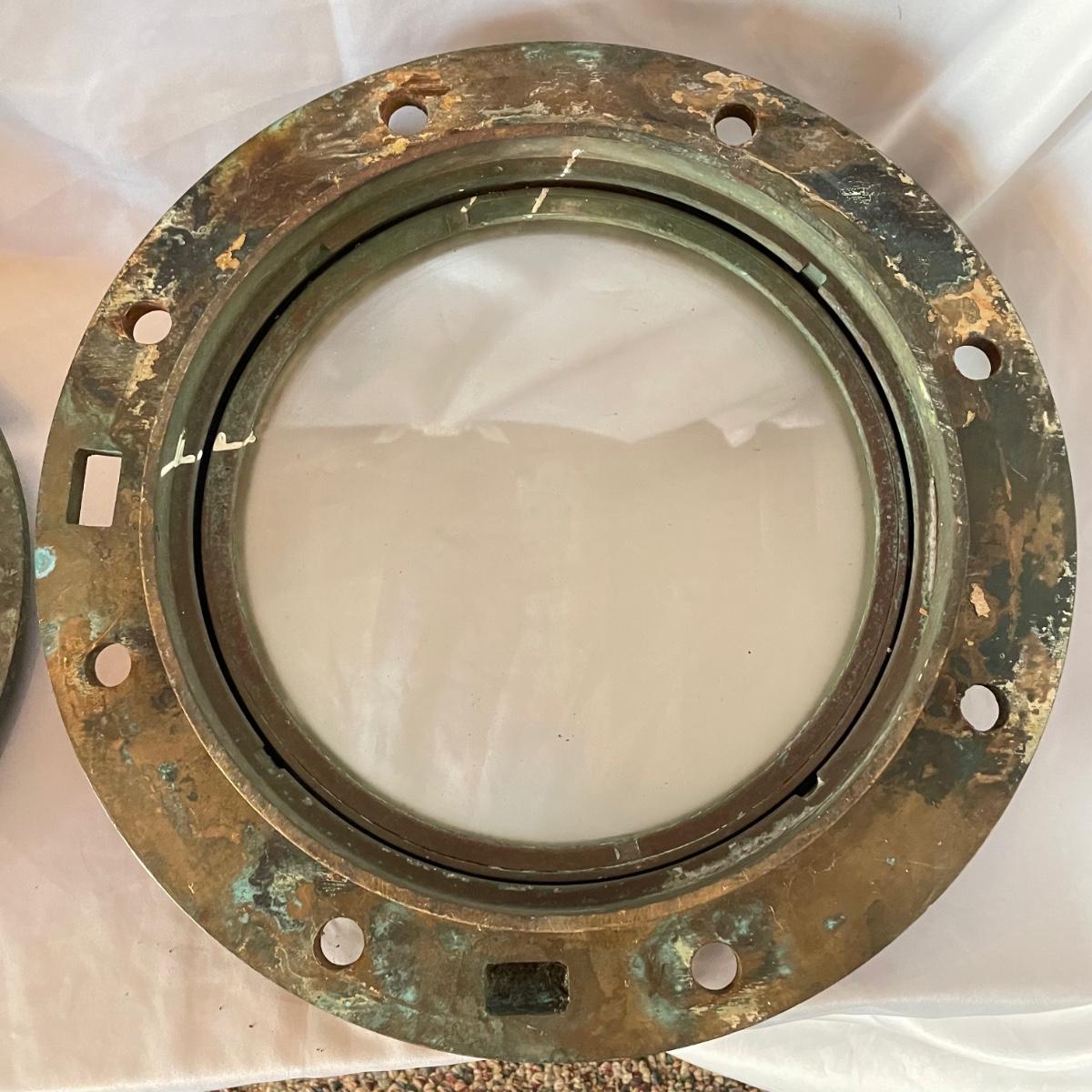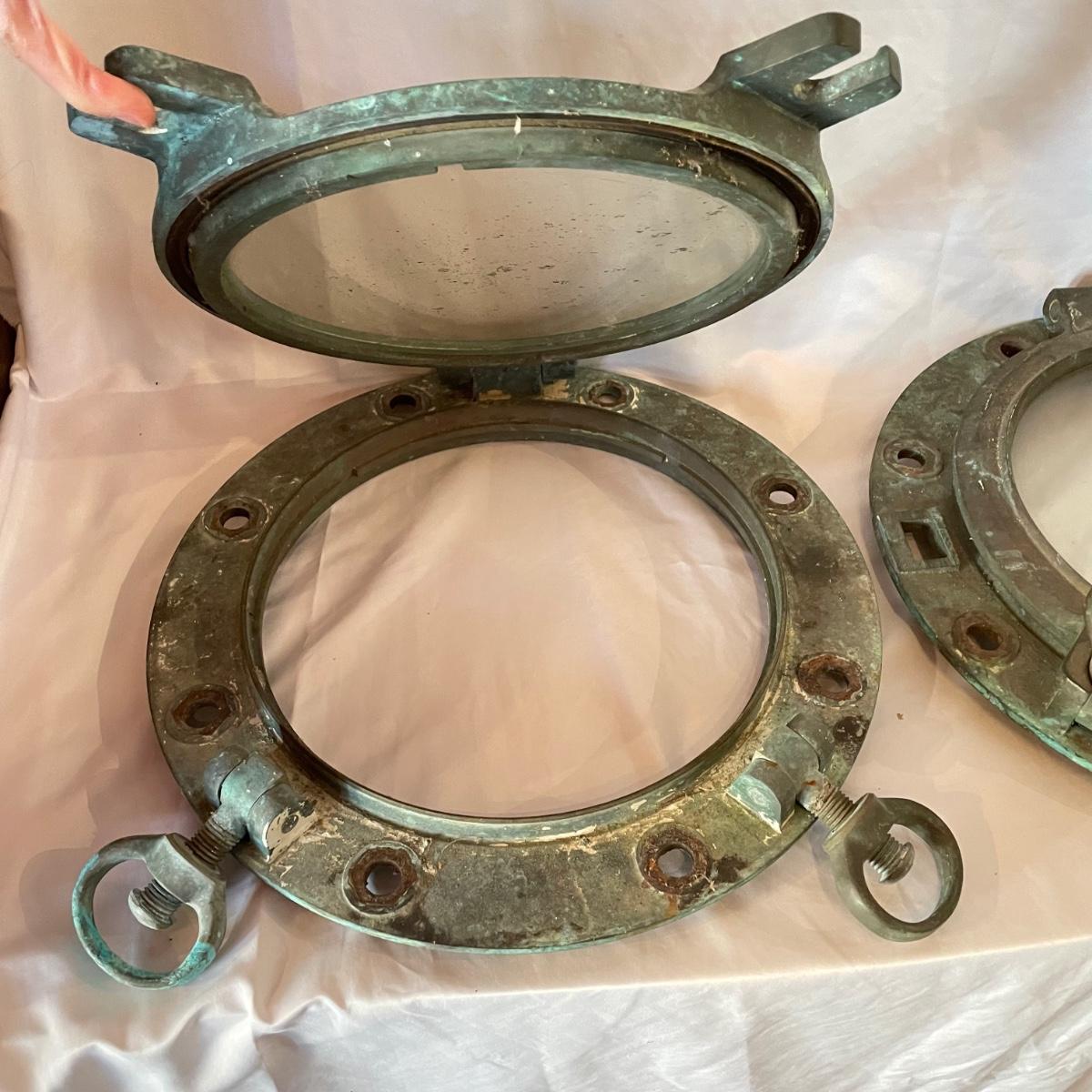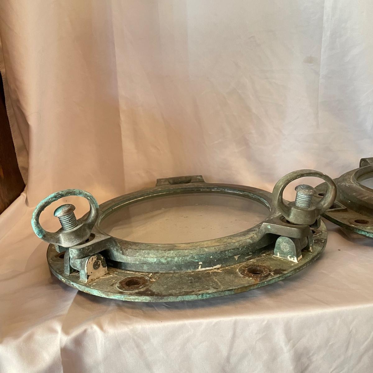 Two vintage, very similar, nautical porthole windows. Each window is in working order and shows some oxidation on the heavy metal frame. Each window is about 9.5” in diameter with the frames measuring approximately 15” in diameter. See images. Shipping available. Please call UPS with dimensions at 828-252-6930 for a shipping quote prior to bidding.