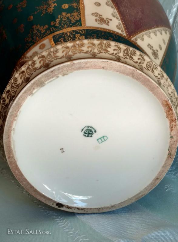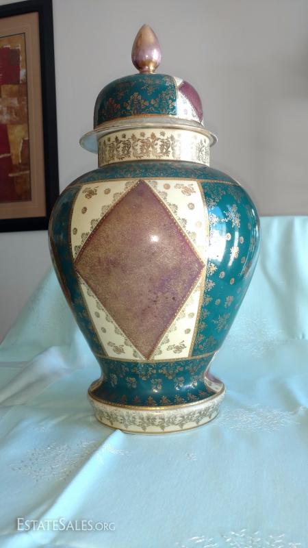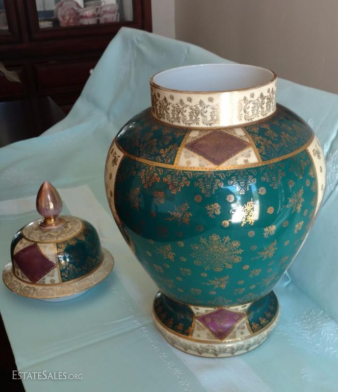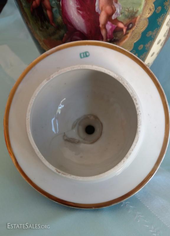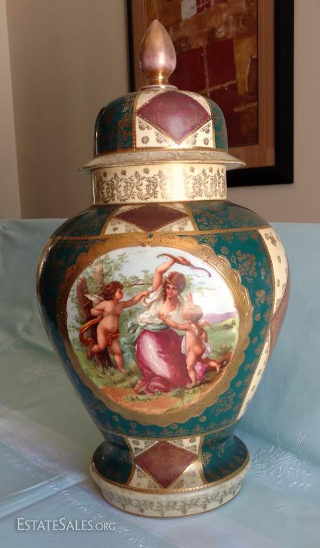 These two 17" urns, picturing playful cherubs, are porcelain and finely painted. No chips. One lid has been repaired. Matches the 11" pair also for sale.