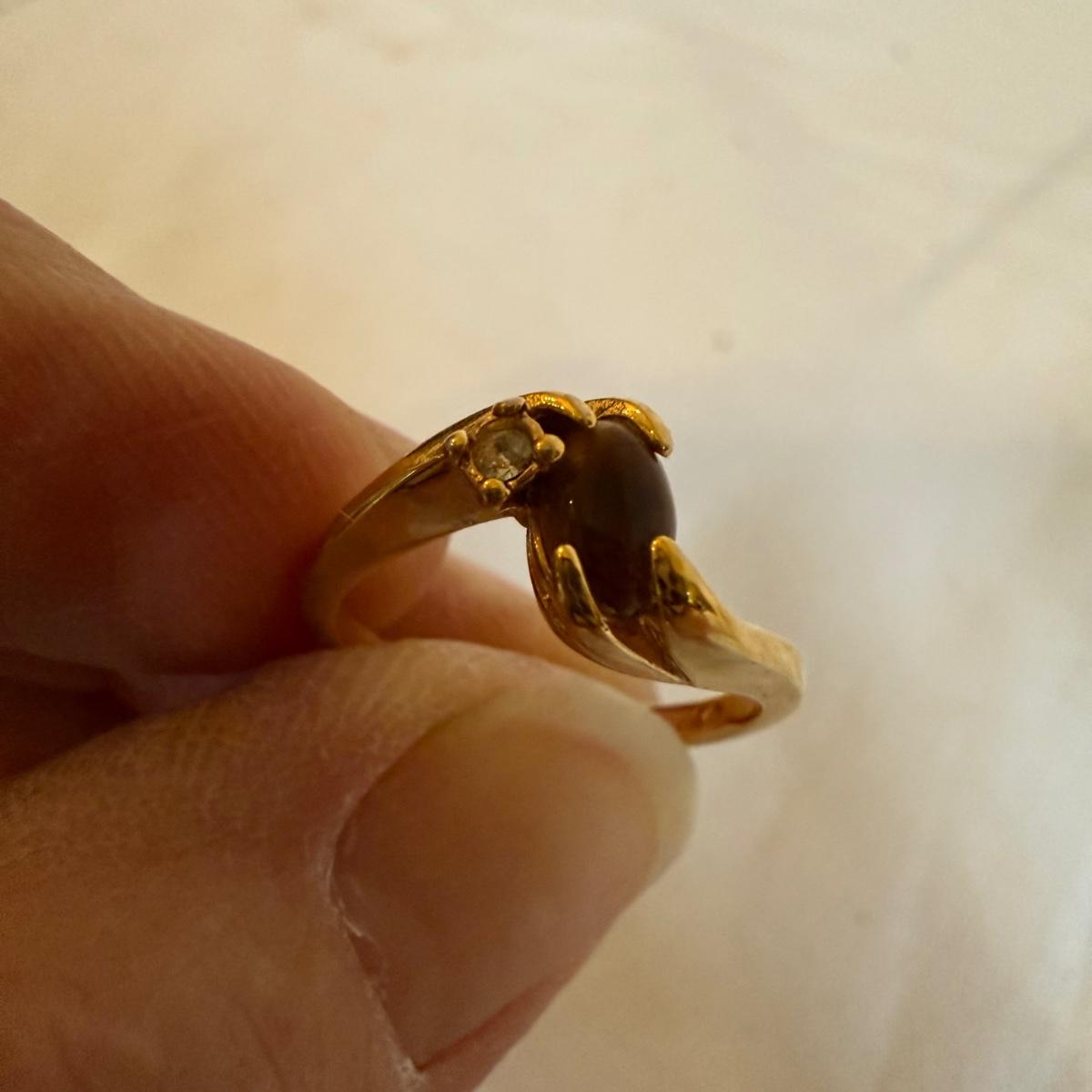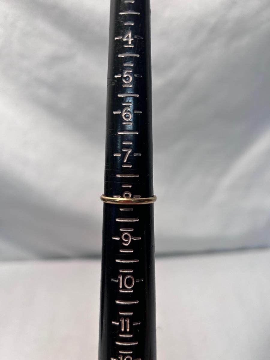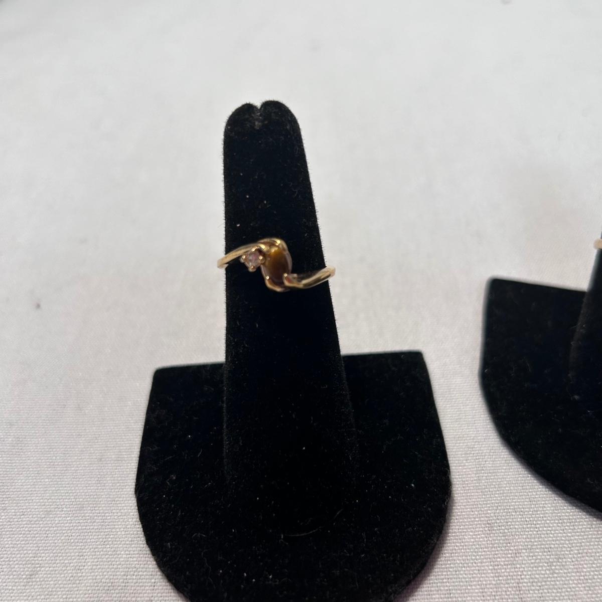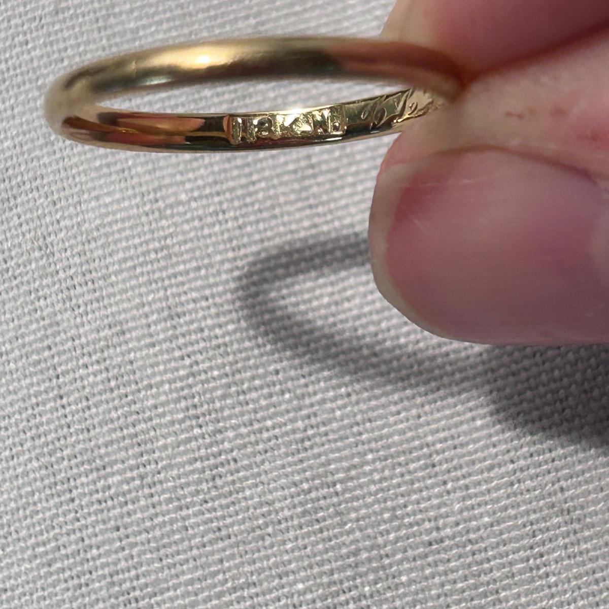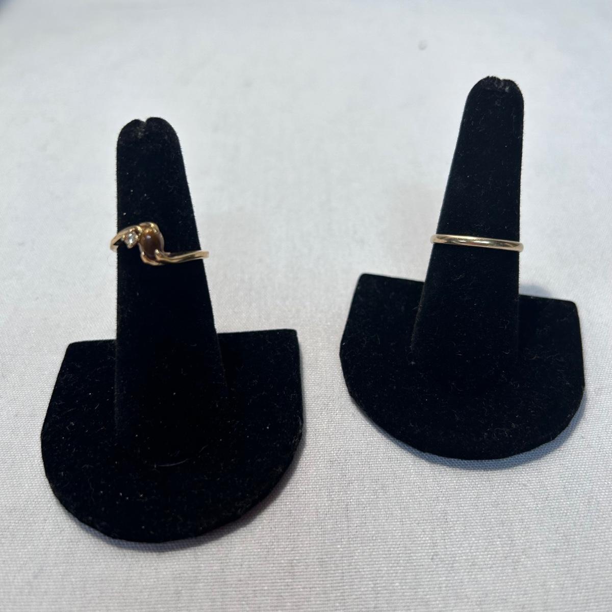 Two 18K gold rings. The size 6.5 has a small reddish/brown stone and simulated diamond. The plain size 8 band has some initials and date engraved inside. Both are stamped 18K. See photos for other marks.