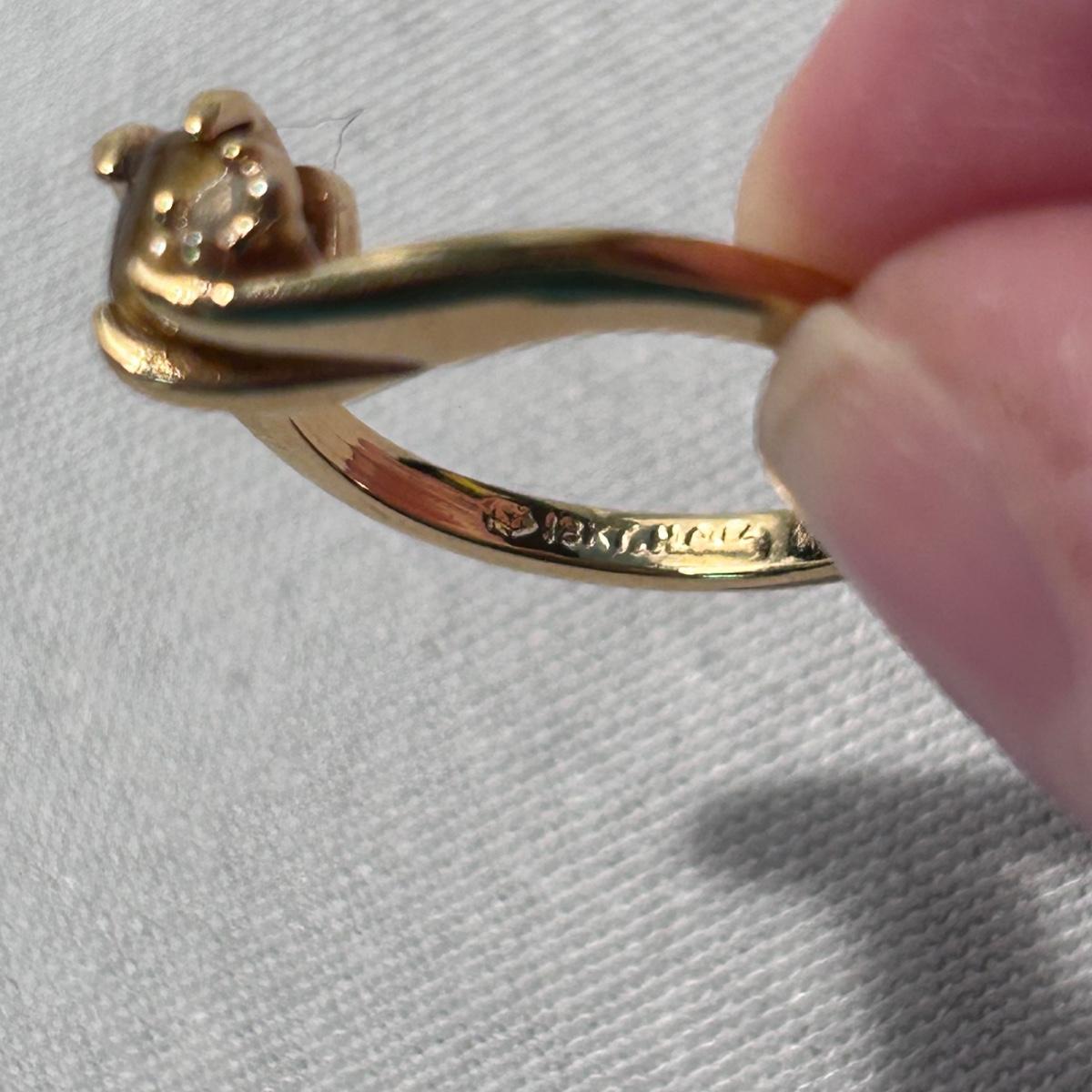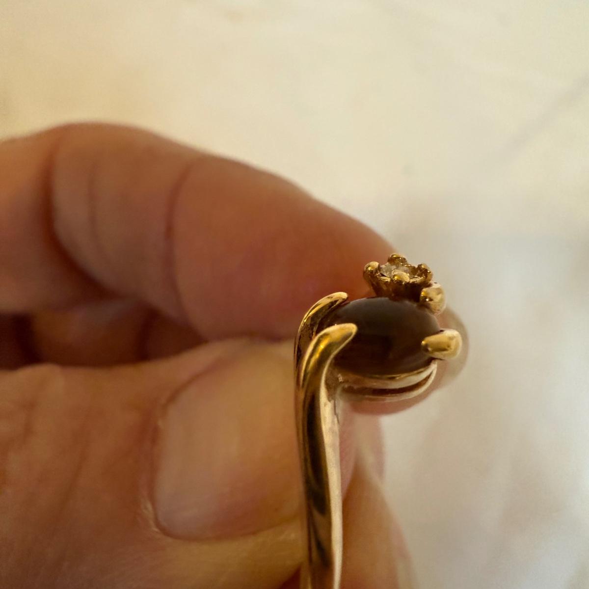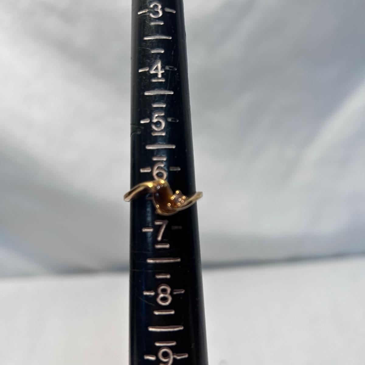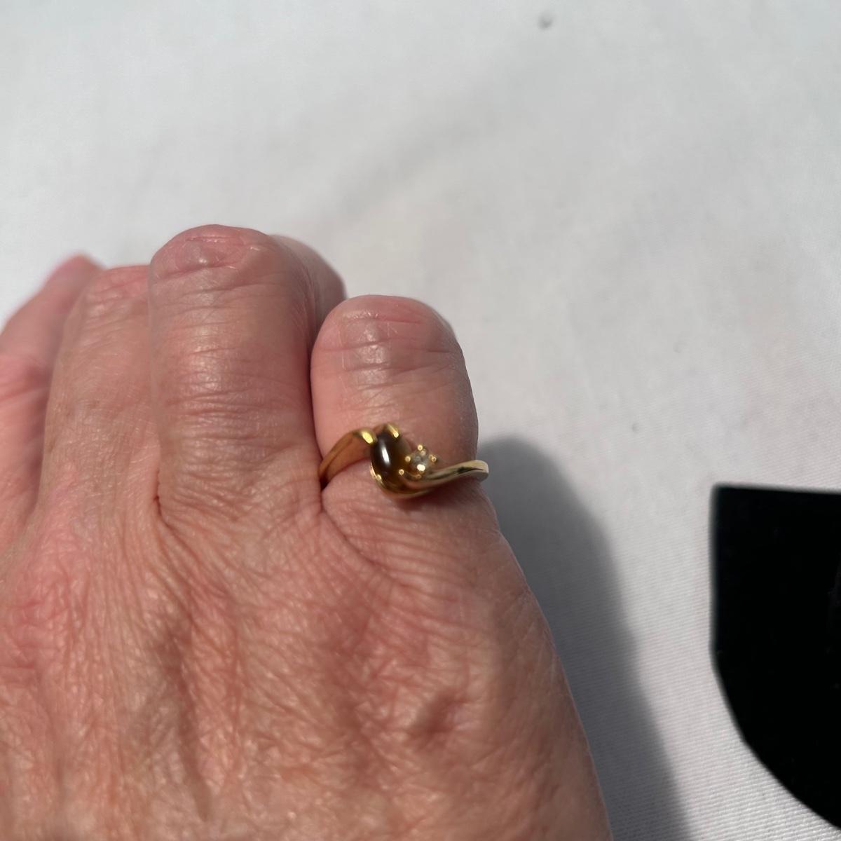 Two 18K gold rings. The size 6.5 has a small reddish/brown stone and simulated diamond. The plain size 8 band has some initials and date engraved inside. Both are stamped 18K. See photos for other marks.