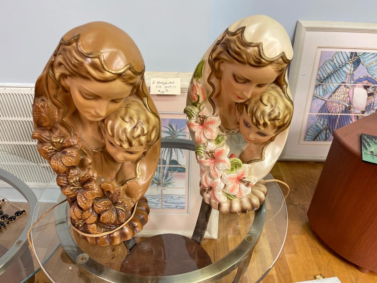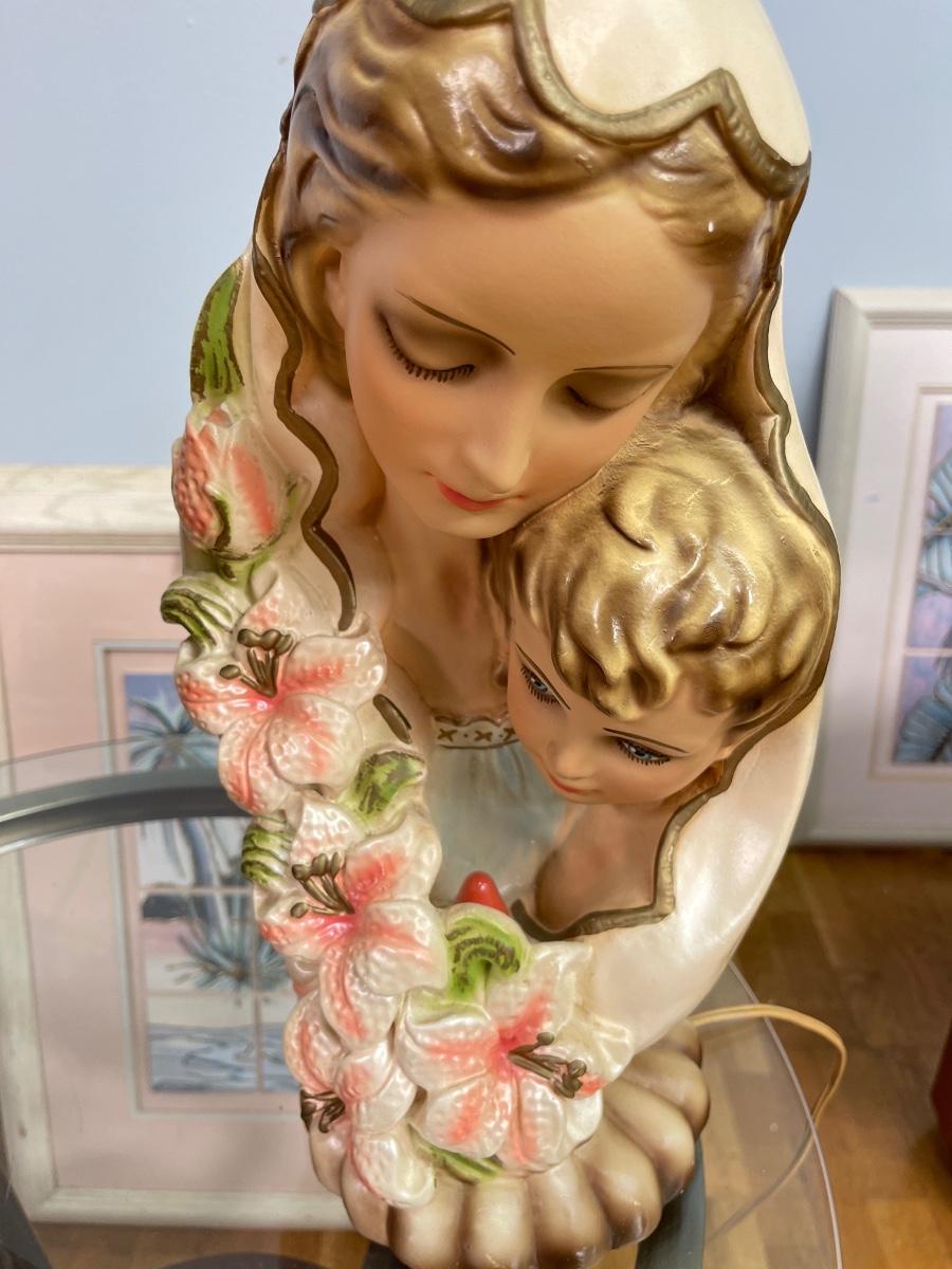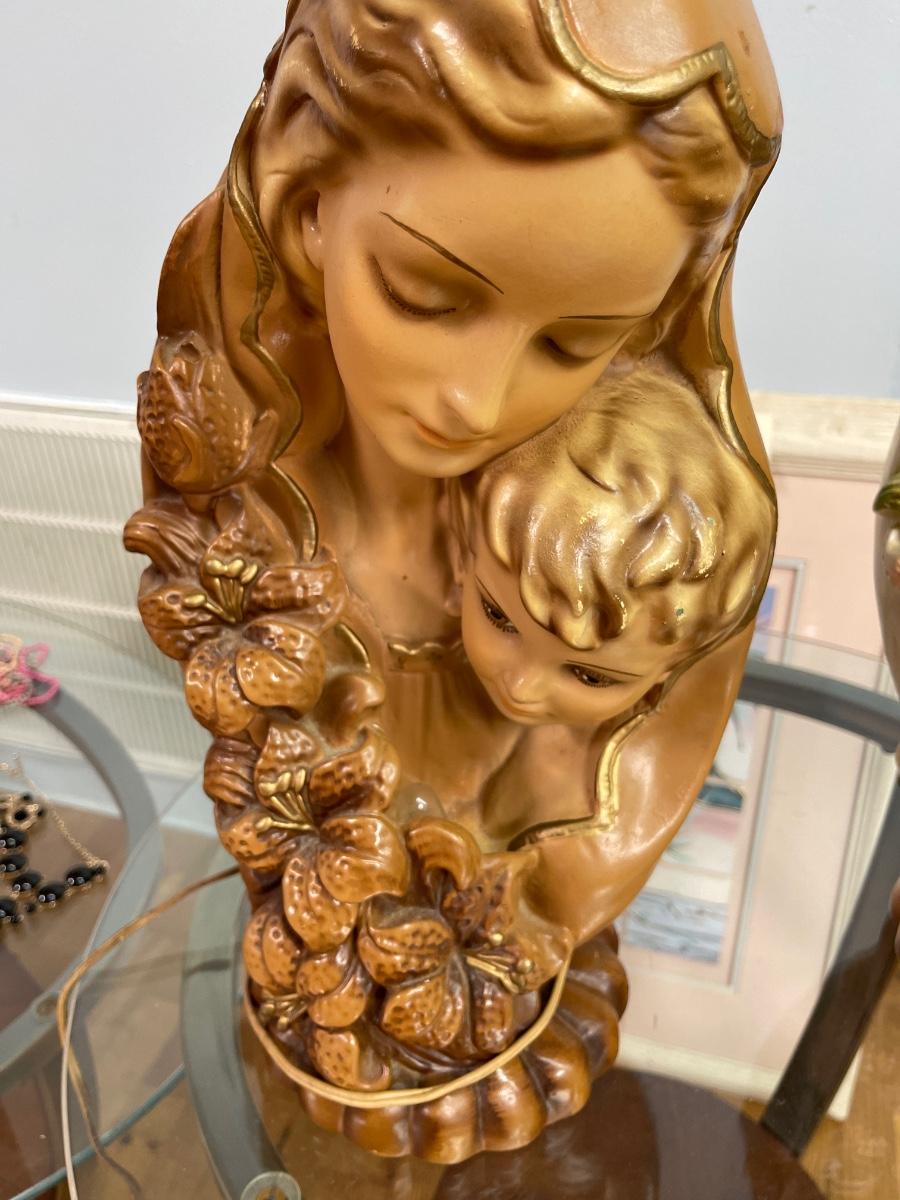 Two 1950's Chalkware Religious Catholic Art Night Lights - Madonna and Child