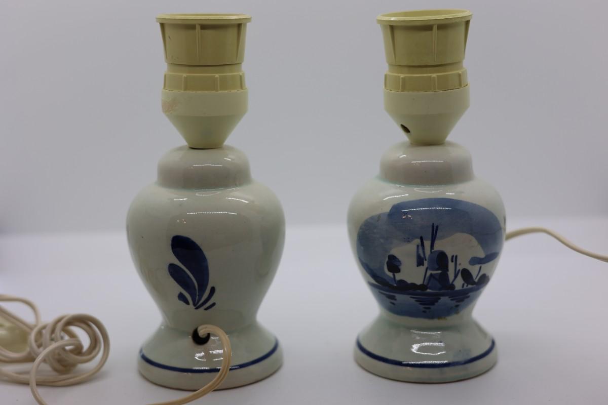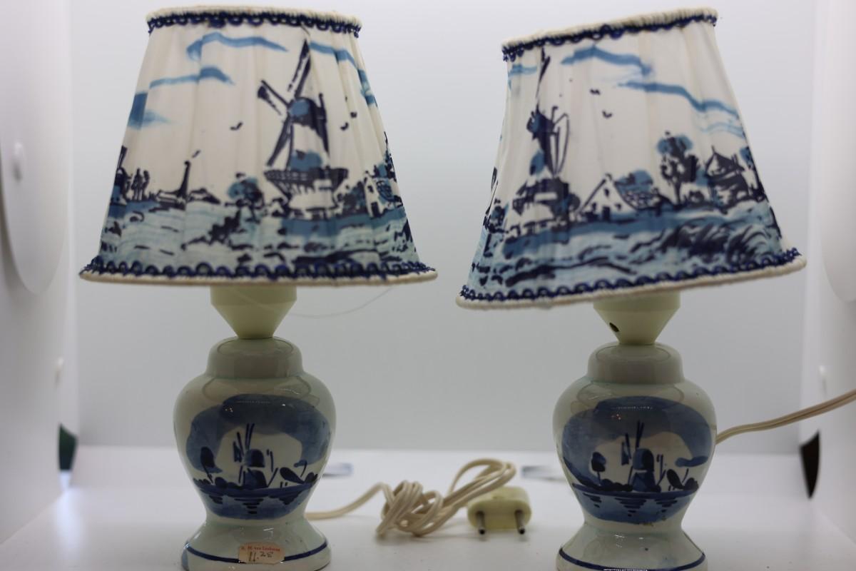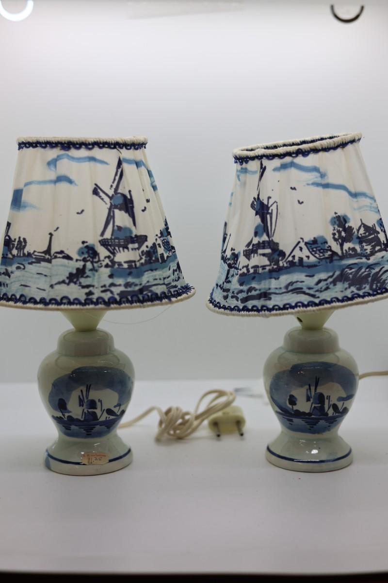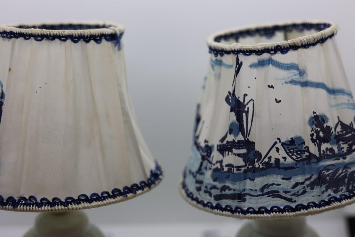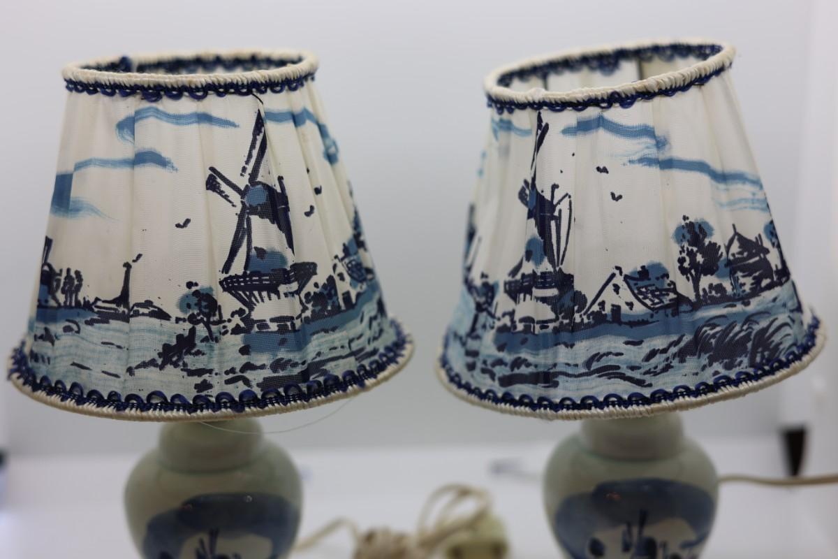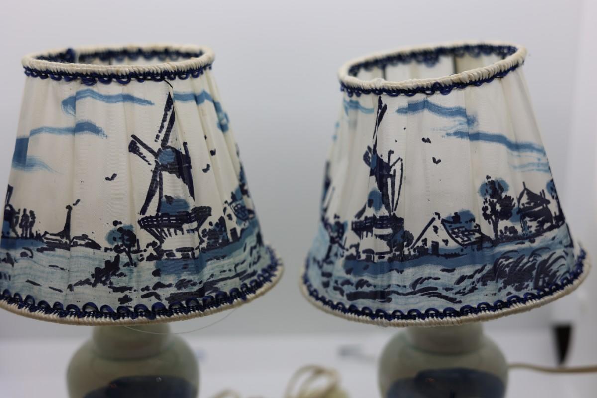 Two (2) Vintage Delft Holland Dutch Lamps W/ Cloth Lampshades