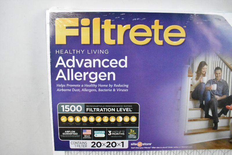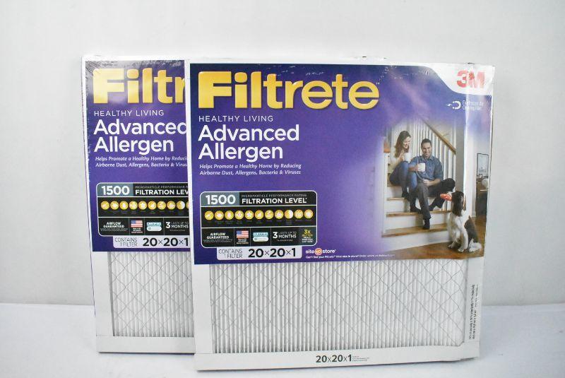 Two 3M Filtrete Advanced Allergen Filters, 20x20x1" - New, Small Bend as Shown