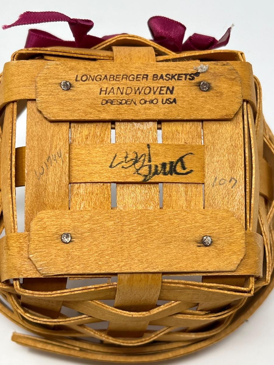 Basket with burgandy ribbon bow and leather side handles. Marked Longaberger, handwoven, Dresden, Ohio.
