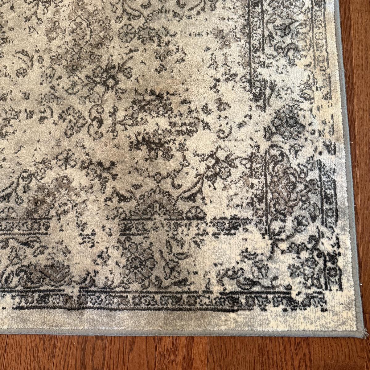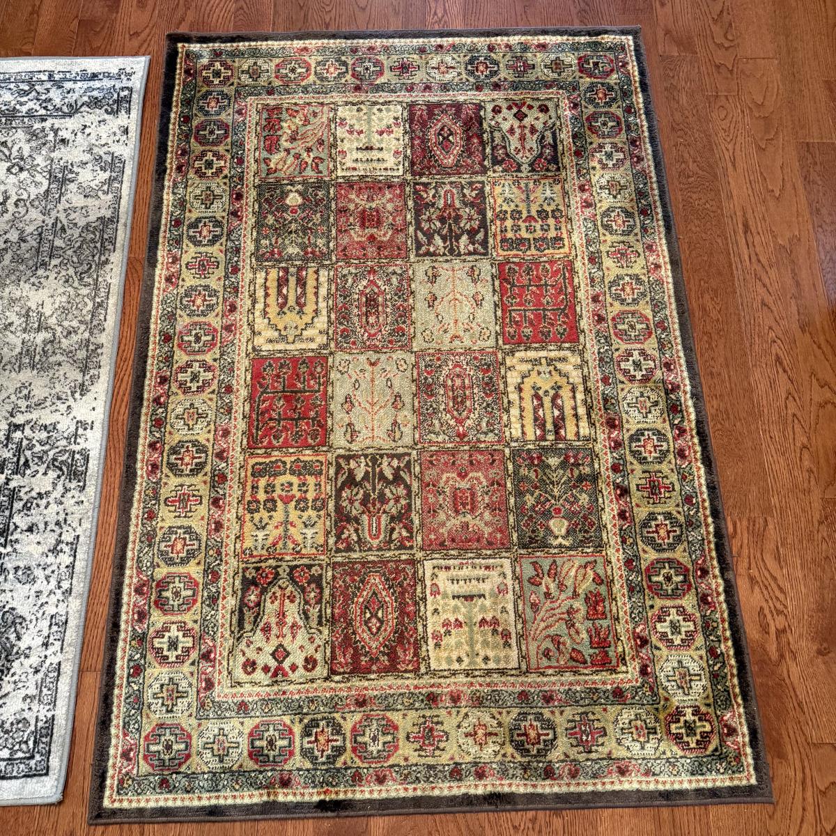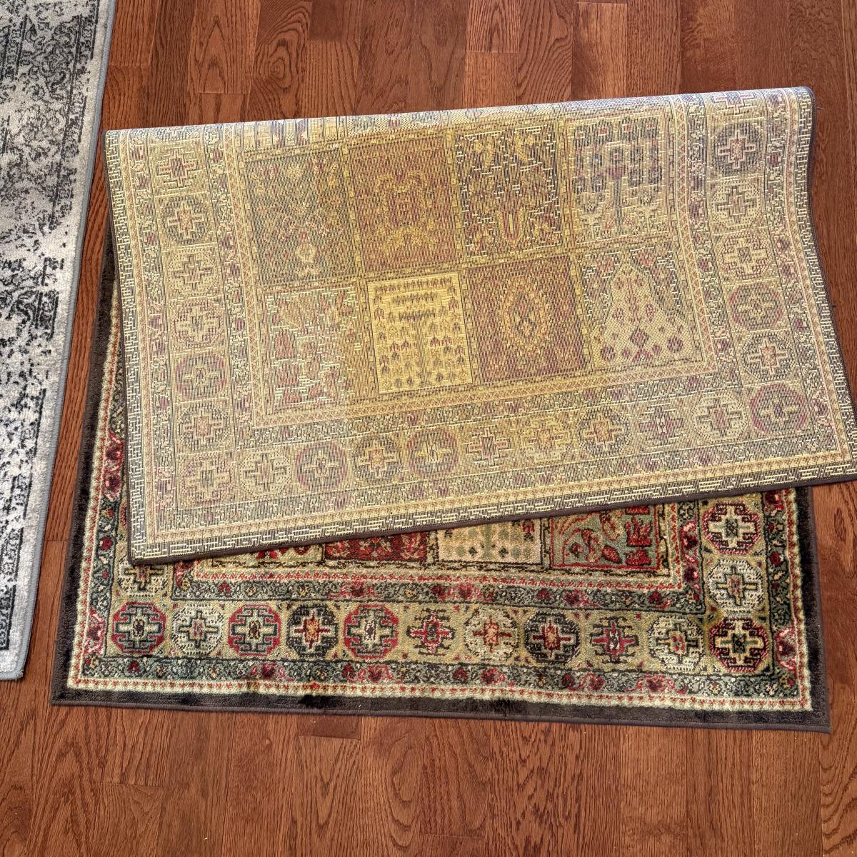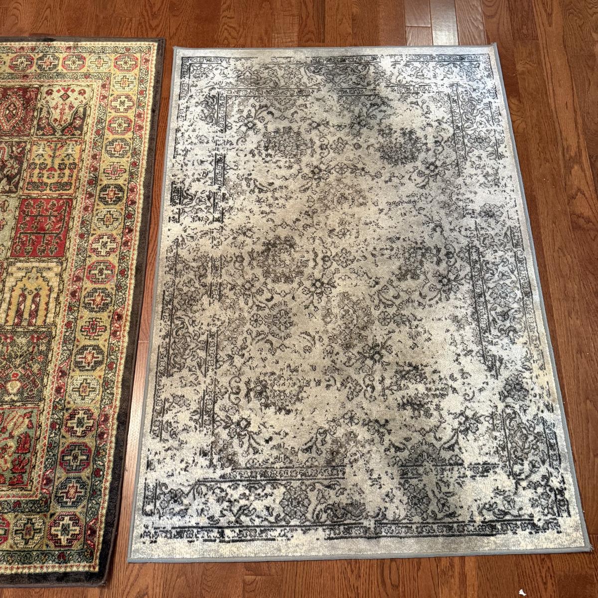Two small area rugs. The gray rug has a non-slip mat underneath and measures 4’8” x 3’3”. It has an intentionally distressed look, it is unclear if there are any stains. The red toned rug is slightly bigger at 4’11” x 3’4”. Both need light cleaning.