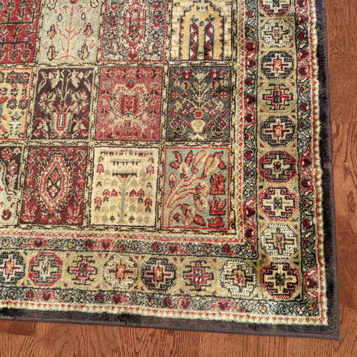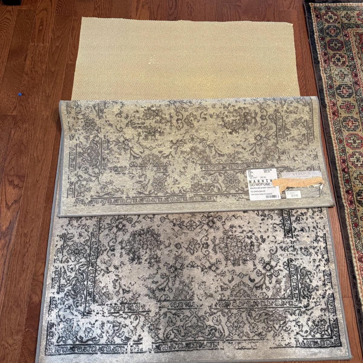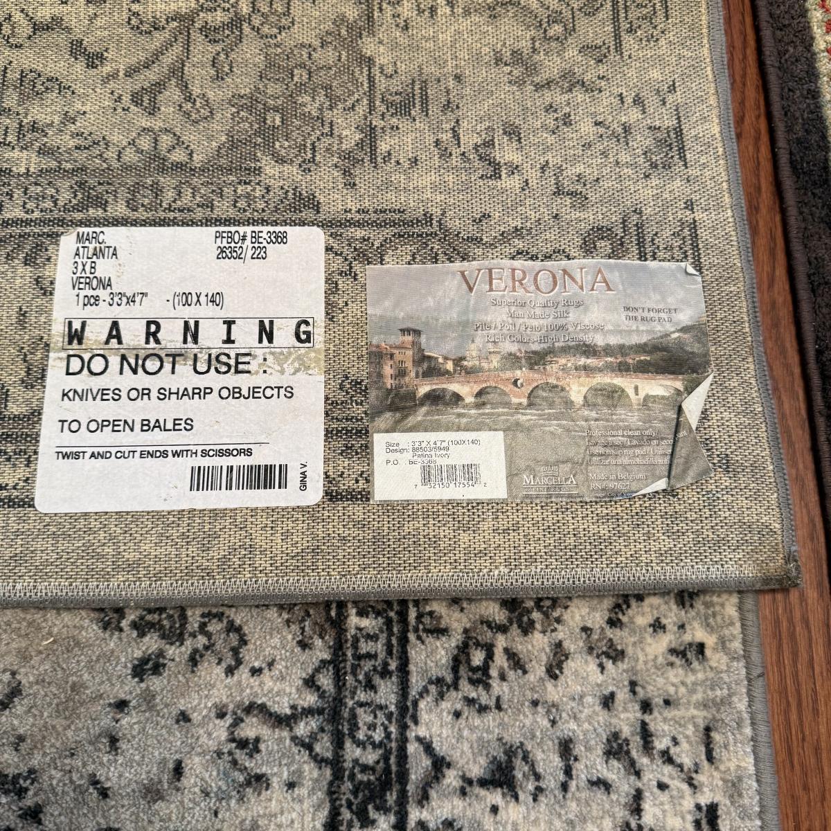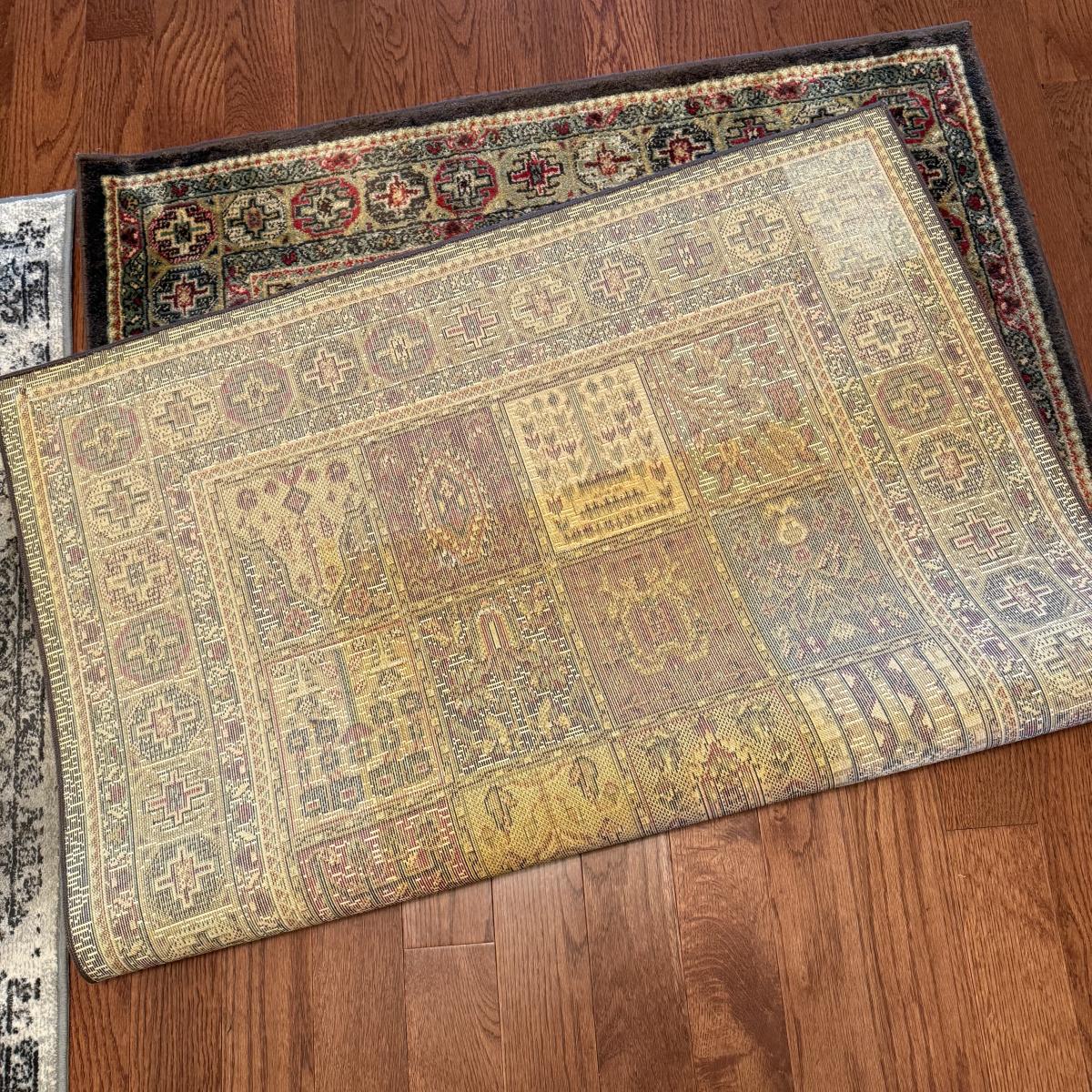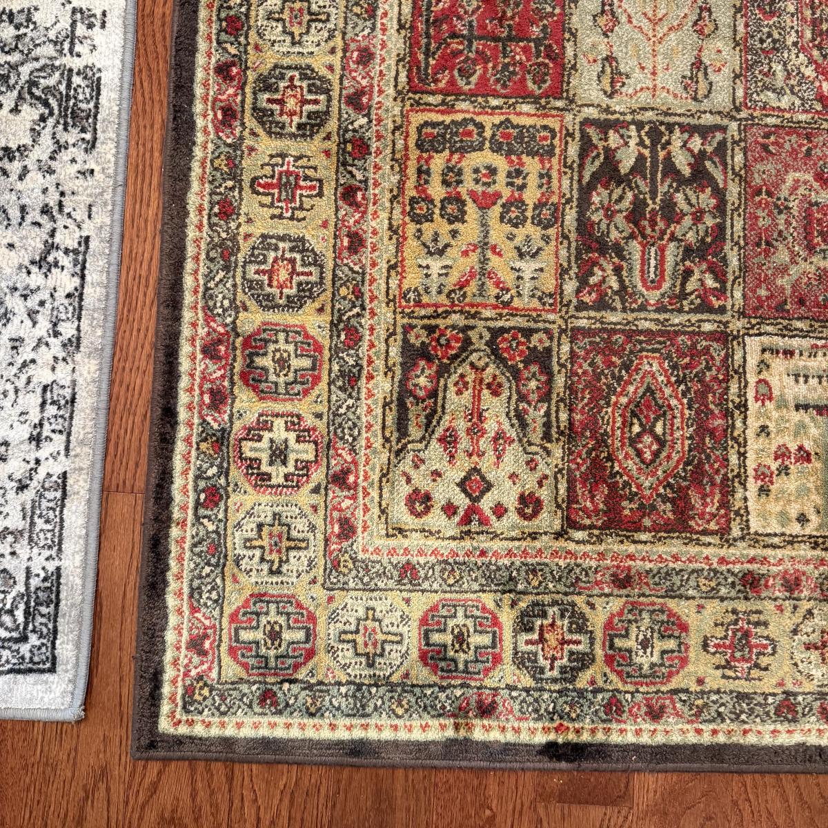 Two small area rugs. The gray rug has a non-slip mat underneath and measures 4’8” x 3’3”. It has an intentionally distressed look, it is unclear if there are any stains. The red toned rug is slightly bigger at 4’11” x 3’4”. Both need light cleaning.