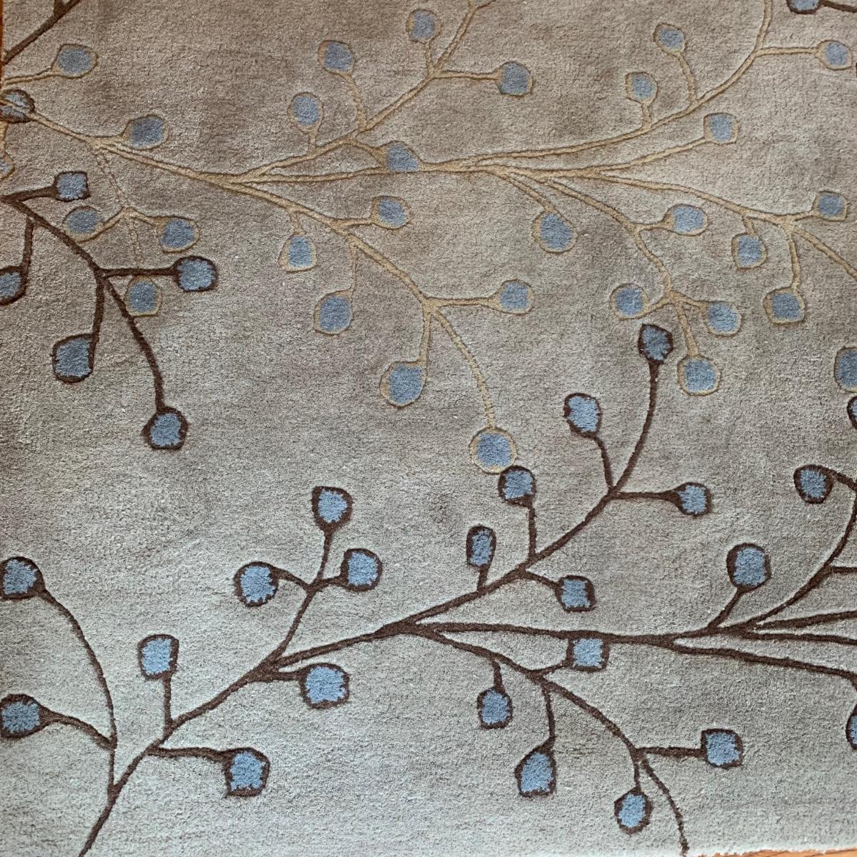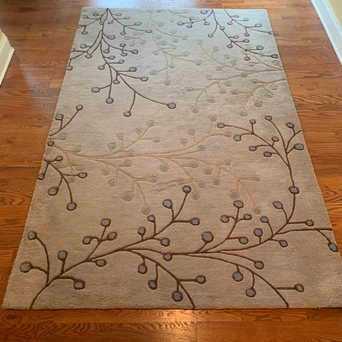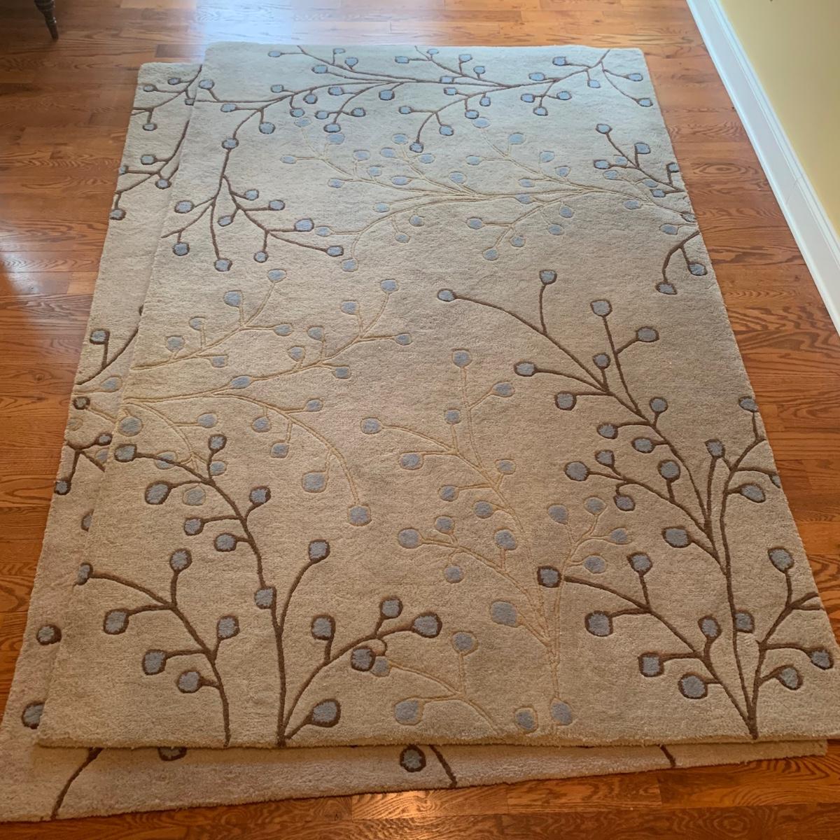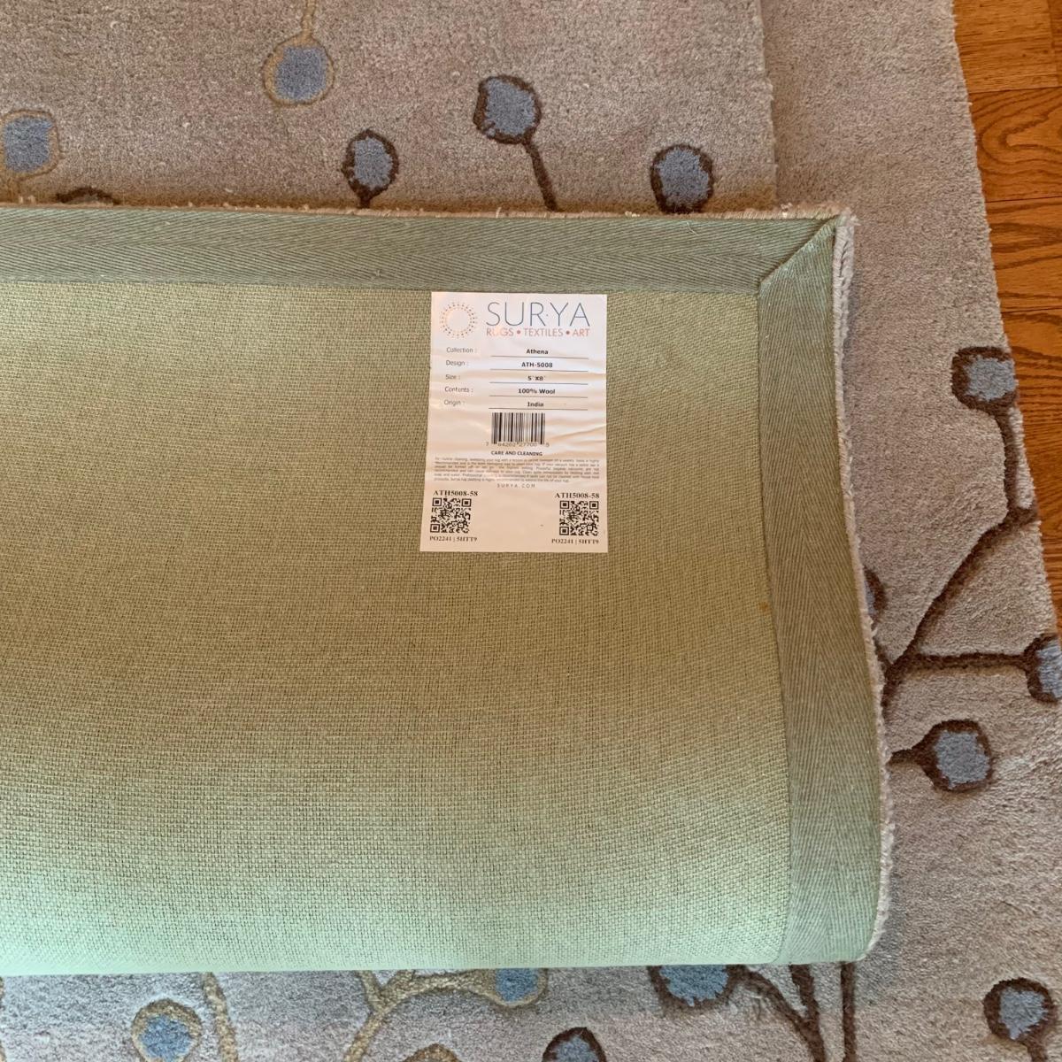 Two wool area rugs by Surya featuring springtime floral design with taupe, browns, and blues. Rugs measure, 5’ x 8’ and appear to have low pile. Please see photos for more details. Local pickup only.