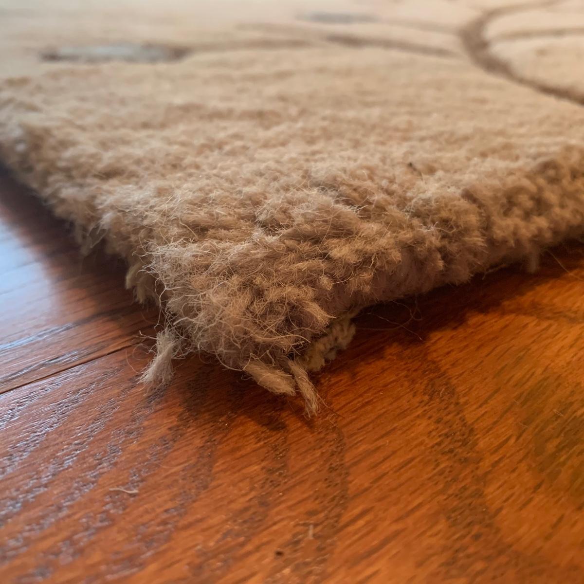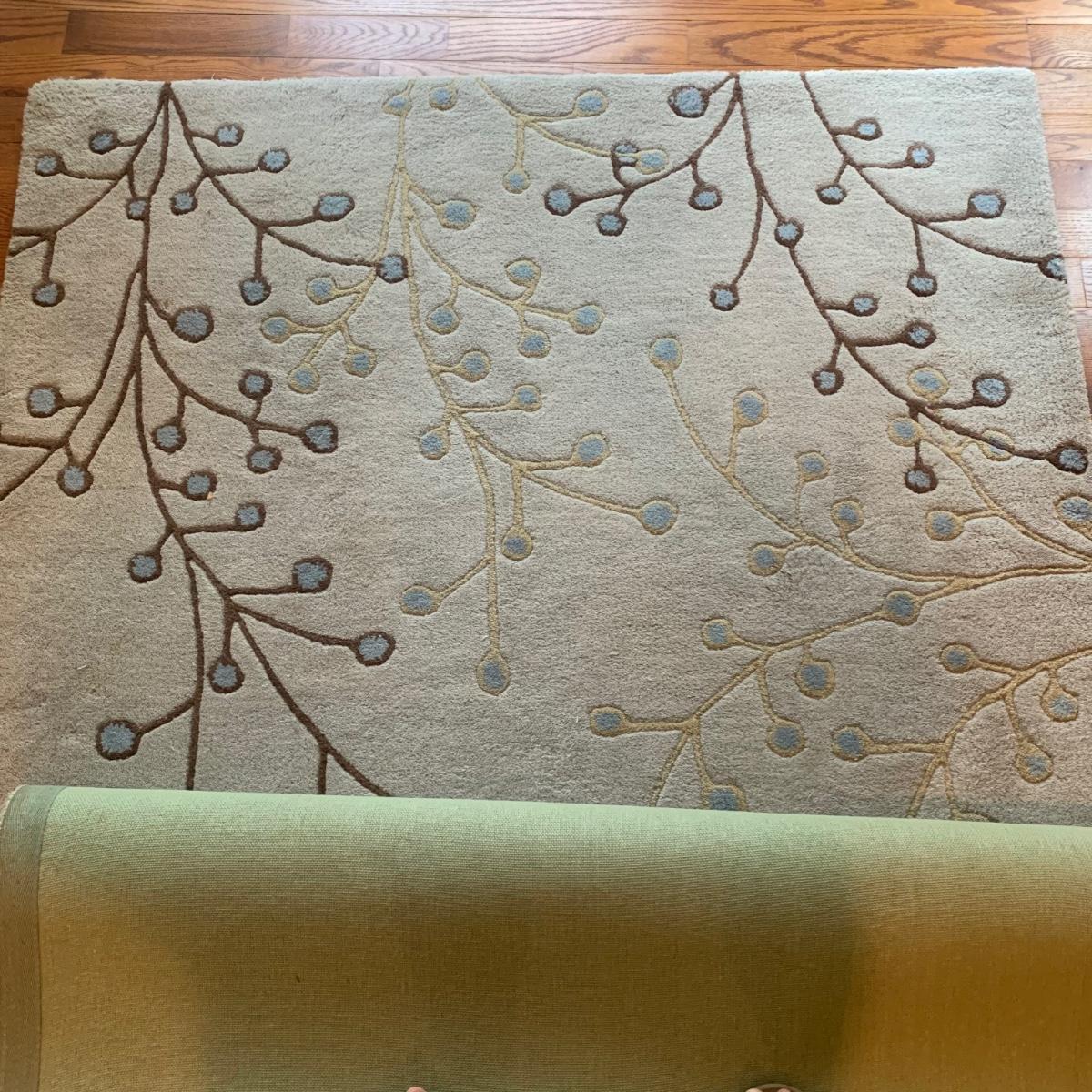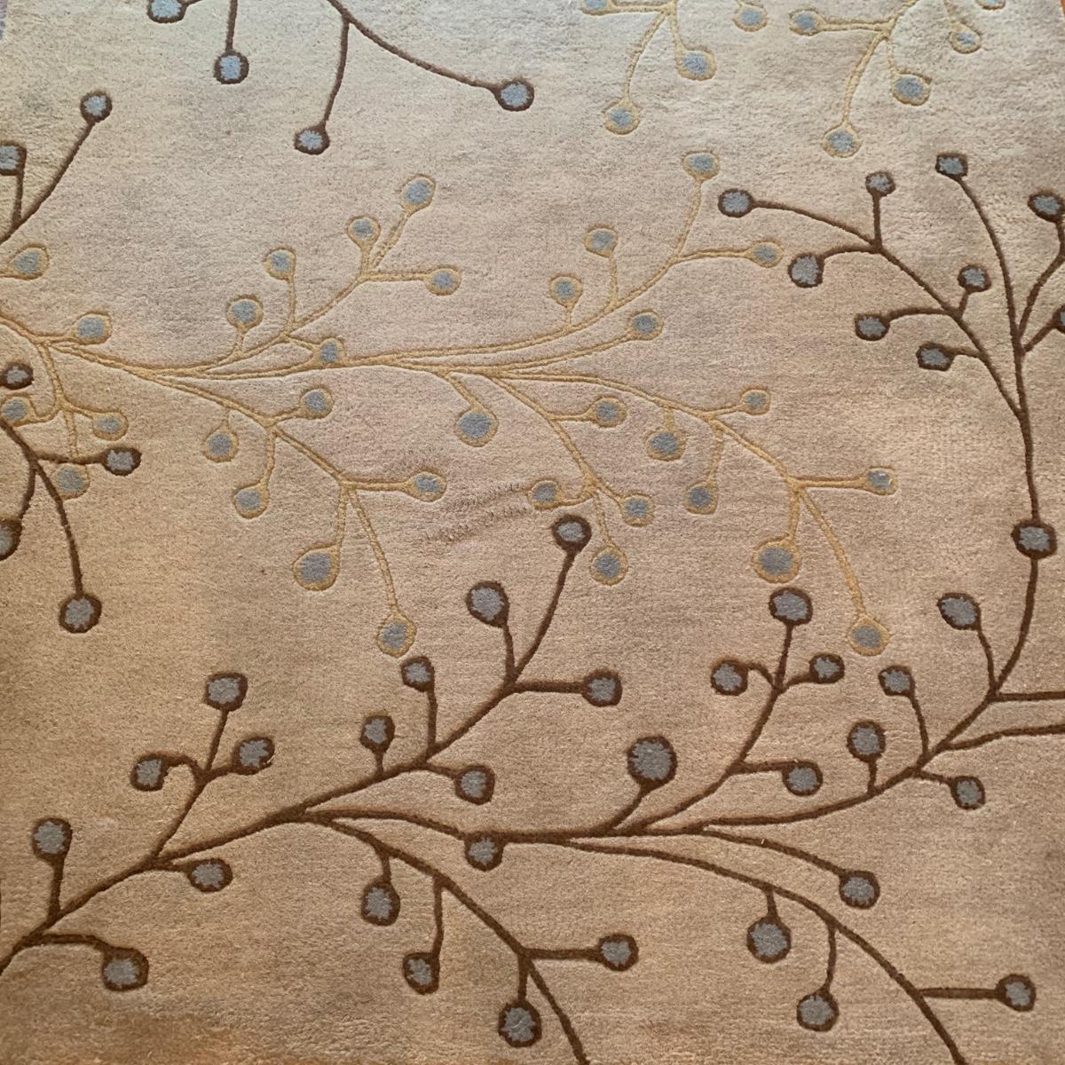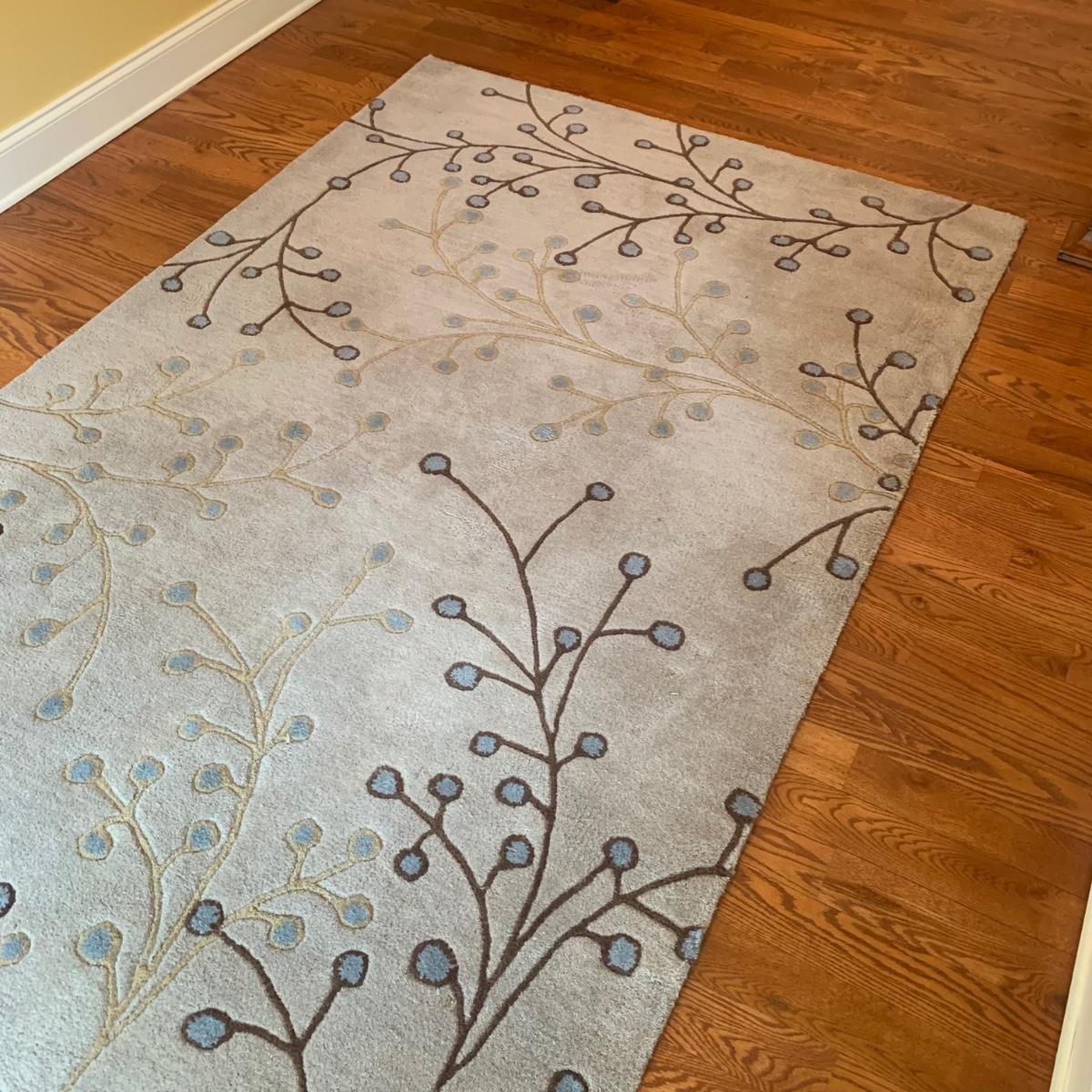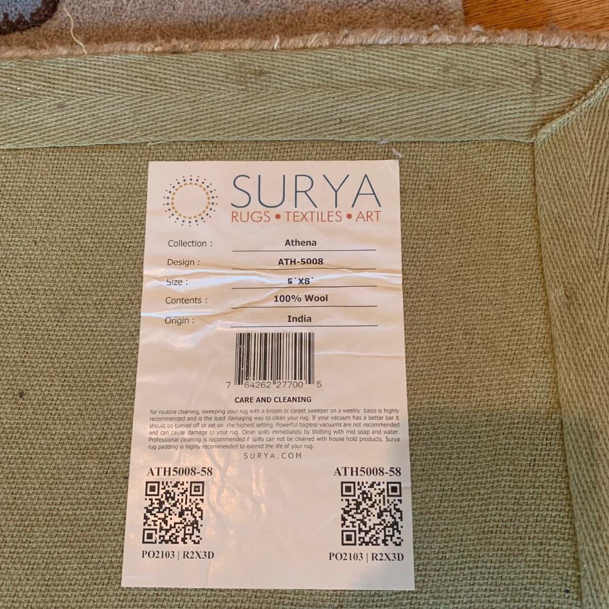 Two wool area rugs by Surya featuring springtime floral design with taupe, browns, and blues. Rugs measure, 5’ x 8’ and appear to have low pile. Please see photos for more details. Local pickup only.