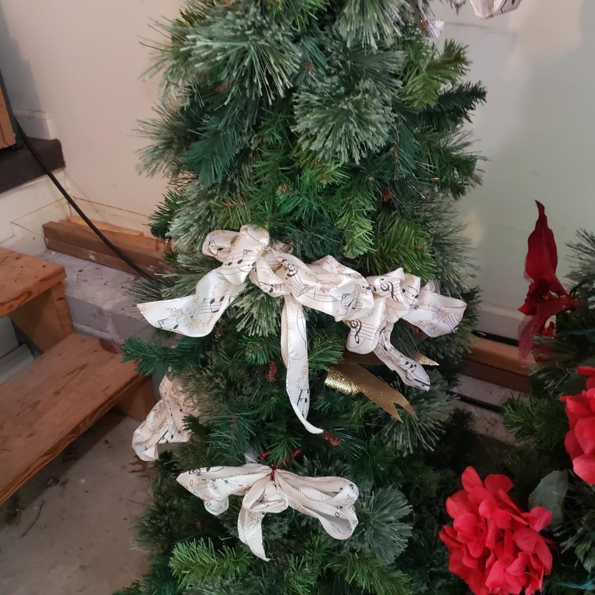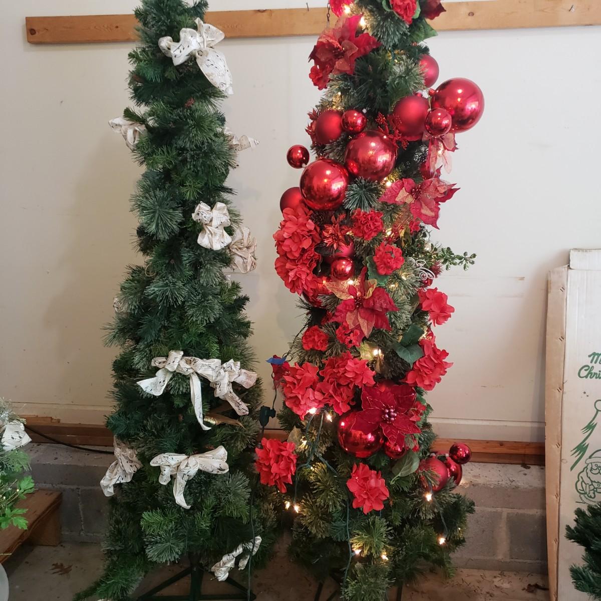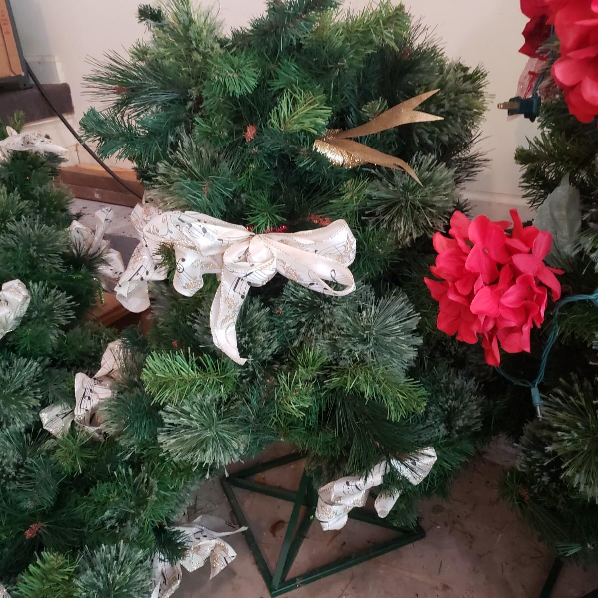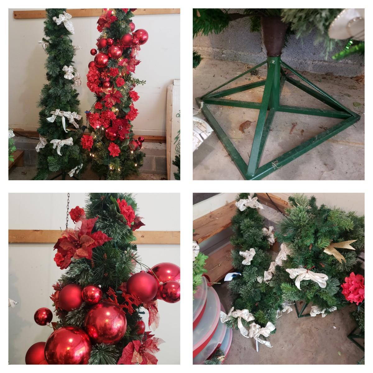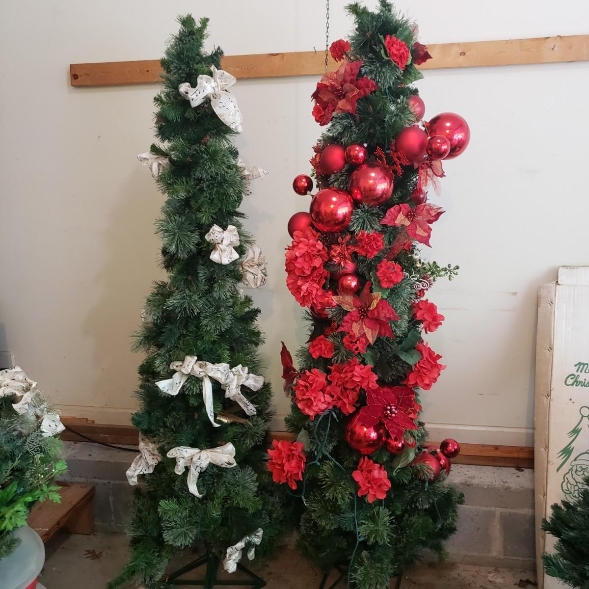 This lot features two 6'6" decorated Christmas trees. The trees are slender, roughly 15"D. The red tree lights up when plugged in. The musical ribboned tree does not have lights. Each are on a squared metal base, see pictures. Both trees come apart halfway up. Because the lights are on the red tree, we did not picture it taken apart.