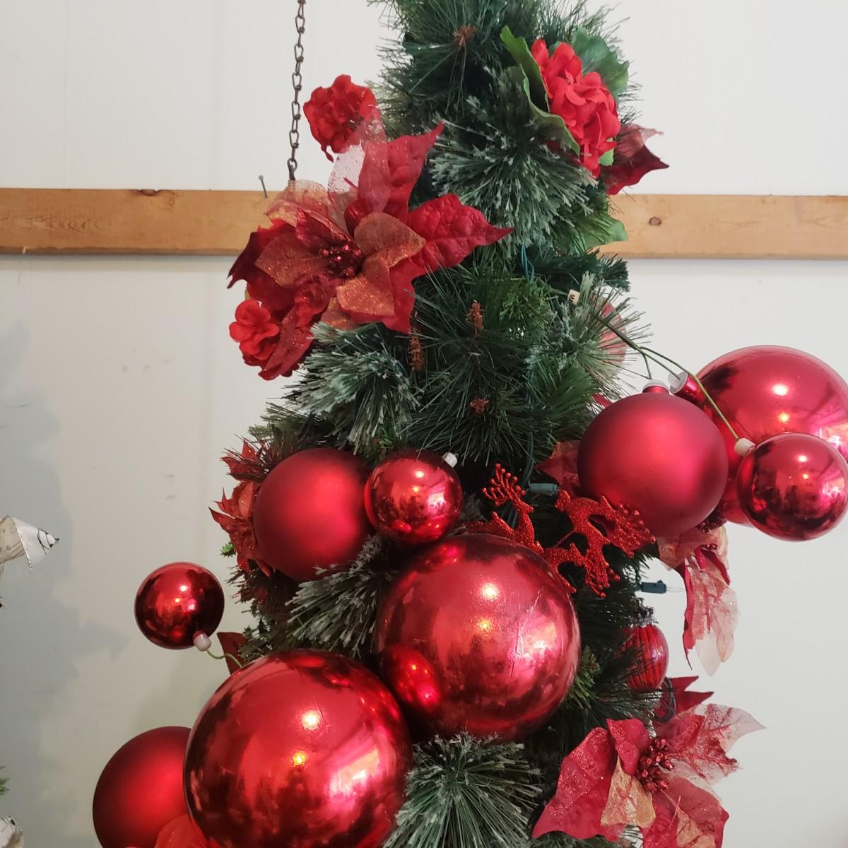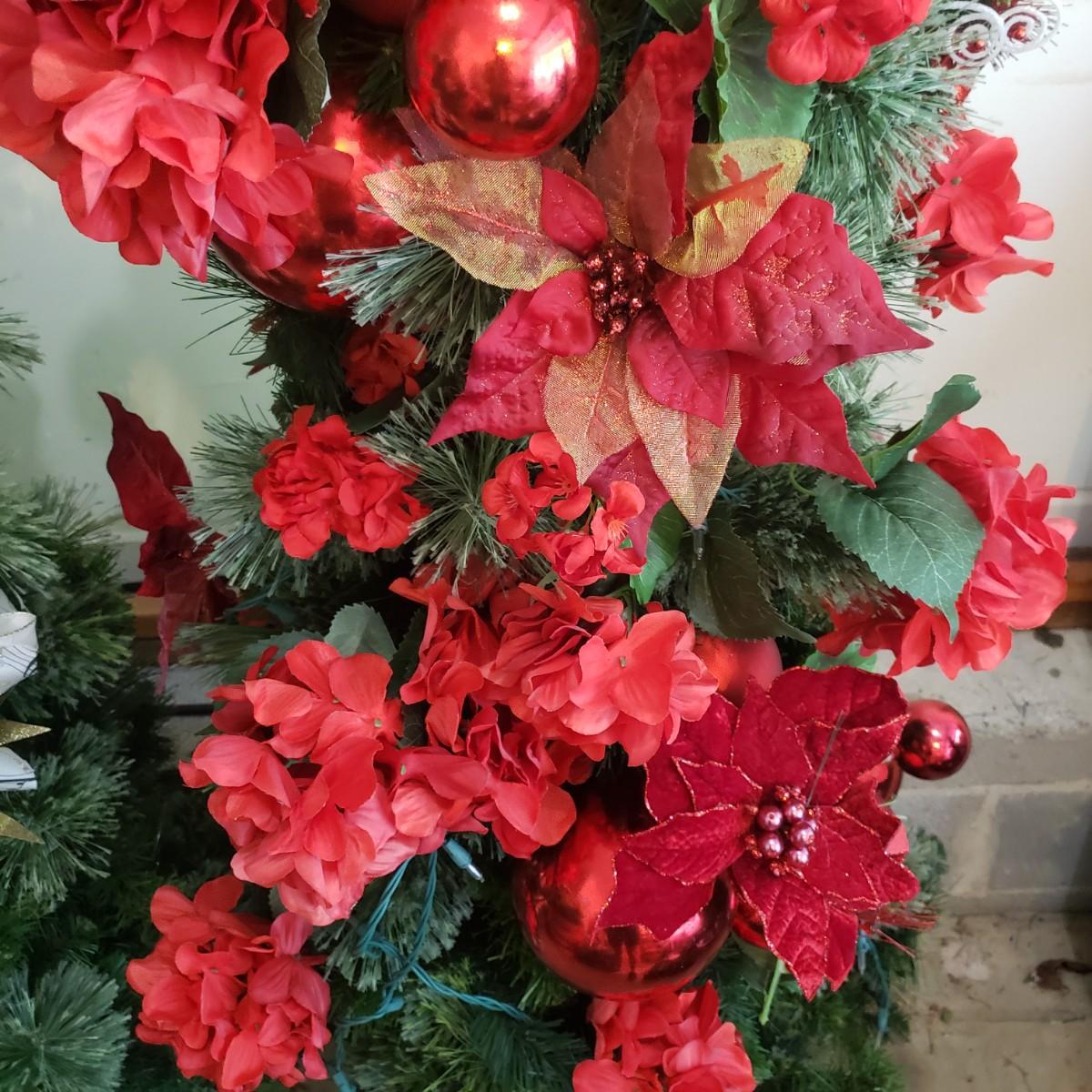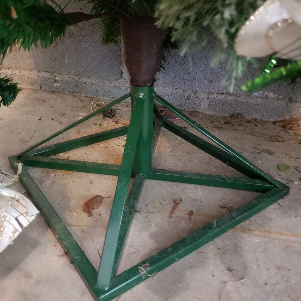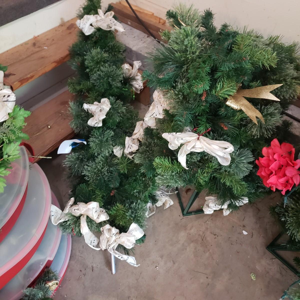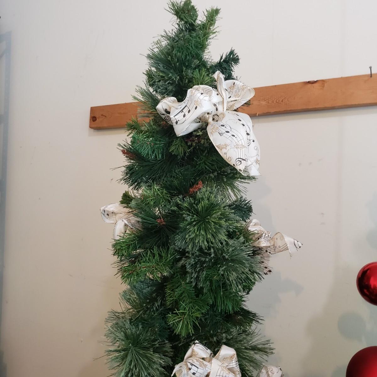 This lot features two 6'6" decorated Christmas trees. The trees are slender, roughly 15"D. The red tree lights up when plugged in. The musical ribboned tree does not have lights. Each are on a squared metal base, see pictures. Both trees come apart halfway up. Because the lights are on the red tree, we did not picture it taken apart.