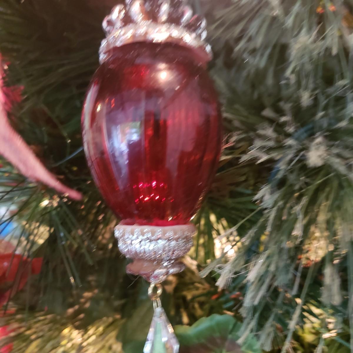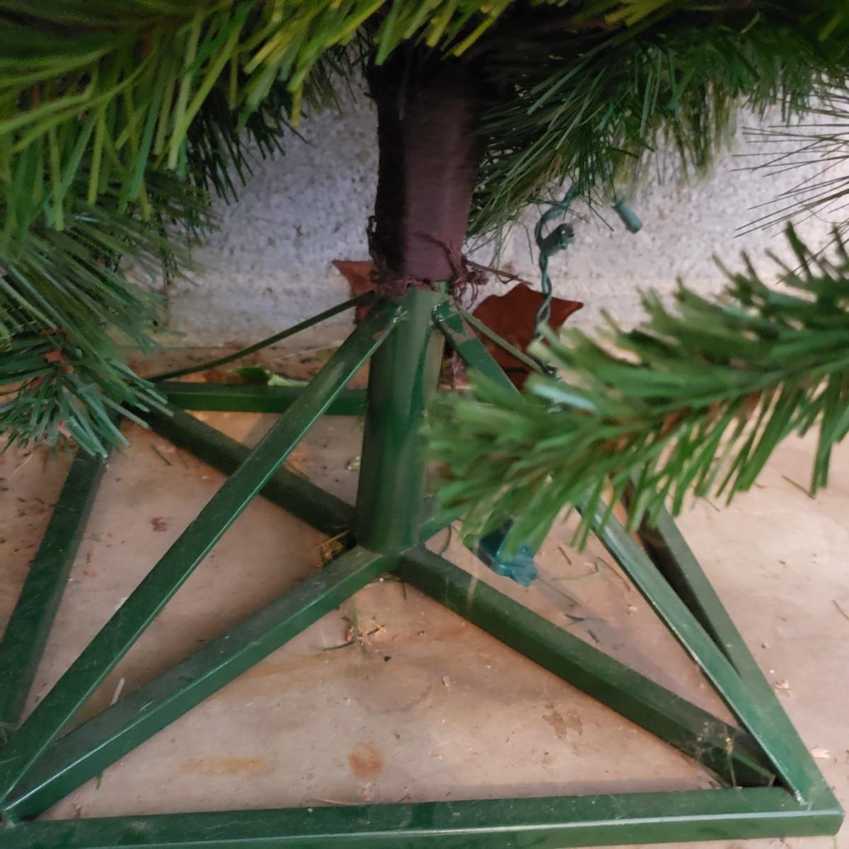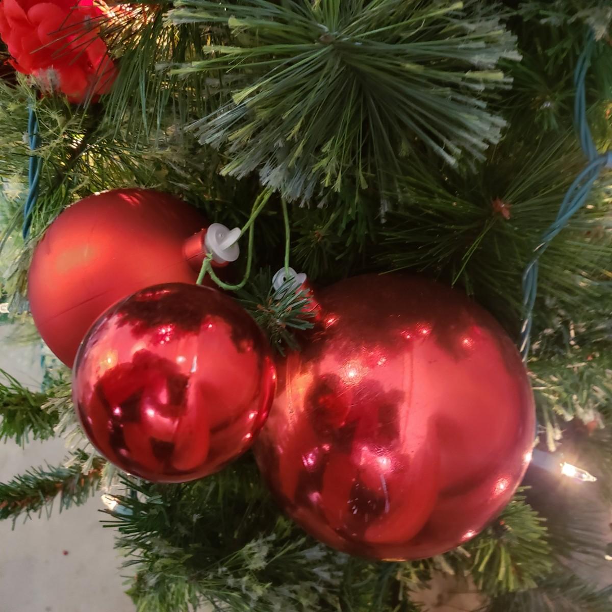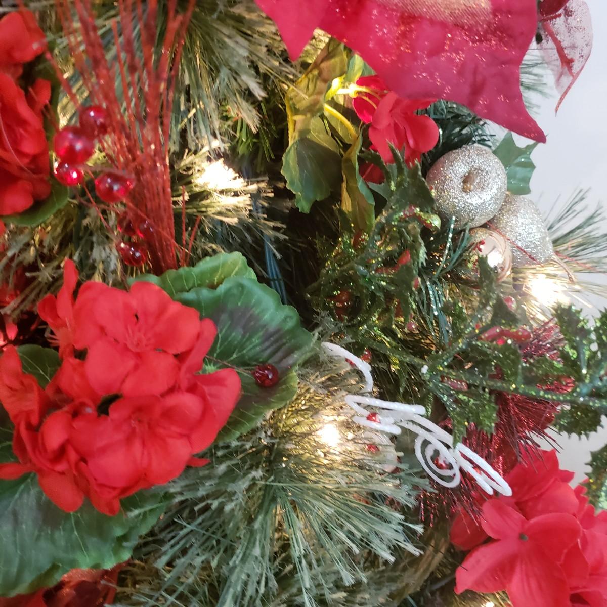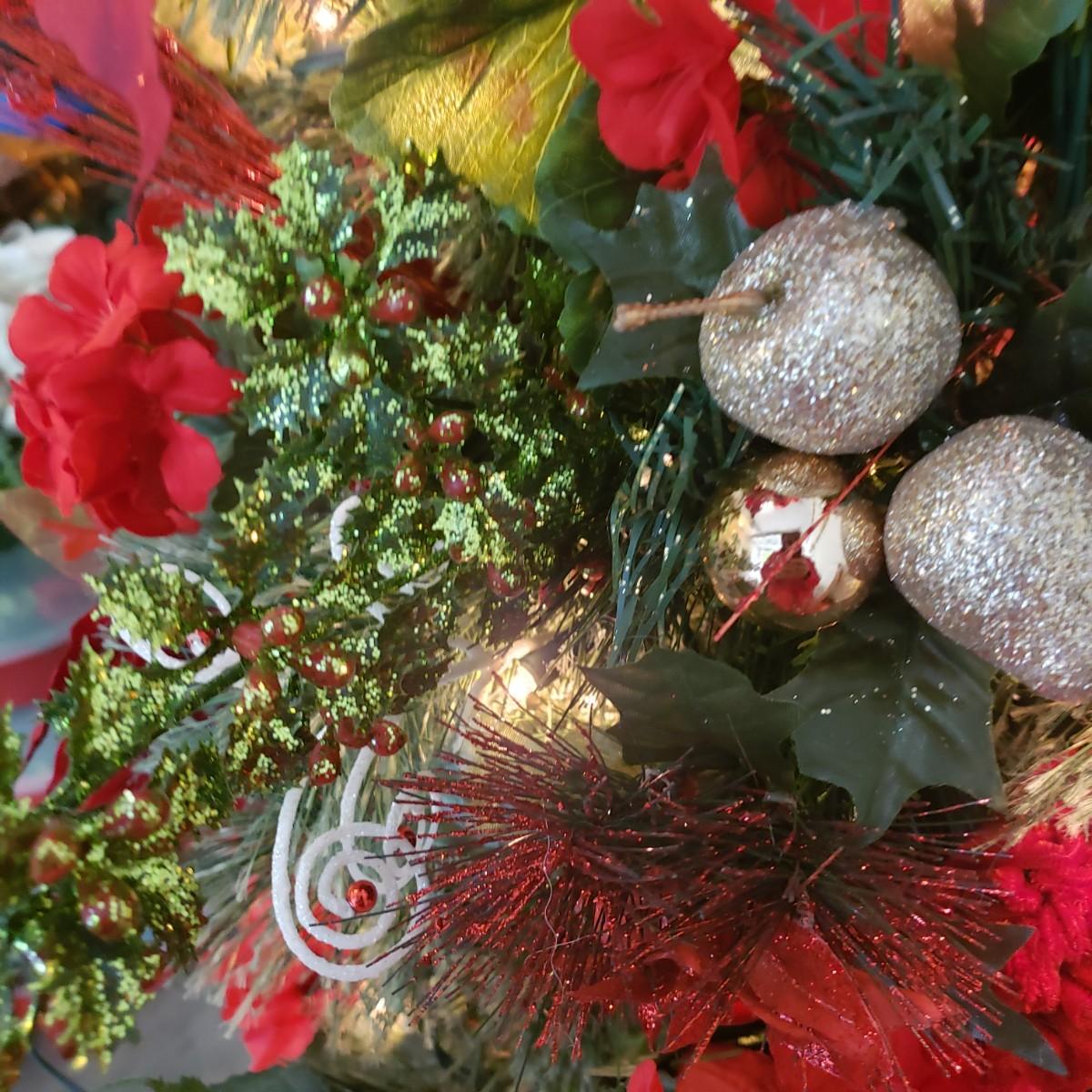 This lot features two 6'6" decorated Christmas trees. The trees are slender, roughly 15"D. The red tree lights up when plugged in. The musical ribboned tree does not have lights. Each are on a squared metal base, see pictures. Both trees come apart halfway up. Because the lights are on the red tree, we did not picture it taken apart.