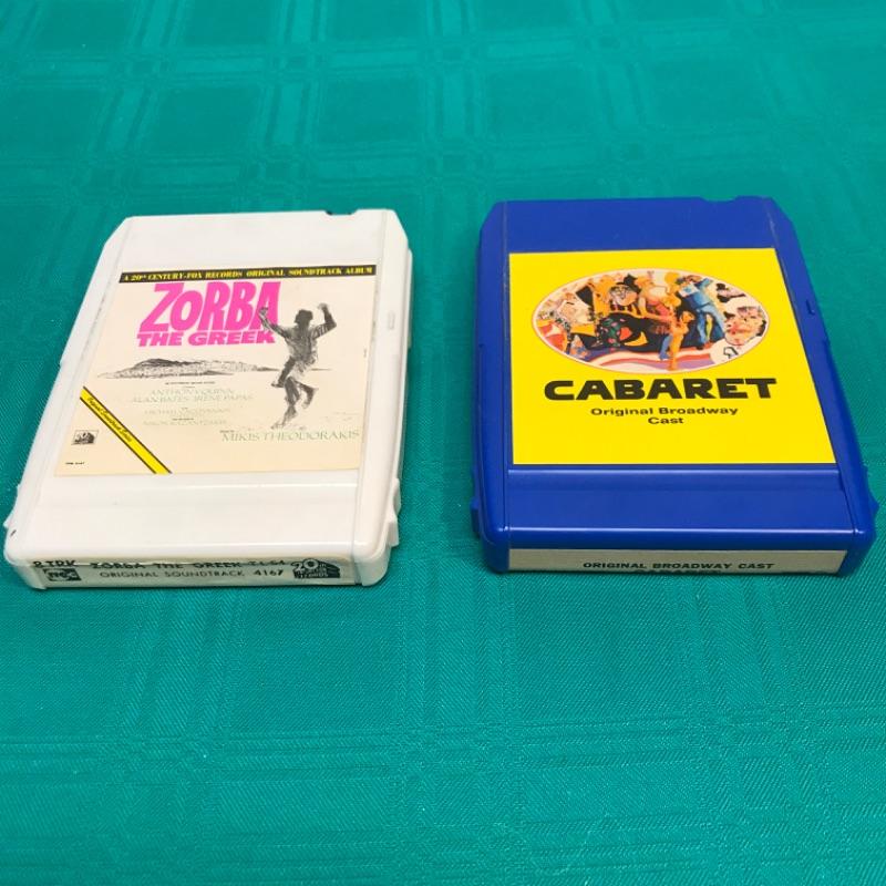 Lot includes two vintage eight-track cassettes with original cardboard sleeves. What is the motion picture score for 20th Century Fox’s Zorba The Greek. The other is for songs from the Broadway production of Cabaret. These are being sold as collectors items as we have no way of testing them.