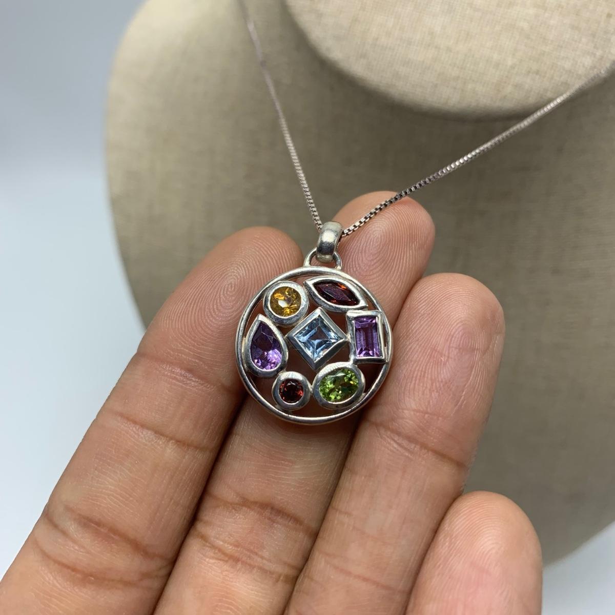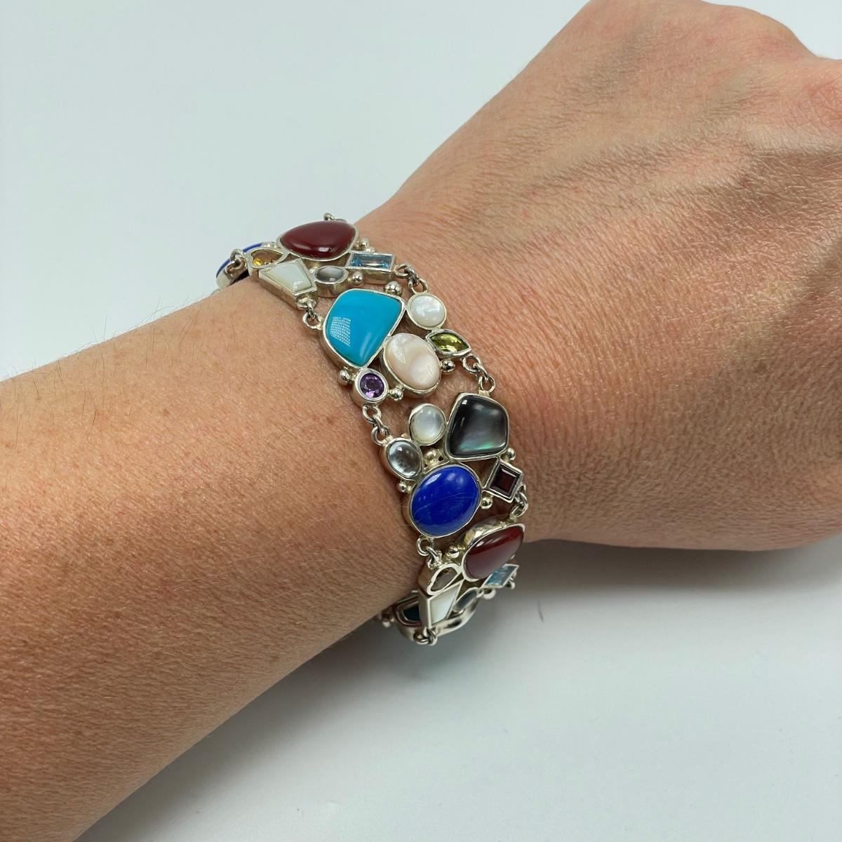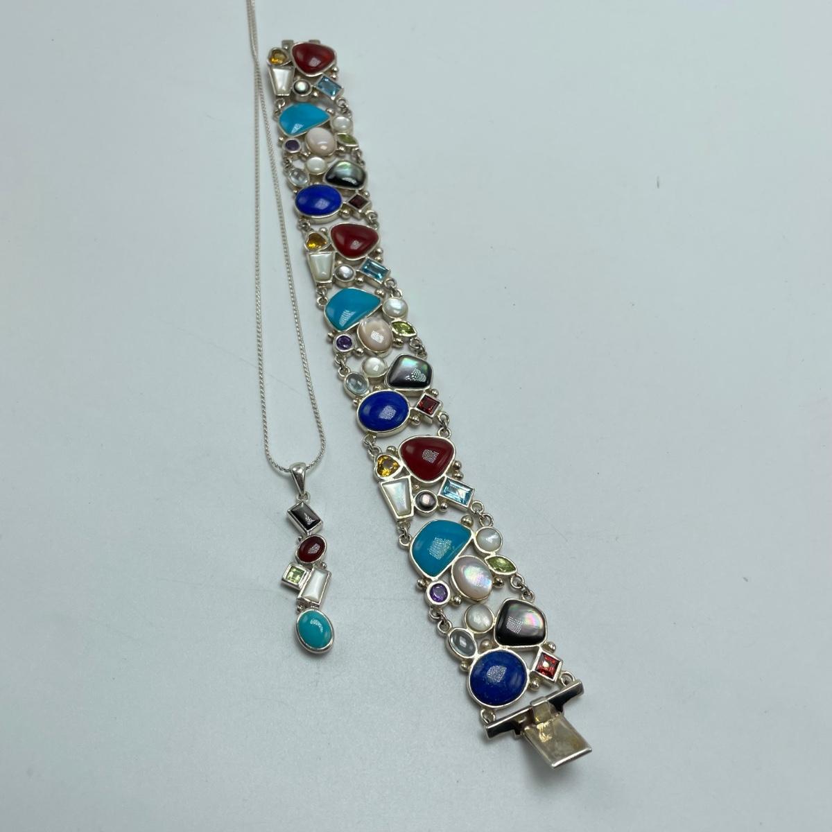 Two Multicolored Gem Stone sets with cuff-style bracelet, bracelet with clasp, size 9 ring, and two necklaces. One matching set includes necklace, ring, and cuff bracelet. Other matching set includes necklace and bracelet with clasp. Necklace chains measure approximately 18” long and bracelet with clasp measures, 7.5”. All items are stamped 925, some have additional markings. All sales are final. No returns or refunds. Please bid accordingly.